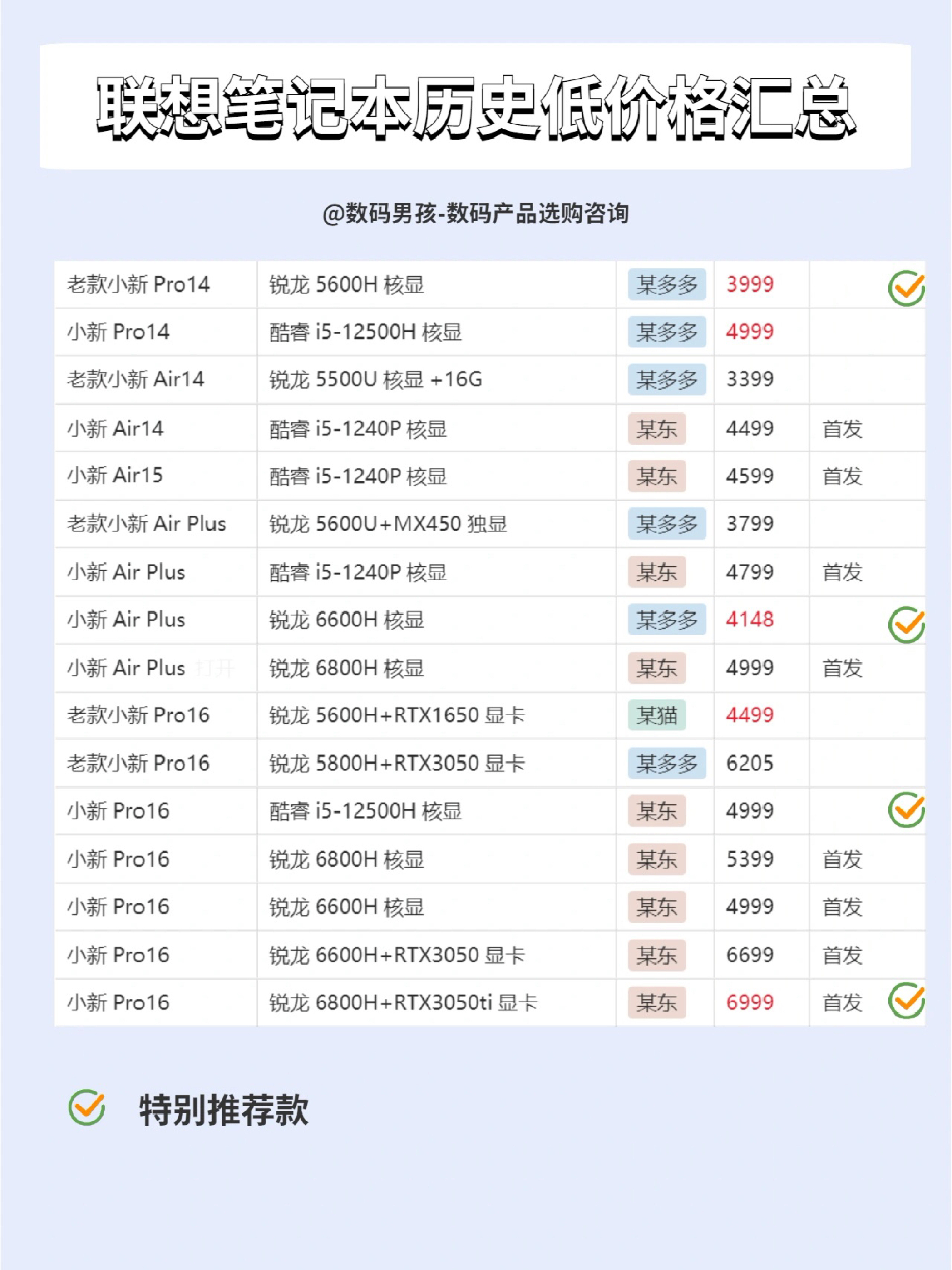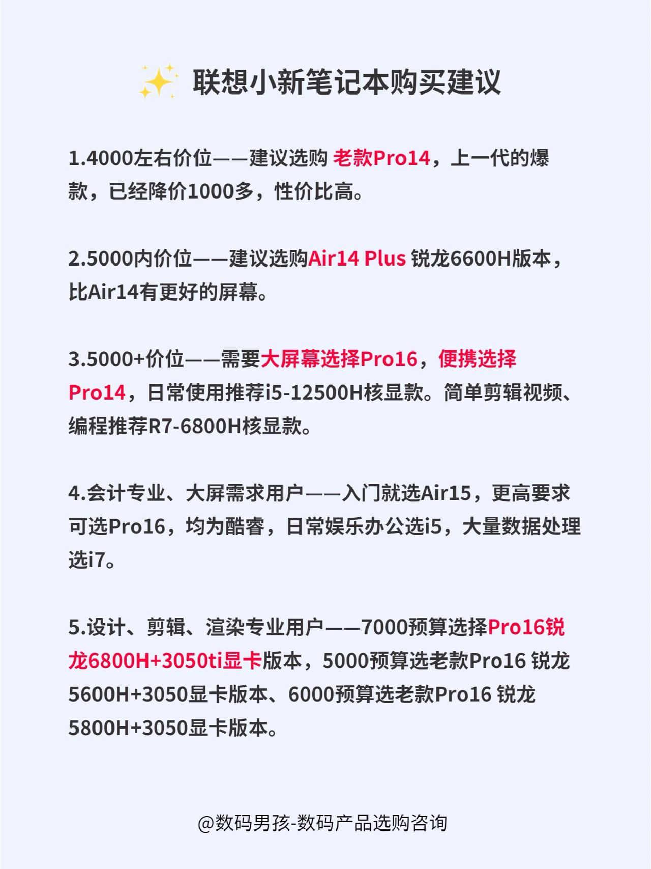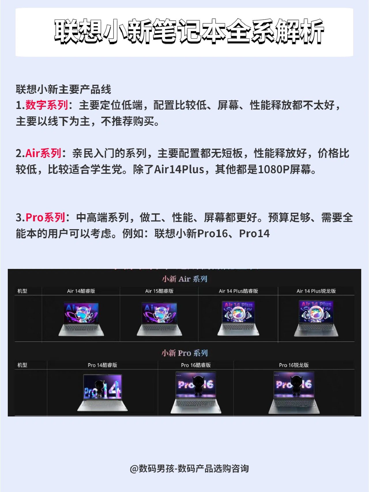 大家好,这里是数码男孩晨暮,一个10年数码控。今天来给大家汇总一下联想小新笔记本。 具体产品价格汇总、产品解析大家可以看图~ 购买建议 1.4000左右价位——建议选购 老款Pro14,上一代的爆款,已经降价1000多,性价比高。 2.5000内价位——建议选购Air14 Plus 锐龙6600H版本,比Air14有更好的屏幕。 3.5000+价位——需要大屏幕选择Pro16,便携选择Pro14,...
