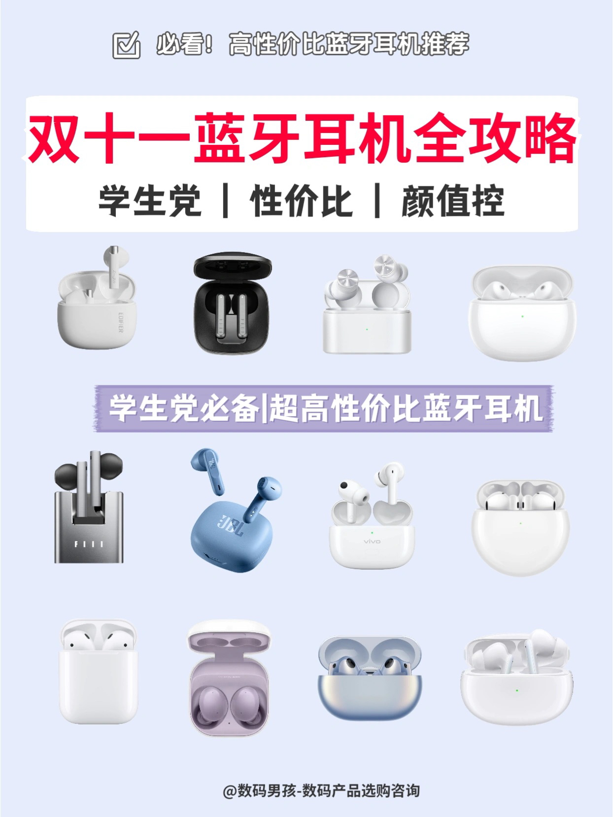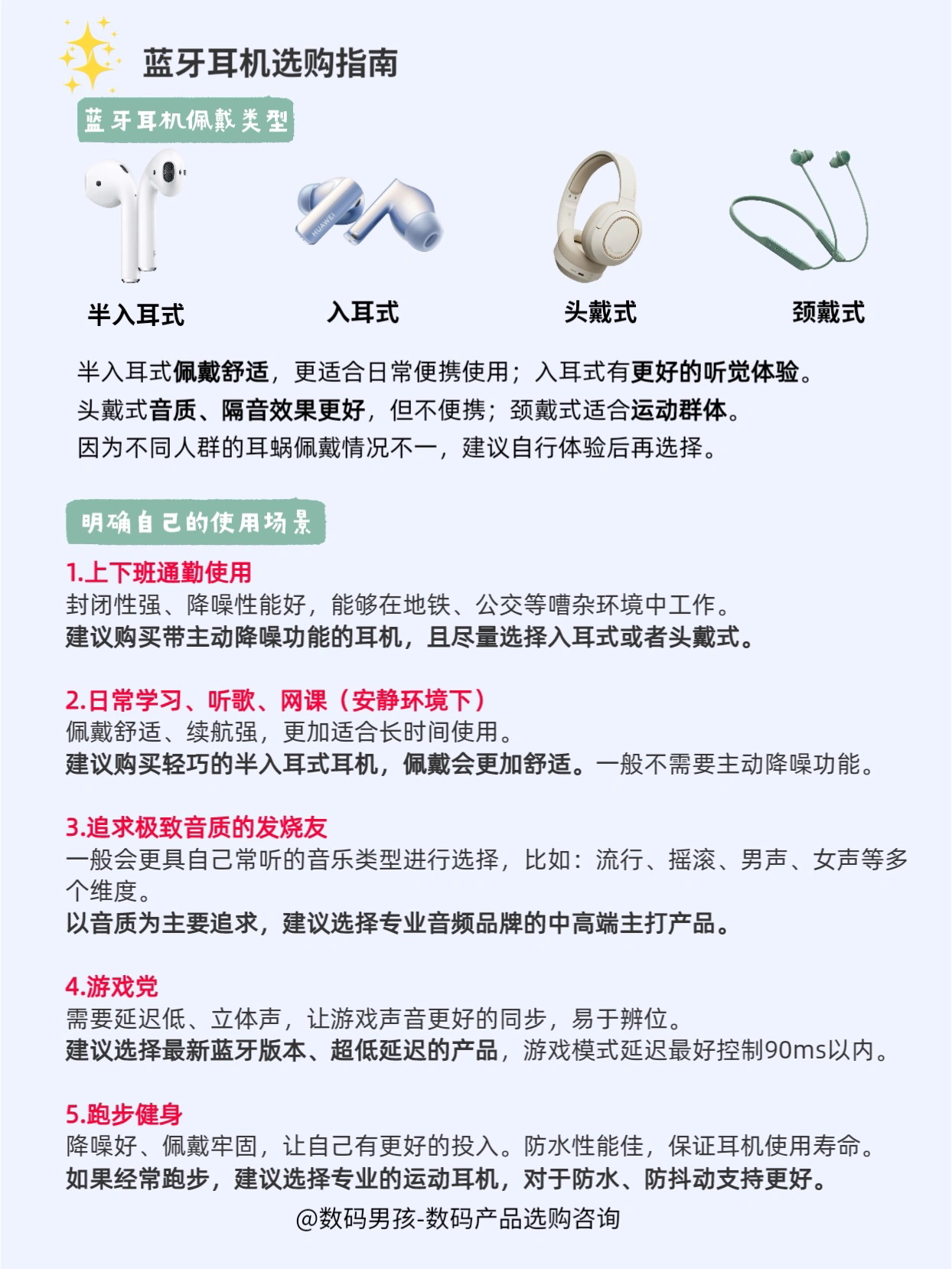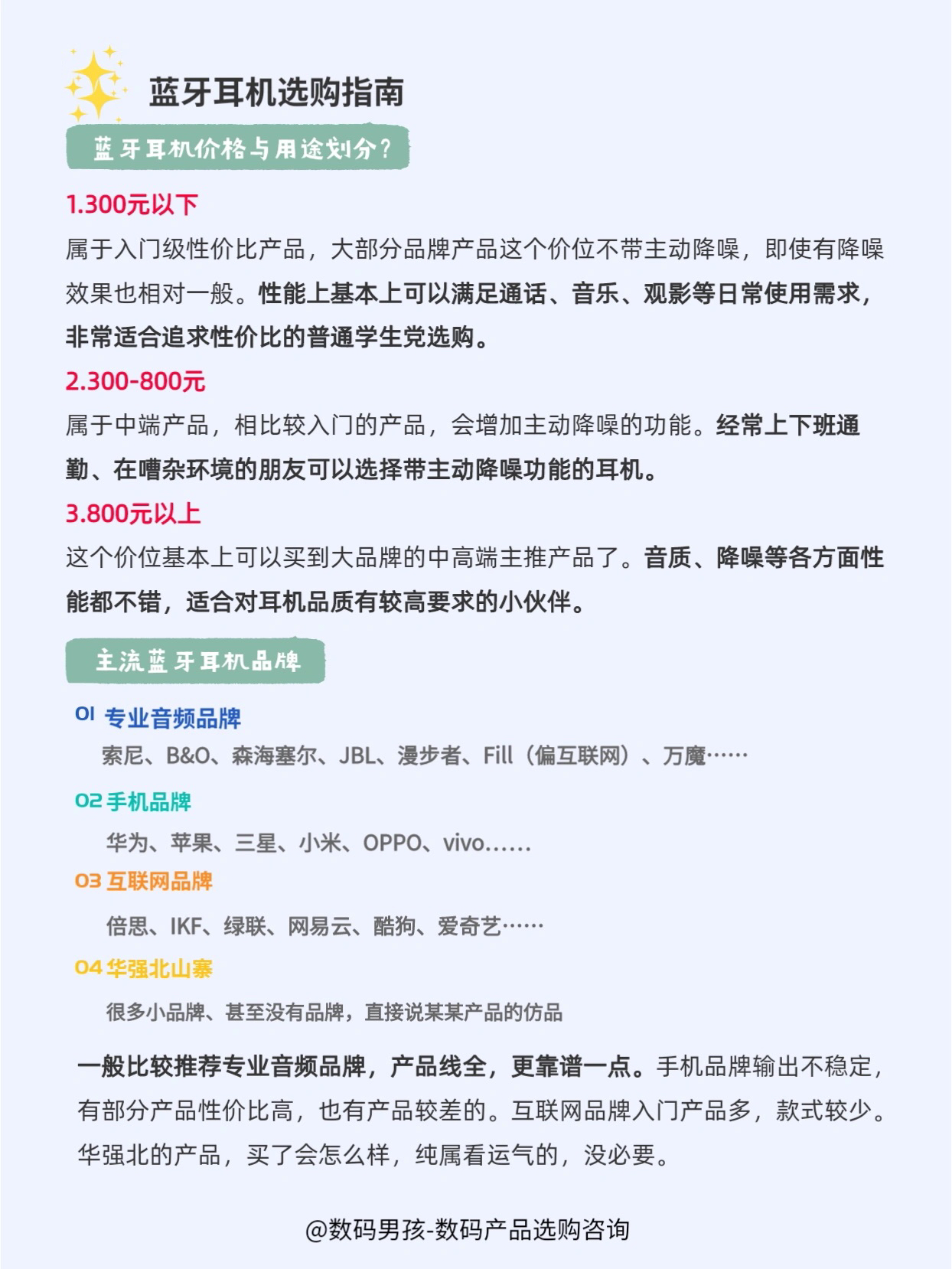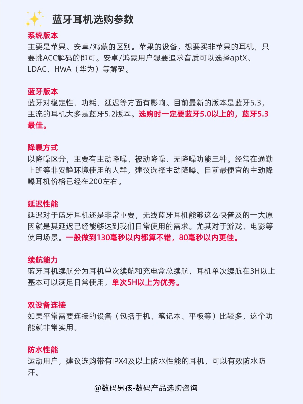 大家好,这里是数码男孩晨暮,一个10年数码控,双十一马上到了,很多小伙伴想要购买蓝牙耳机。 今天给大家盘点一下值得购买的蓝牙耳机。大家可以先看一下以下选购参数! 👉🏻一、品牌选择 一般分为专业音频品牌、手机品牌、互联网品牌等 比较推荐专业音频品牌,产品线全,更靠谱一点。 👉🏻二、佩戴方式 半入耳式佩戴舒适,更适合日常便携使用;入耳式有更好的听觉体验。 头戴式音质、隔音效果更好,但不便携;颈戴式适合...