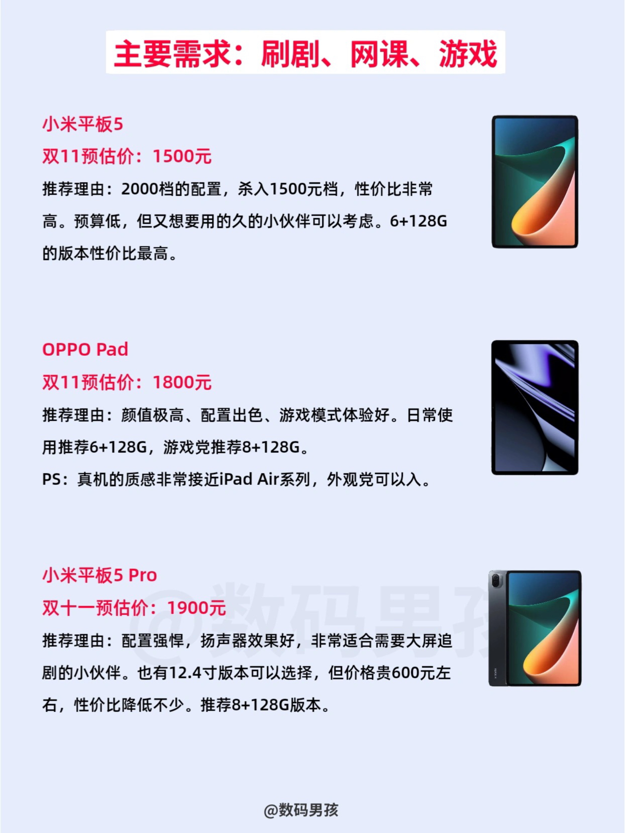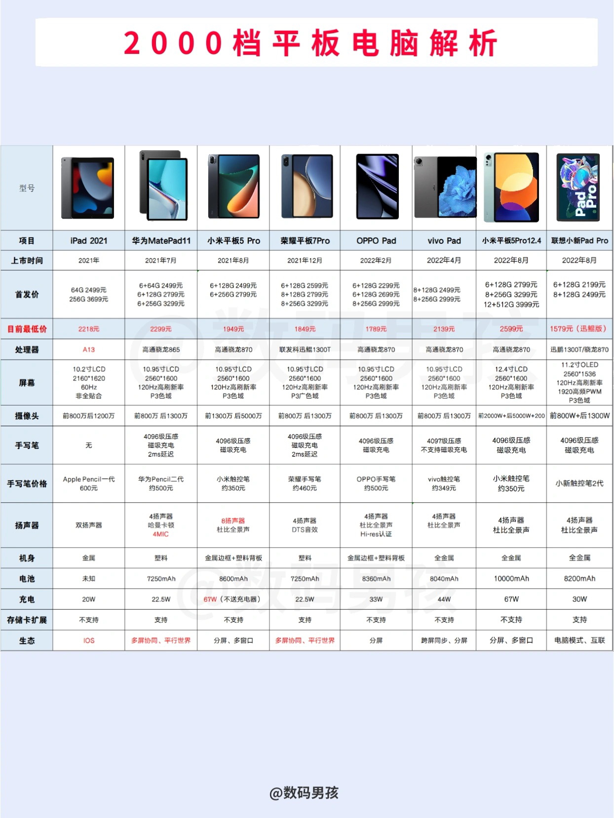 大家好这里是数码男孩晨暮,一个10年数码控。 很多小伙伴催我出平板电脑攻略,今天就给大家更新2000档平板电脑选购建议。我根据不同需求做了推荐,且每款产品都标注了目前最低价格、双十一预测价格。 (PS:这次预测价格写的还是比较保守,期待更低价,后续我会给大家跟进) 主要需求为学习、笔记等生产力的小伙伴看这里!!! 荣耀V7 Pro 双11预估价:1800元 推荐理由:华为MatePad 11的...