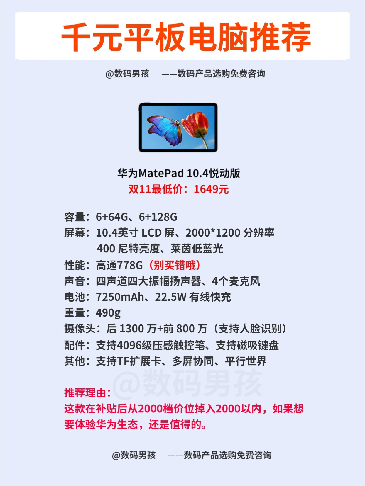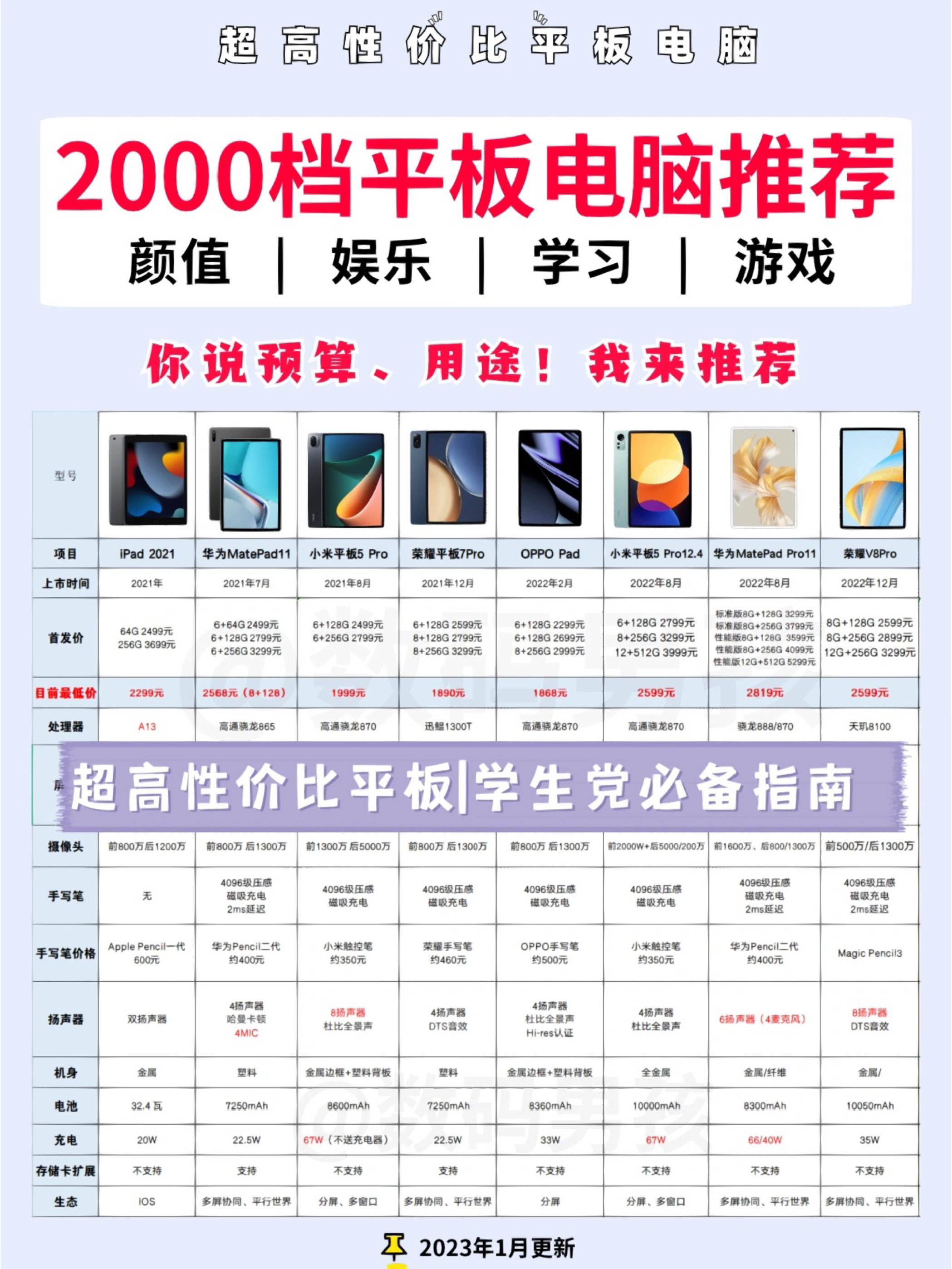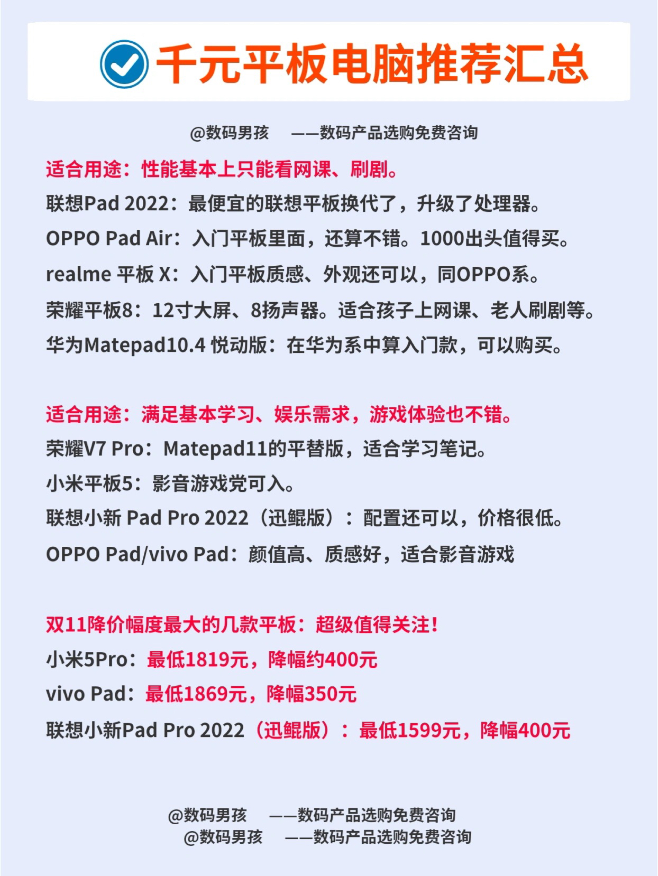 大家好这里是数码男孩晨暮,很多小伙伴问我千元平板电脑电脑怎么选? 其实现在千元平板电脑也有很不错的,如果主要看剧、网课,完全可以作为iPad的平替,效果一点也不差。今天给大家盘点,并且附上双11底价。 ~~ PS:好几款平板电脑降幅真的超级大~预算有限的小伙伴一定不要错过! ~~~ 一、推荐指南 适合用途:性能基本上只能看网课、刷剧。 联想Pad 2022:最便宜的联想平板换代了,升级了处理器。 ...