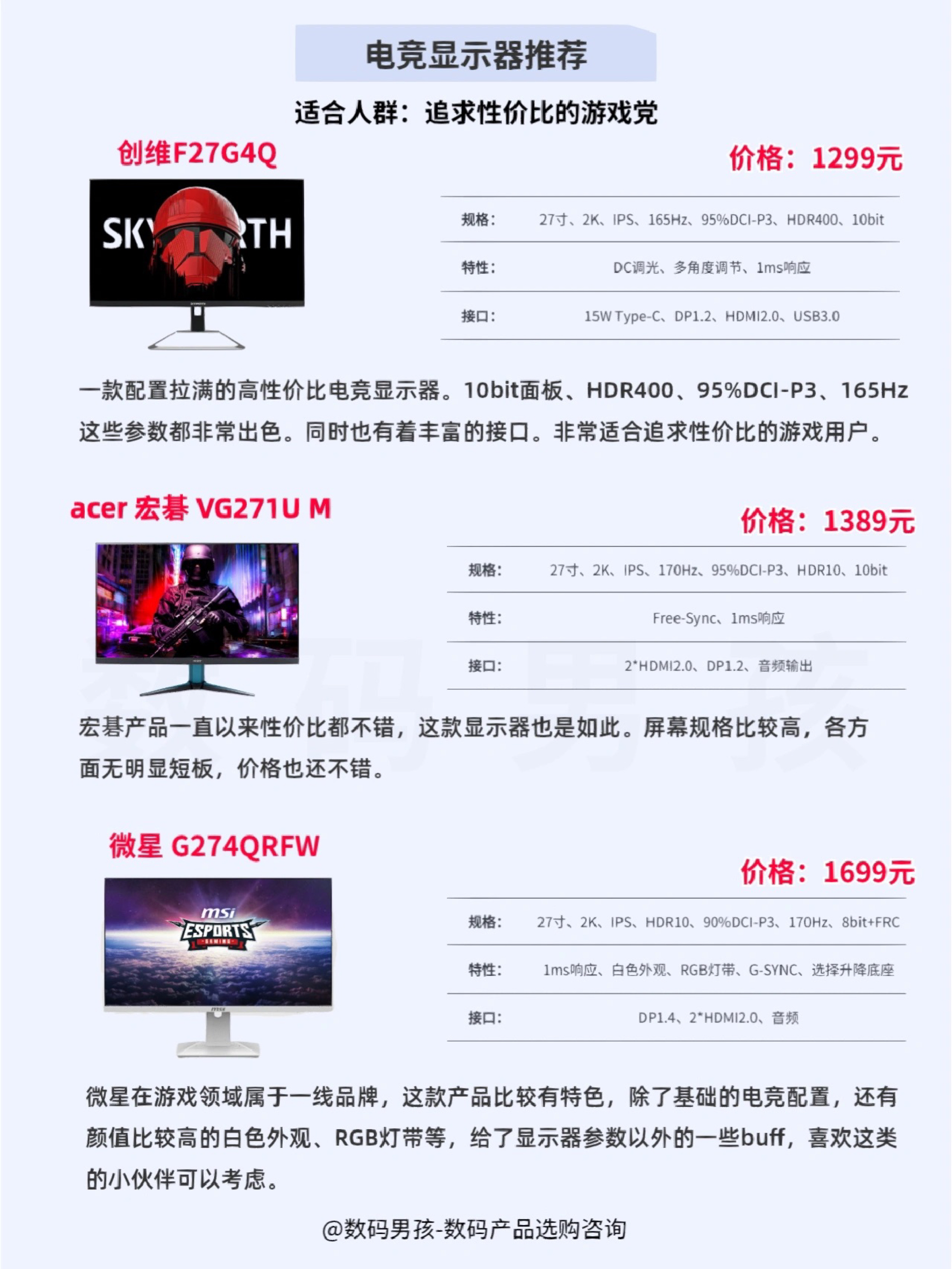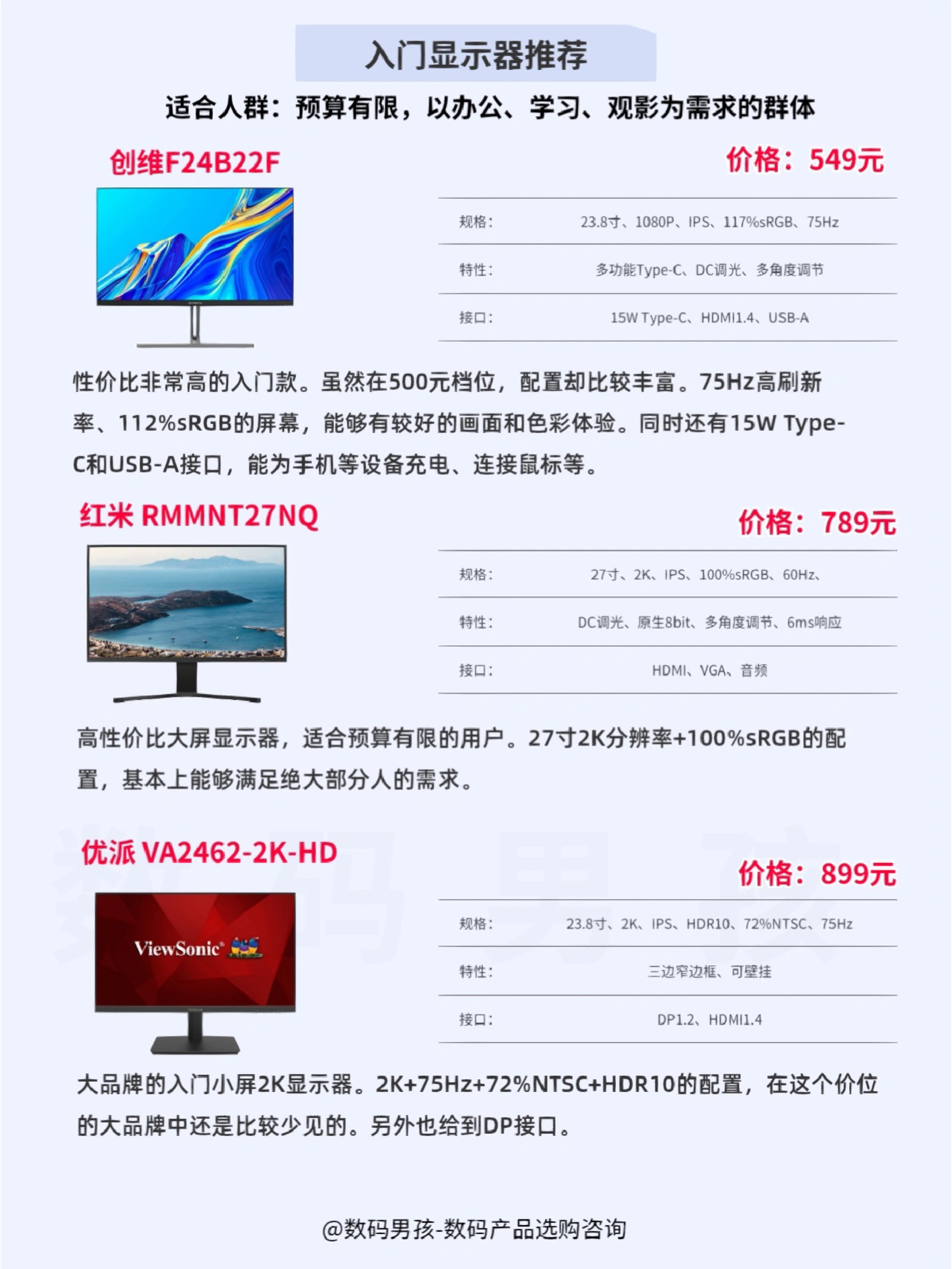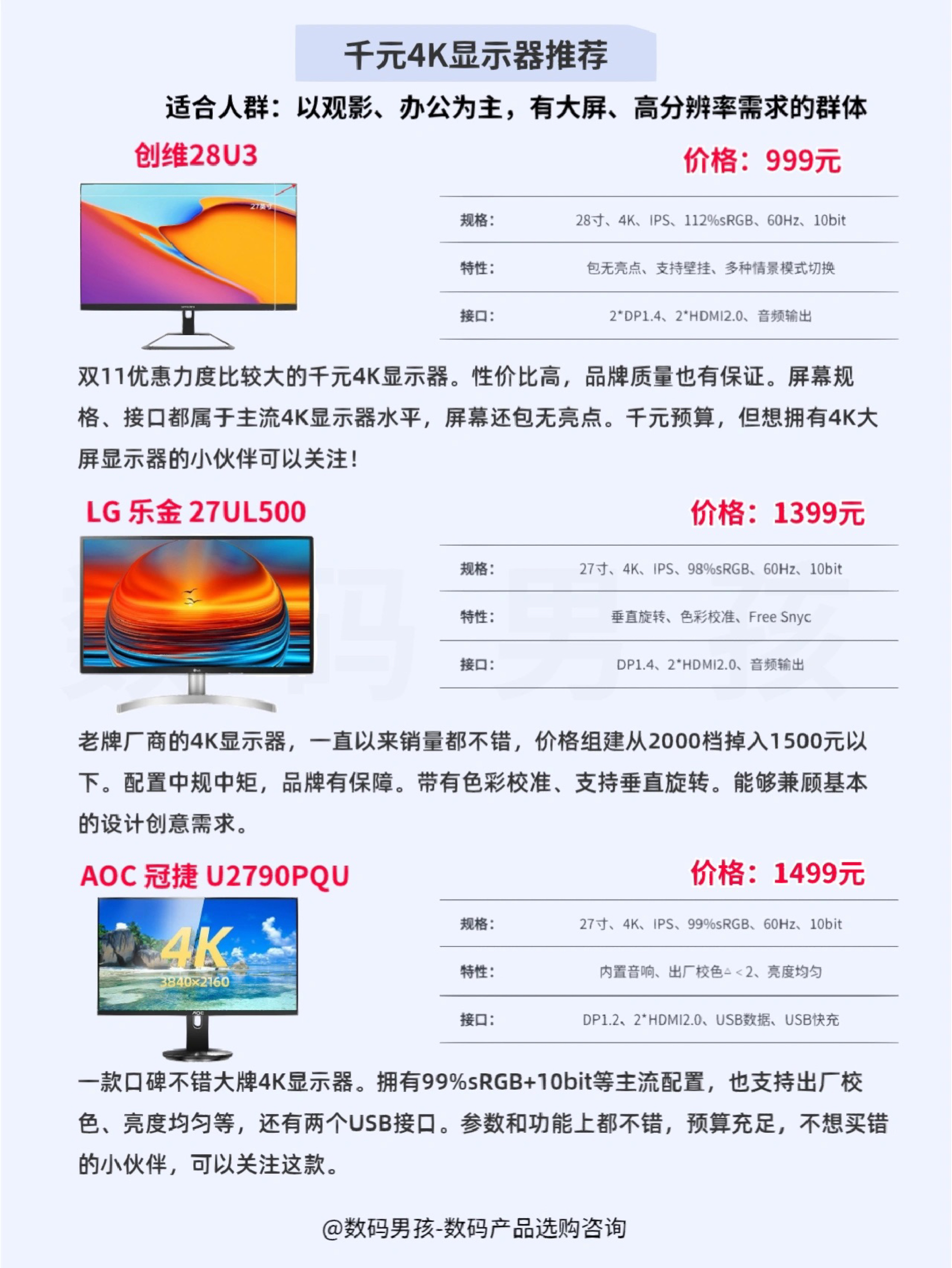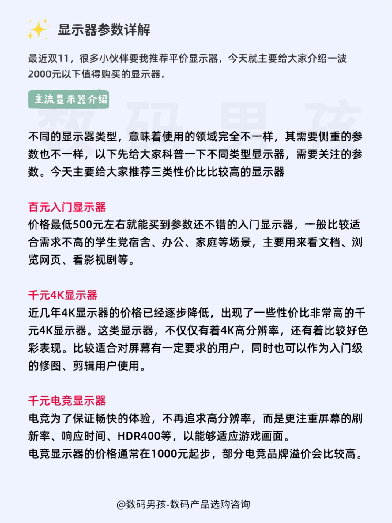 大家好这里数码男孩晨暮,一个10年数码控,之前给大家推荐了一期显示器,现在双十一到了,很多小伙伴希望我多推荐平价的、高性价比显示器,今天就给大家整理了2000元以下值得购买的显示器产品。 -- 一、显示器的类型用途 百元入门显示器 价格最低500元左右就能买到参数还不错的入门显示器,一般比较适合需求不高的学生党宿舍、办公、家庭等场景,主要用来看文档、浏览网页、看影视剧等。 千元4K显示器 近几...