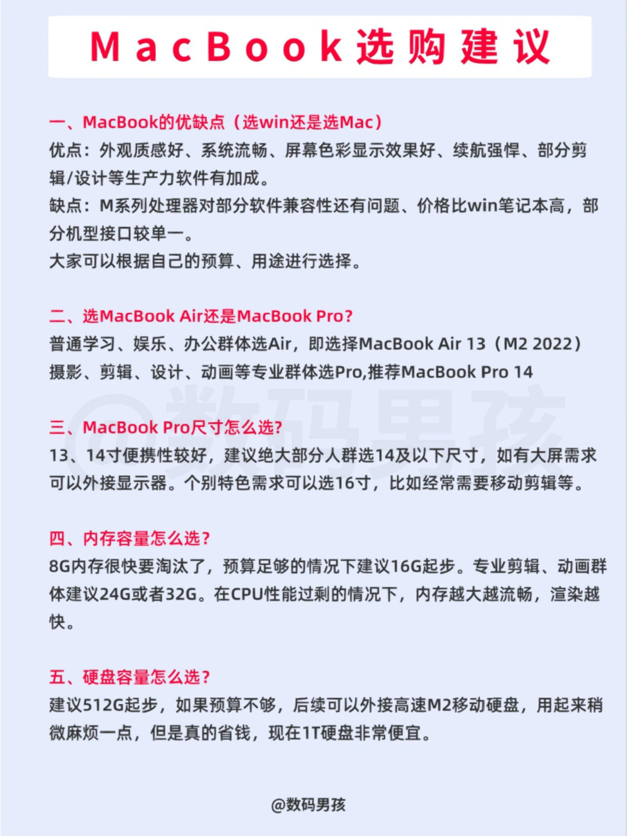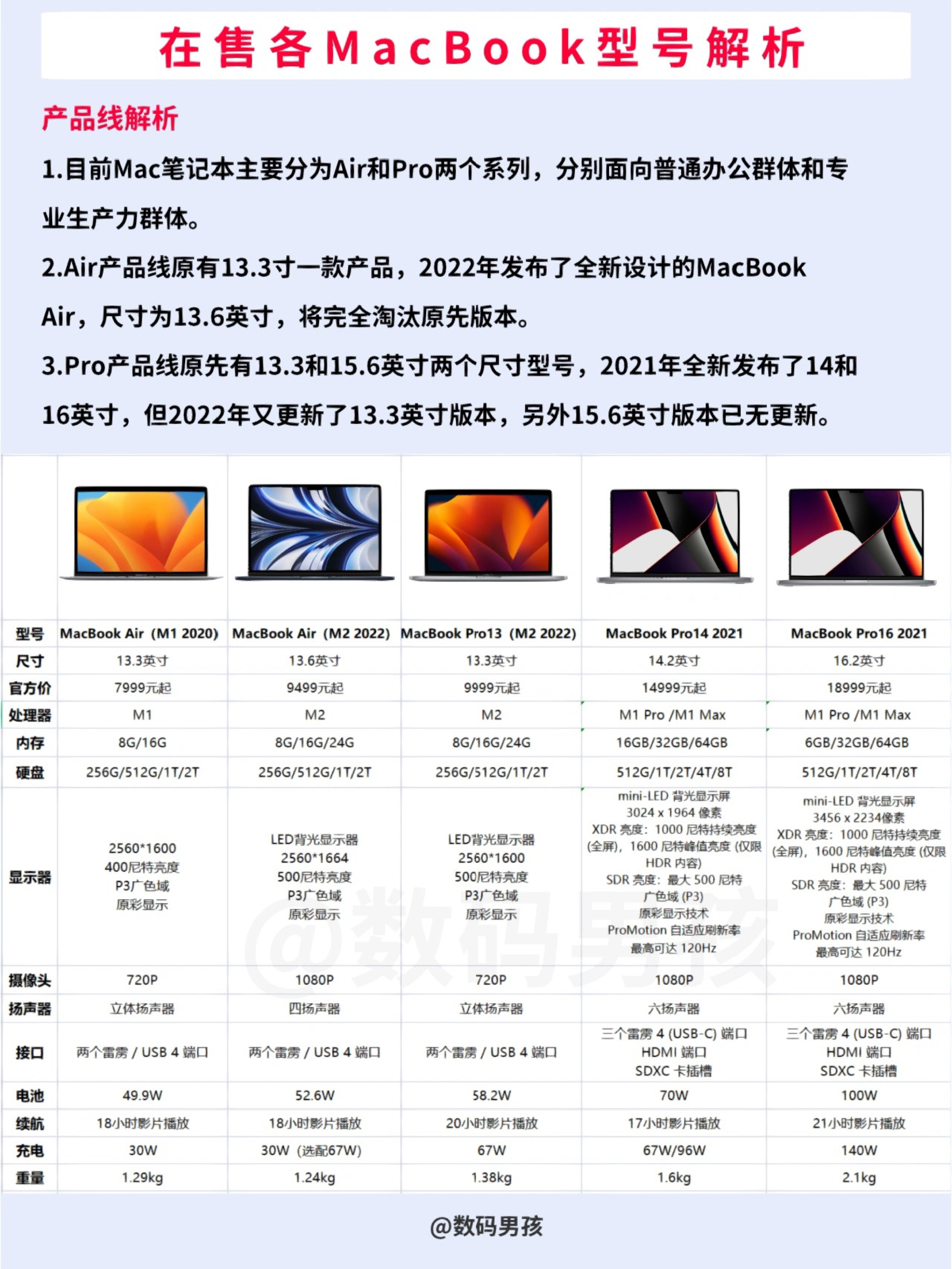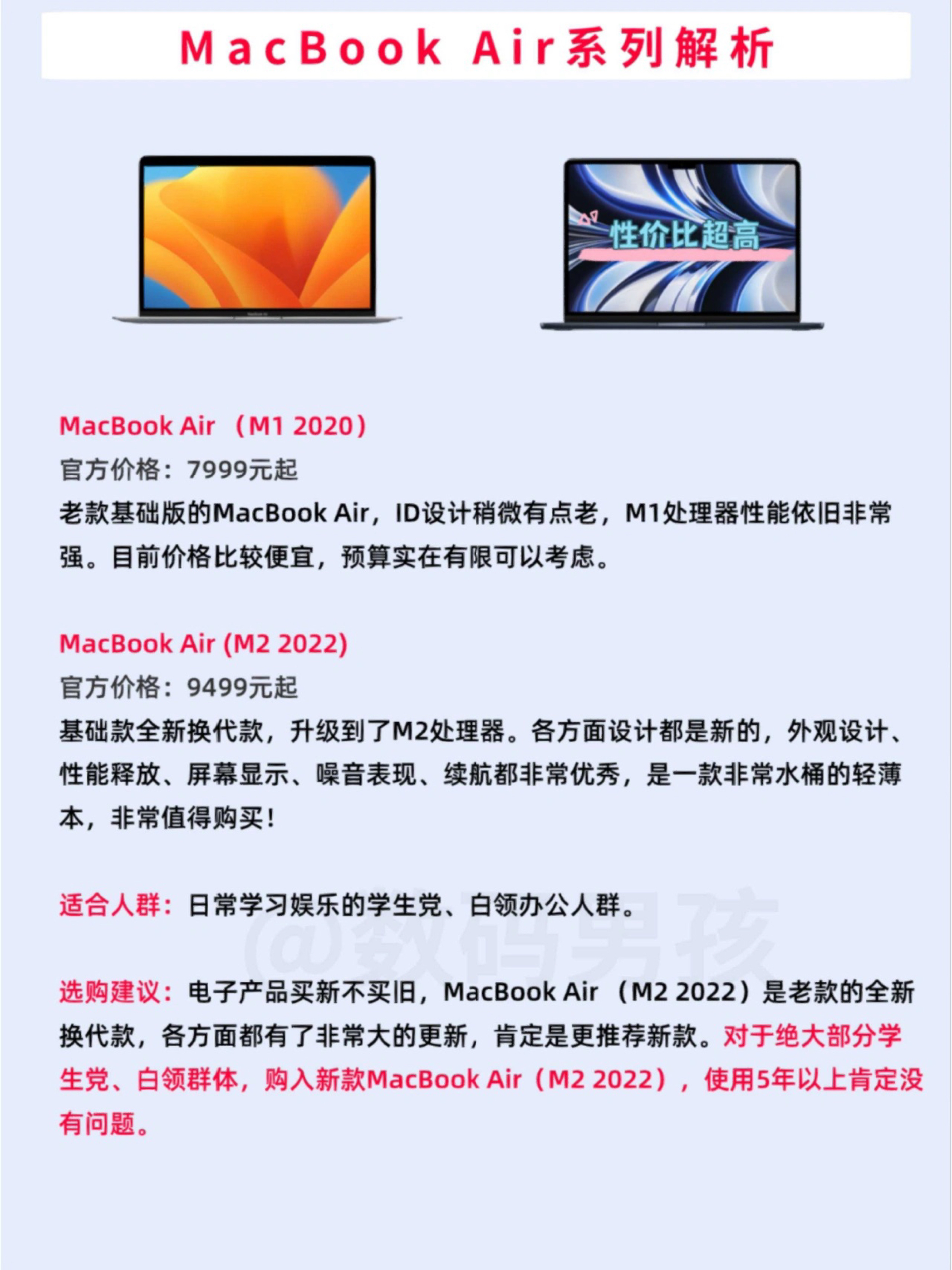很多小伙伴为了省心,会选择苹果MacBook笔记本。 今天我就给大家全面得解析一下MacBook笔记本的购买! 一、Air系列产品 MacBook Air (M1 2020) 官方价格:7999元起 MacBook Air (M2 2022) 官方价格:9499元起 适合人群:日常学习娱乐的学生党、白领办公人群。 选购建议:电子产品买新不买旧,MacBook Air (M2 2022)是老款的全新...