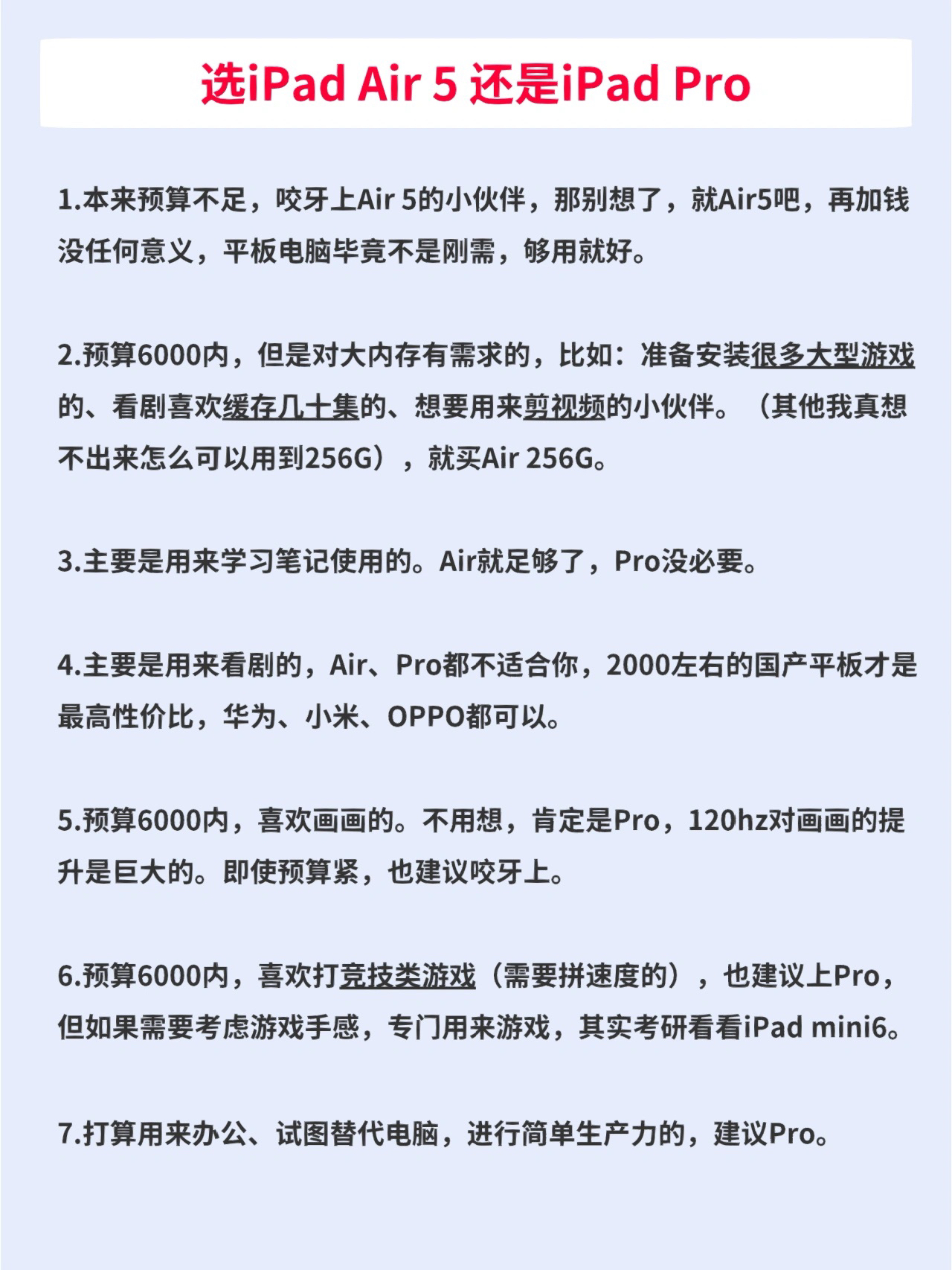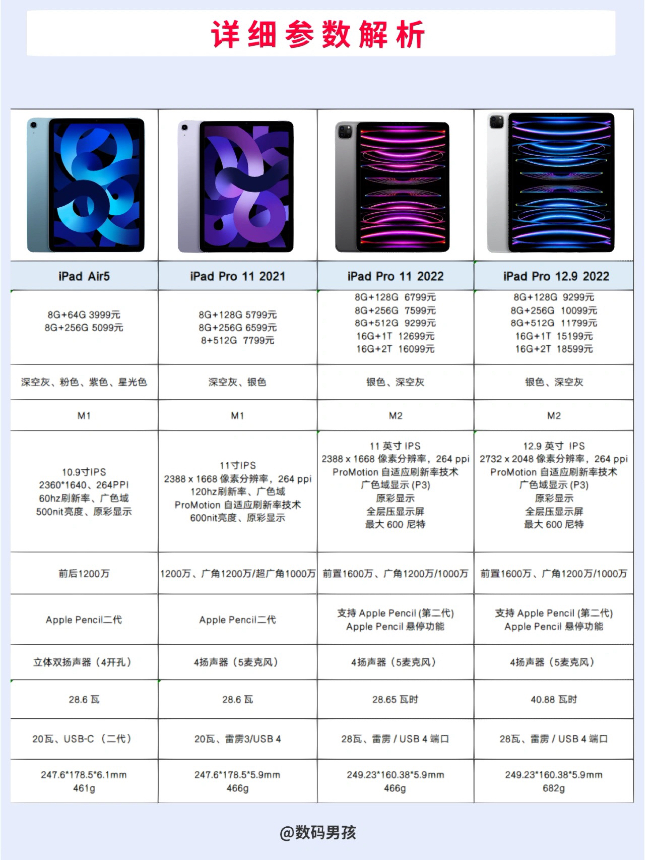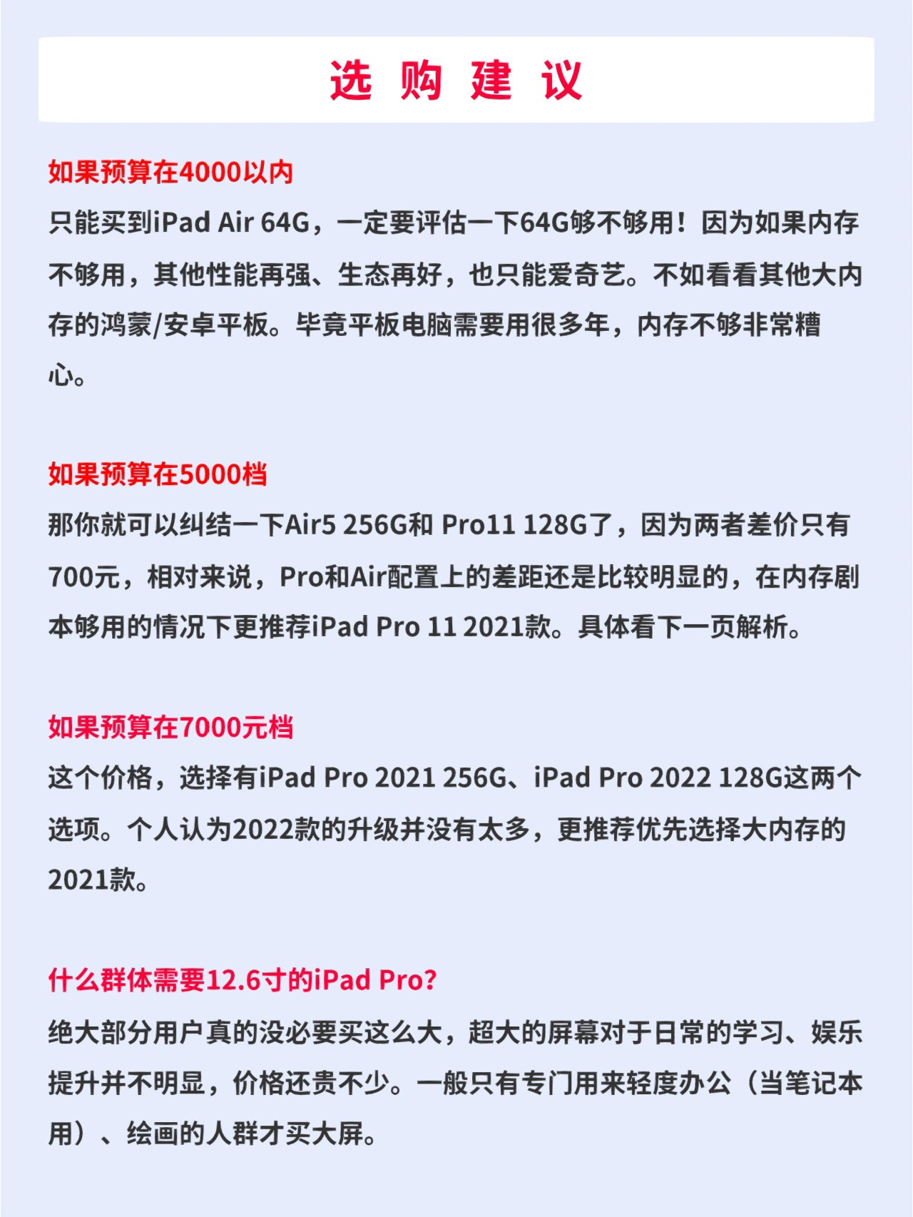 由于iPad Air5涨价,很多小伙伴开始纠结iPad Air5和iPad Pro怎么选?今天就给大家详细解析一下Air5和几款Pro的选购。 —— 一、根据价格和尺寸! 1.如果预算在4000以内 只能买到iPad Air 64G,一定要评估一下64G够不够用!因为如果内存不够用,其他性能再强、生态再好,也只能爱奇艺。不如看看其他大内存的鸿蒙/安卓平板。毕竟平板电脑需要用很多年,内存不够非常糟心...