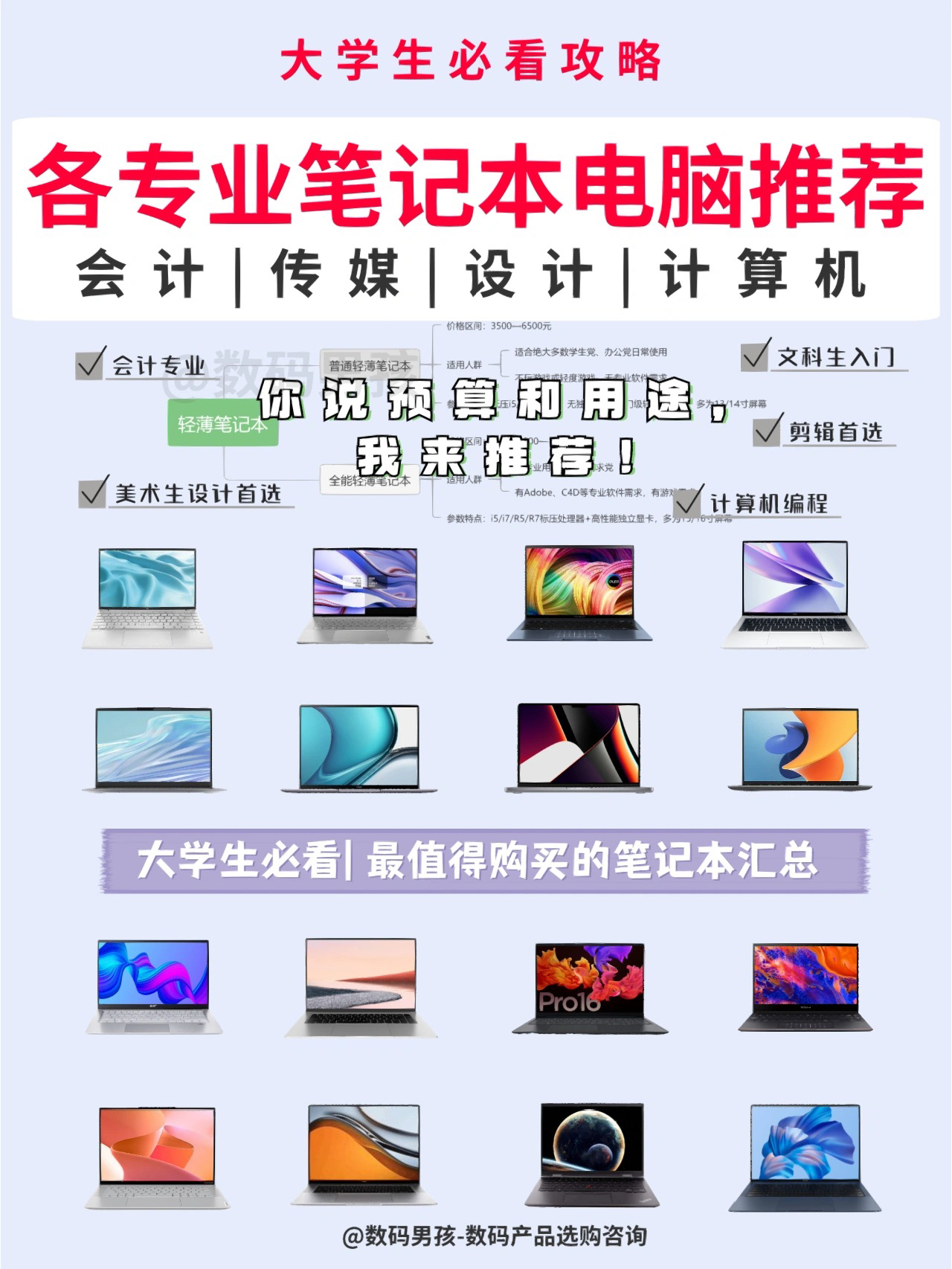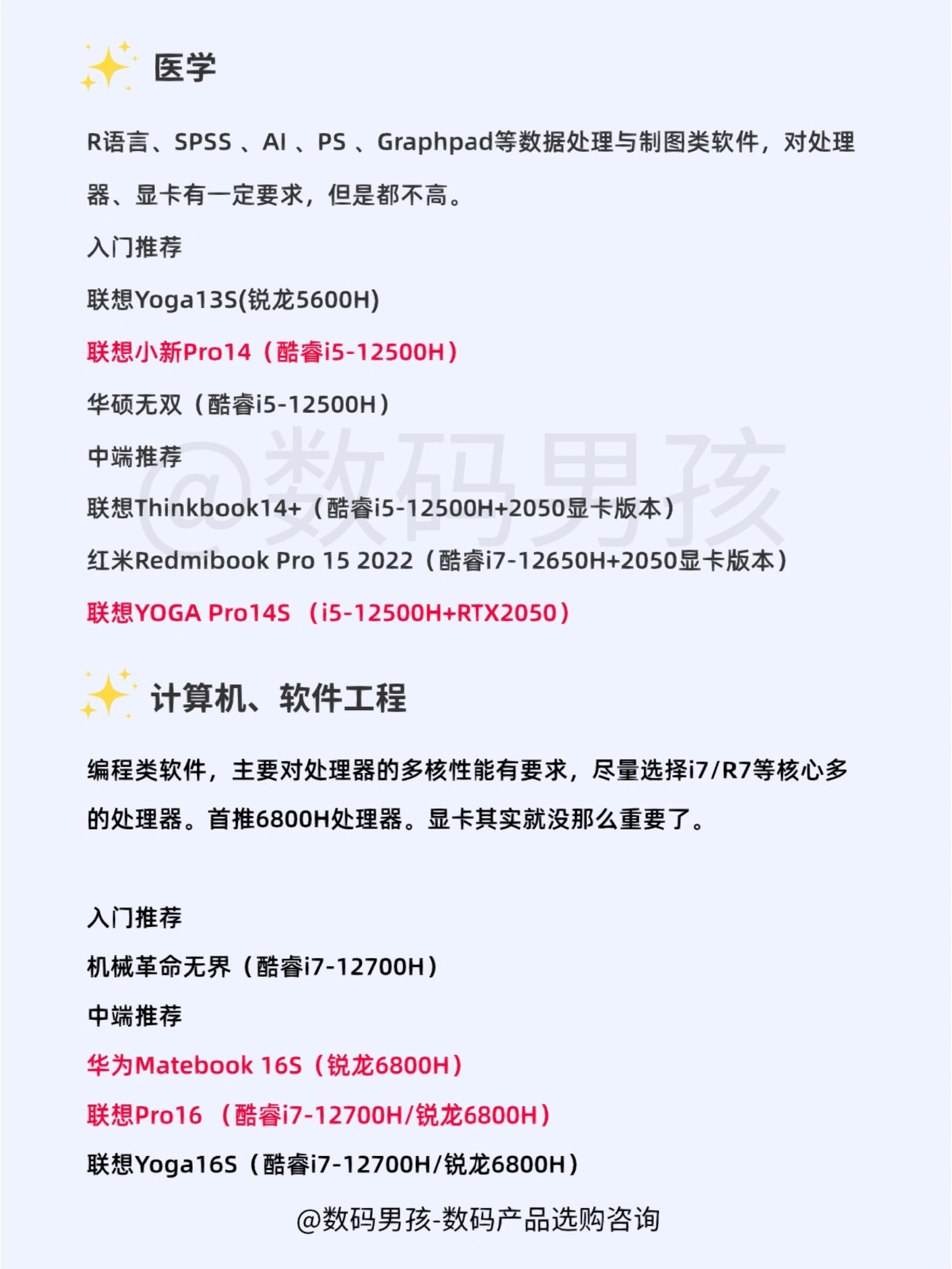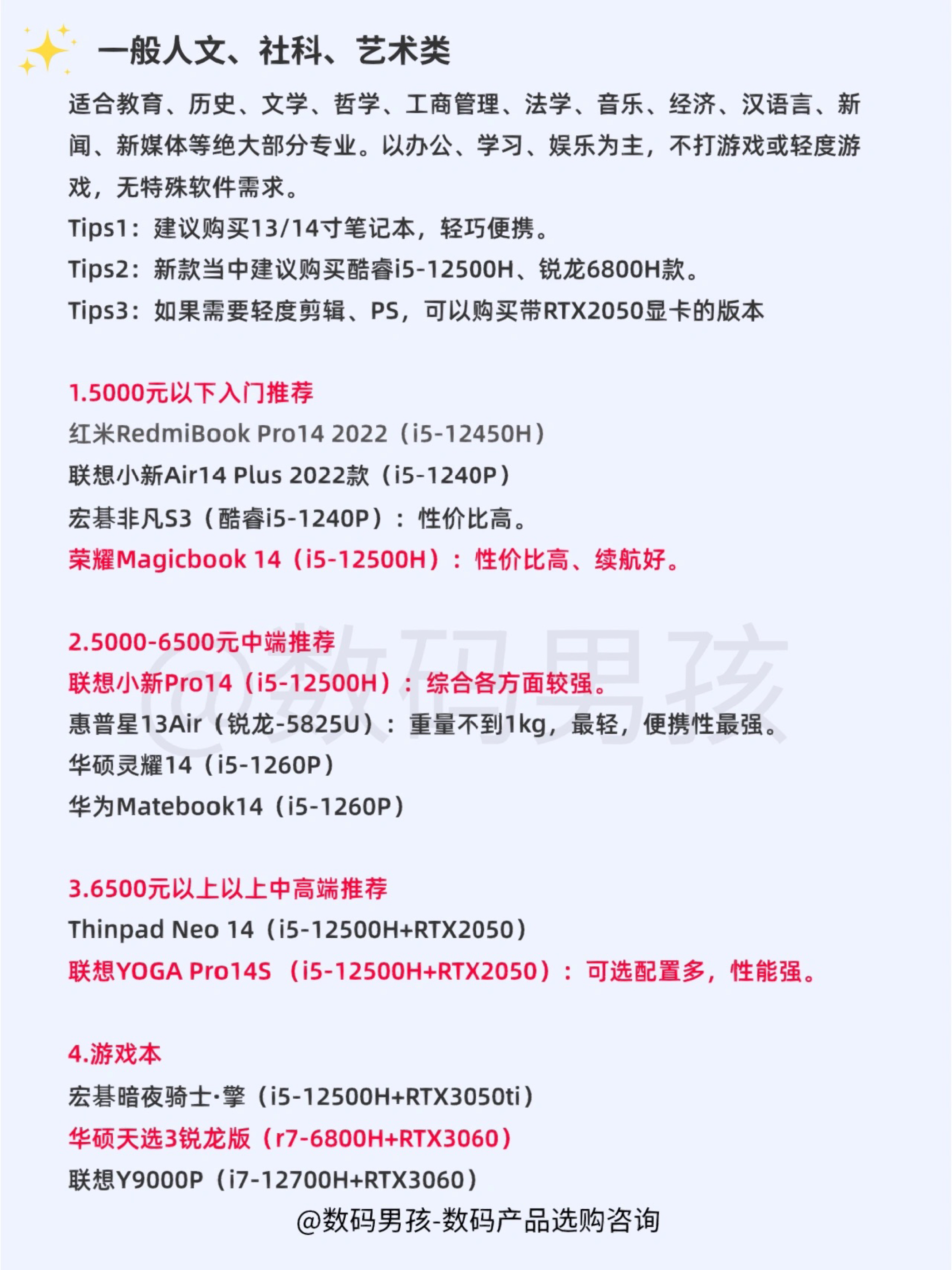 大家好,还是有不少学生党来问我笔记本怎么选?今天再给大家汇总一下各专业的笔记本选购需求! 普通大学专业 适合教育、历史、文学、哲学、工商管理、法学、音乐、经济、汉语言、新闻、新媒体等绝大部分专业。以办公、学习、娱乐为主,不打游戏或轻度游戏,无特殊软件需求。 Tips1:建议购买13/14寸笔记本,轻巧便携。 Tips2:新款当中建议购买酷睿i5-12500H、锐龙6800H款。 Tips3:如果需...
