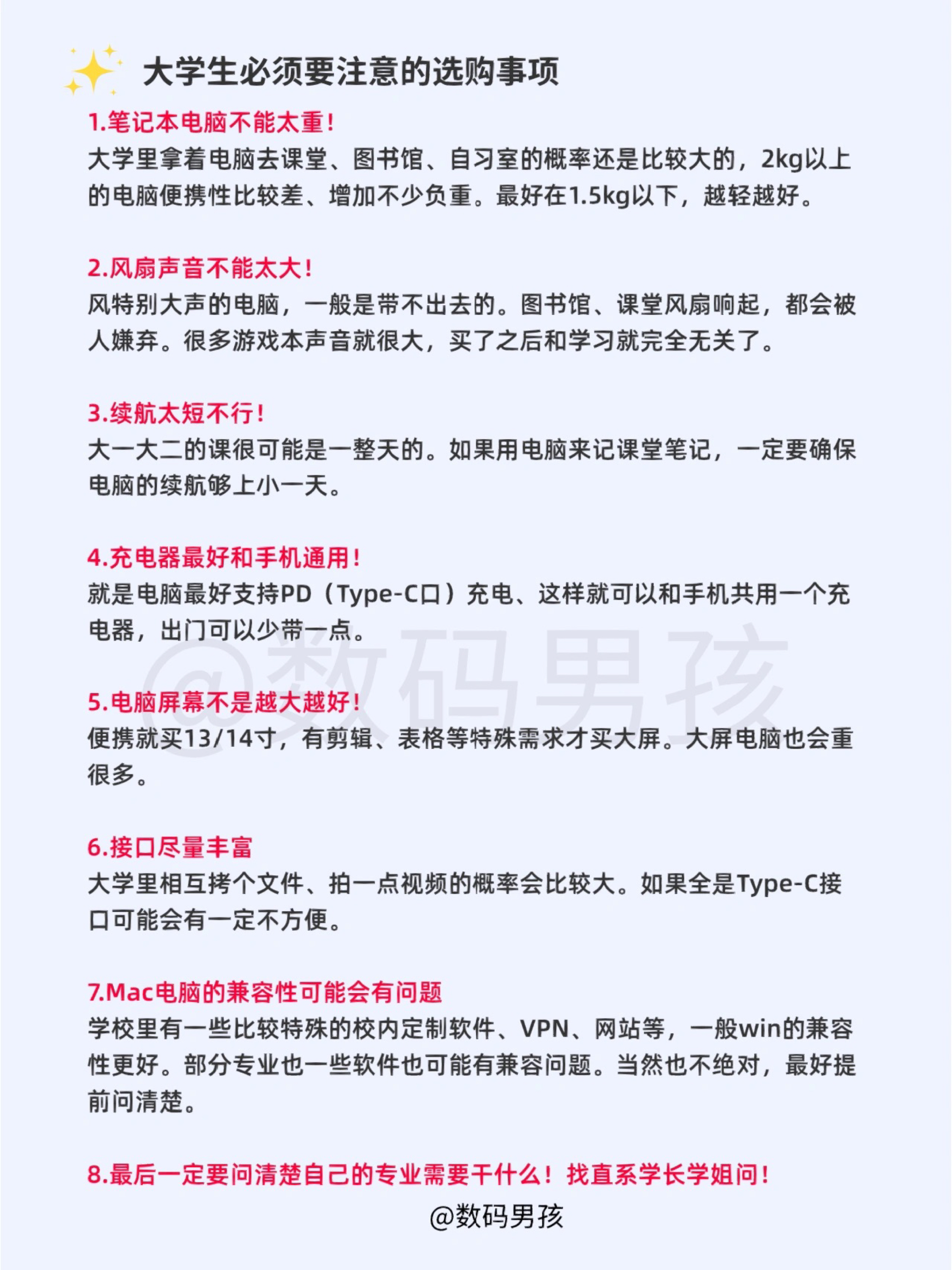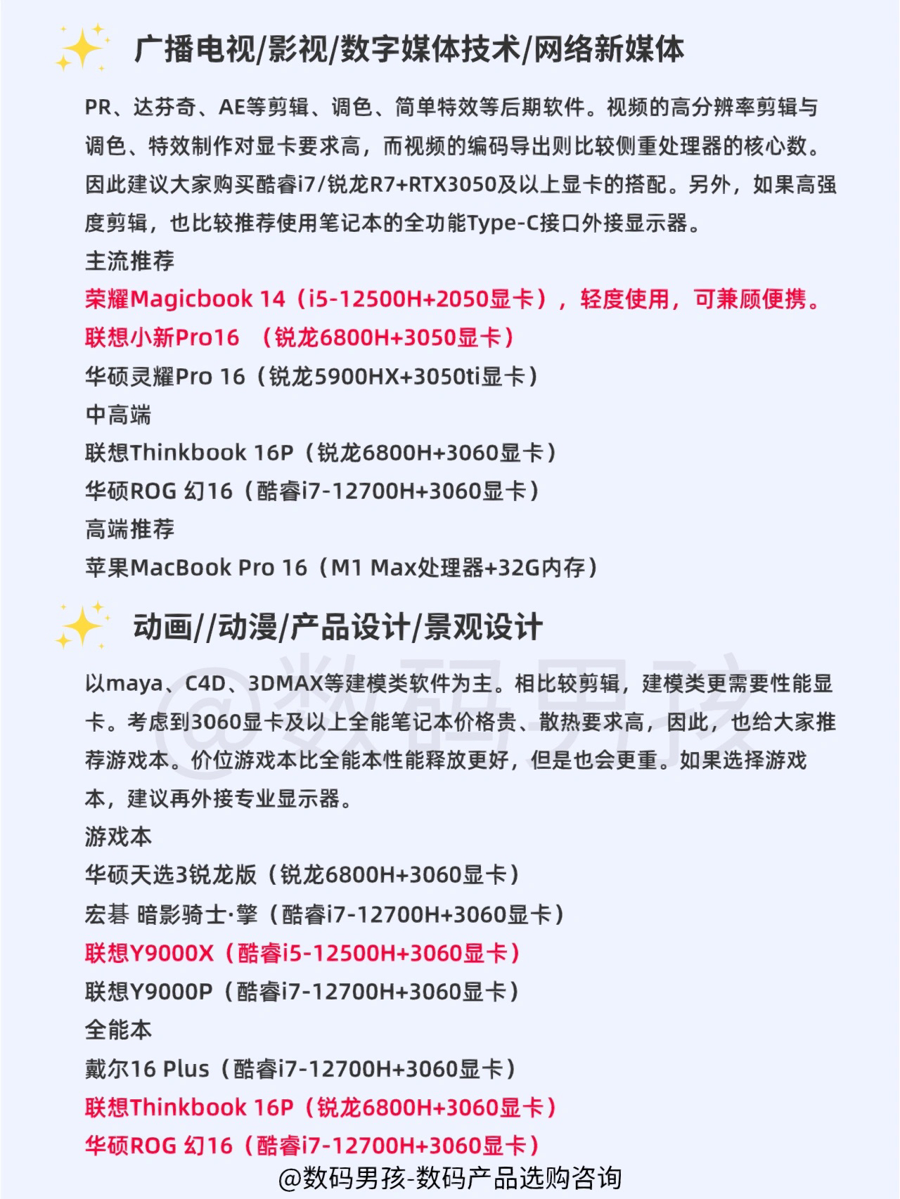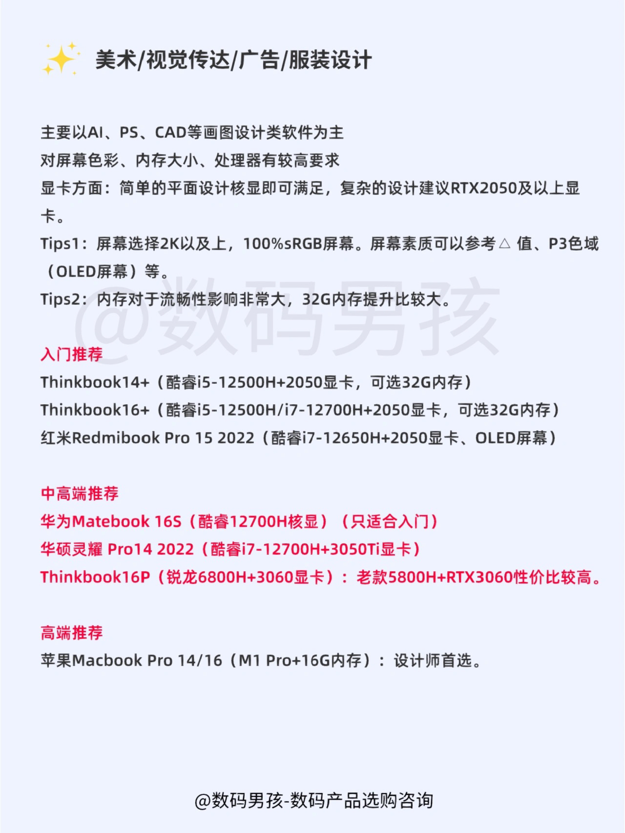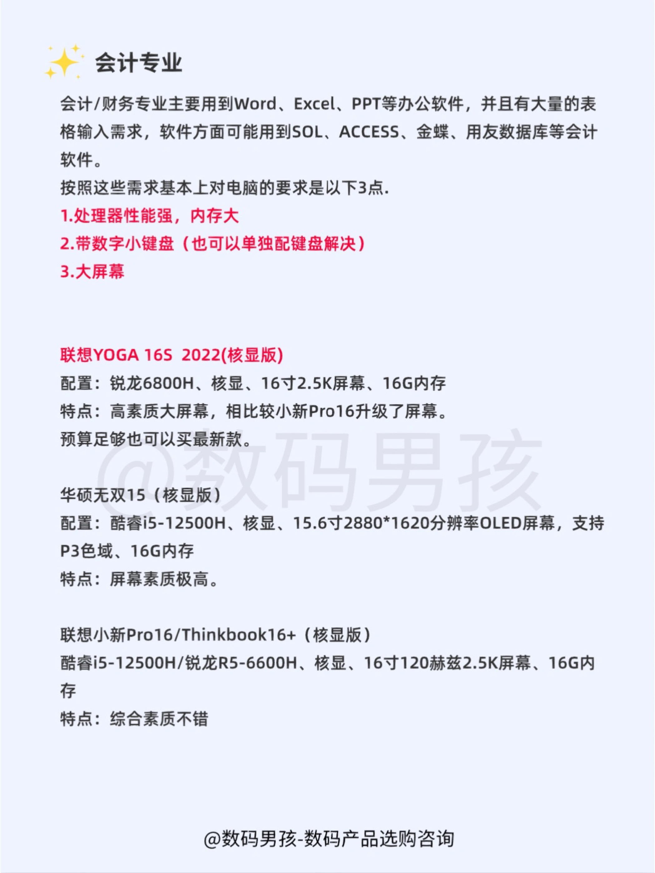 大家好,还是有不少学生党来问我笔记本怎么选?今天再给大家汇总一下各专业的笔记本选购需求! 普通大学专业 适合教育、历史、文学、哲学、工商管理、法学、音乐、经济、汉语言、新闻、新媒体等绝大部分专业。以办公、学习、娱乐为主,不打游戏或轻度游戏,无特殊软件需求。 Tips1:建议购买13/14寸笔记本,轻巧便携。 Tips2:新款当中建议购买酷睿i5-12500H、锐龙6800H款。 Tips3:如果需...