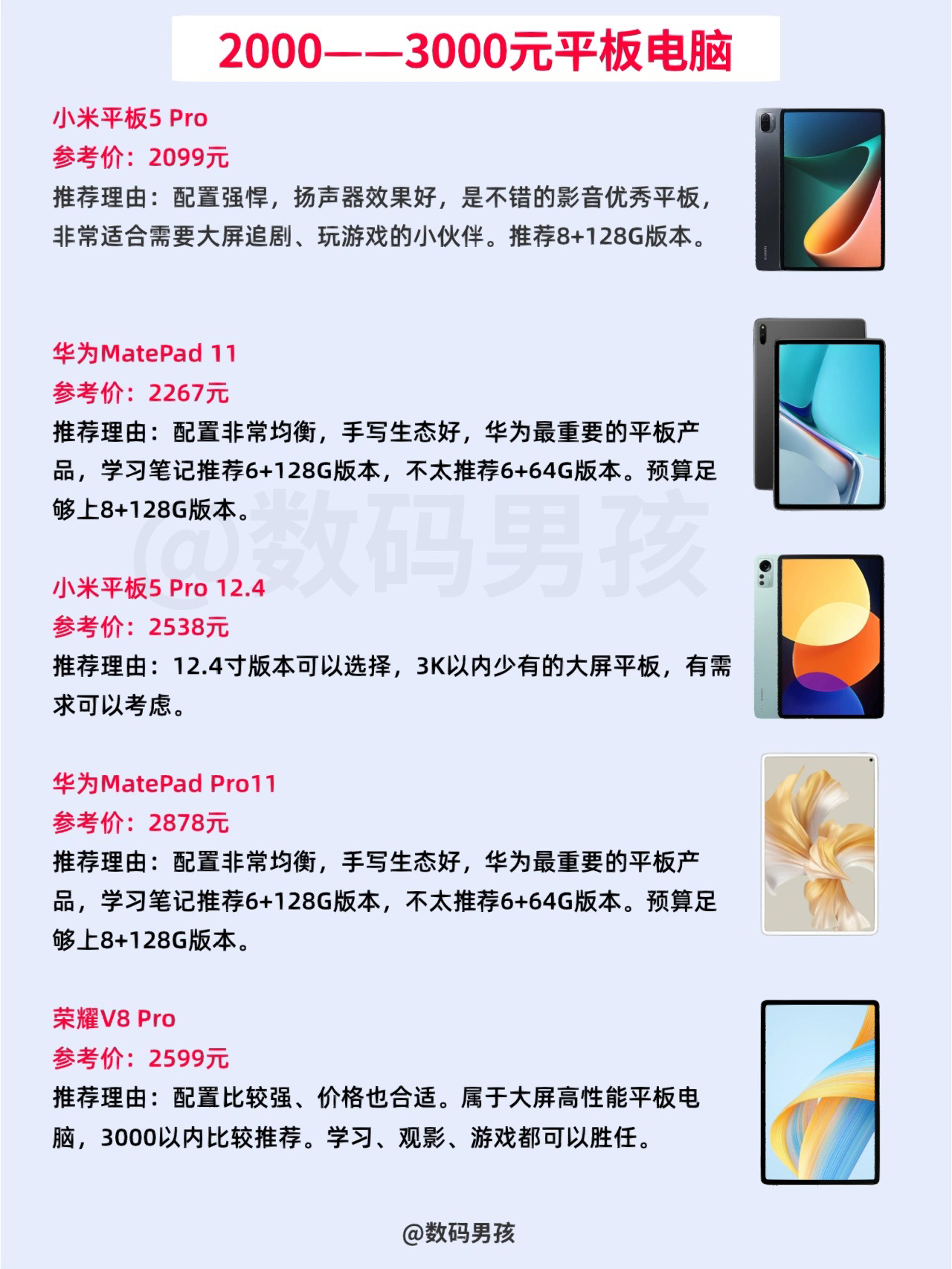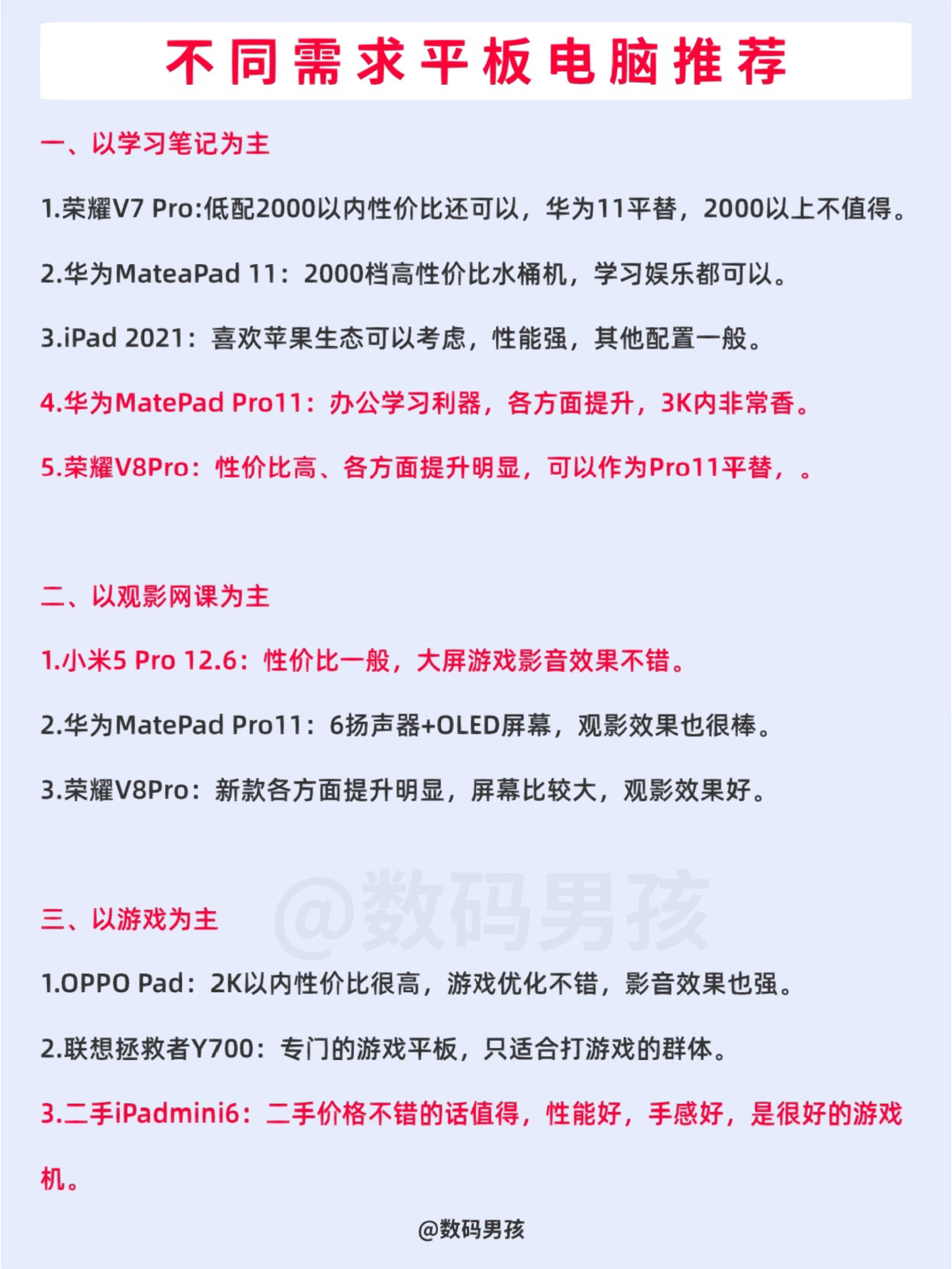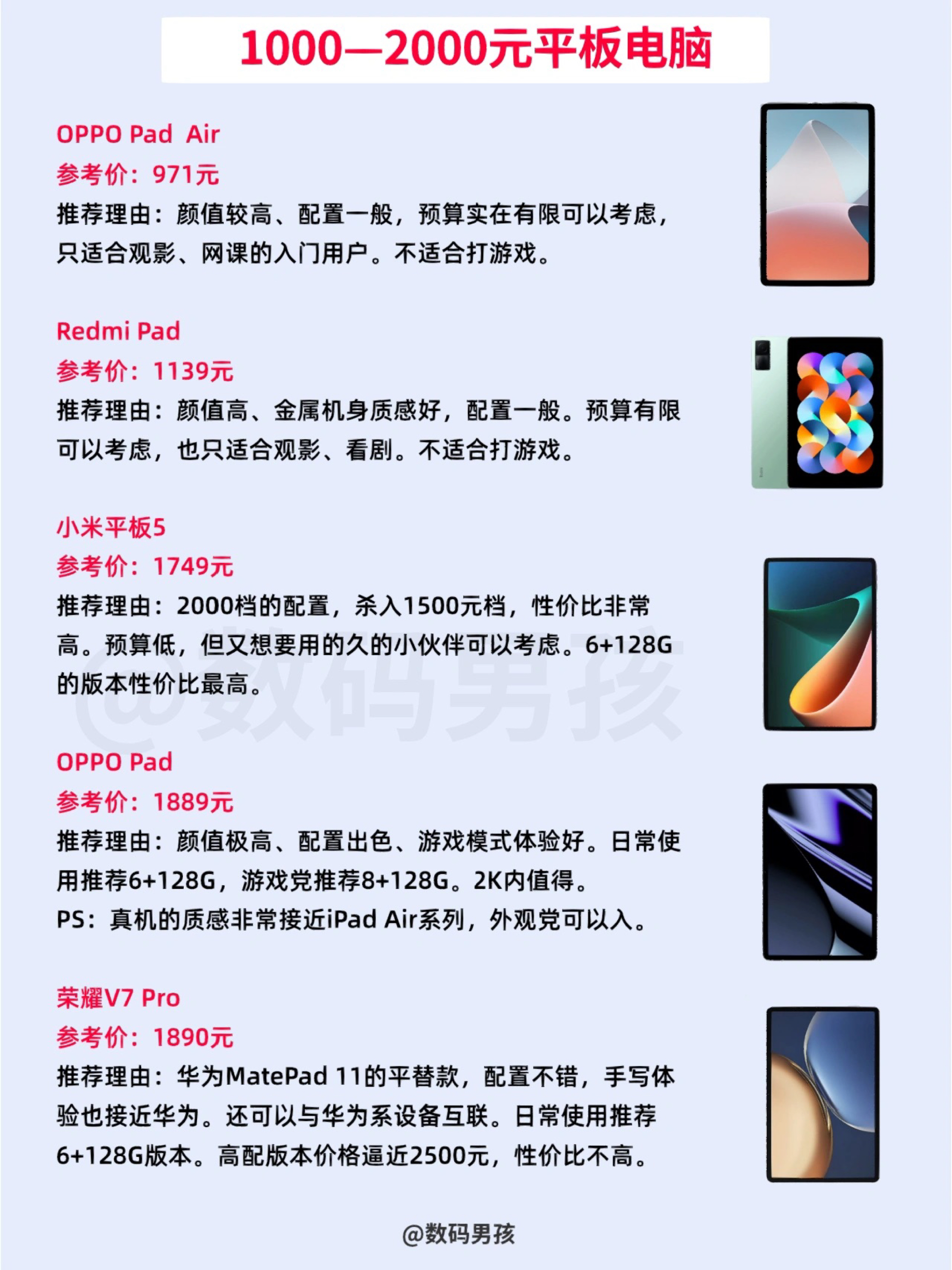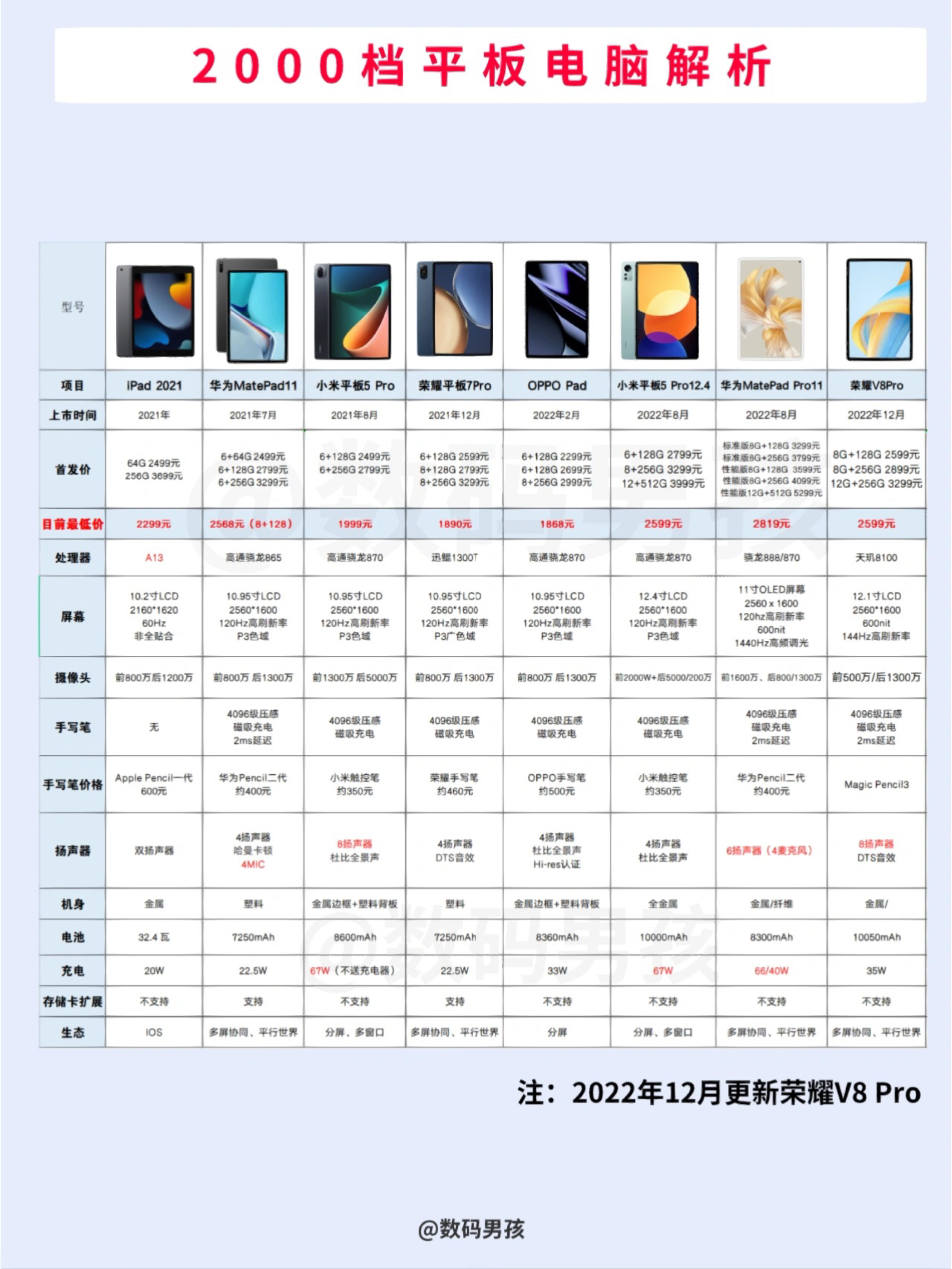 大家好,这里是数码男孩,23年初,给大家整理了目前值得购买的2000档平板电脑。 一、以学习笔记为主 1.荣耀V7 Pro:低配2000以内性价比还可以,华为11平替,2000以上不值得。 2.华为MateaPad 11:2000档高性价比水桶机,学习娱乐都可以,性价比不算特别高,但属于不会错的选择。 3.iPad 2021:喜欢苹果生态可以考虑,性能强,其他配置一般,建议慎重考虑。 4.华为Ma...