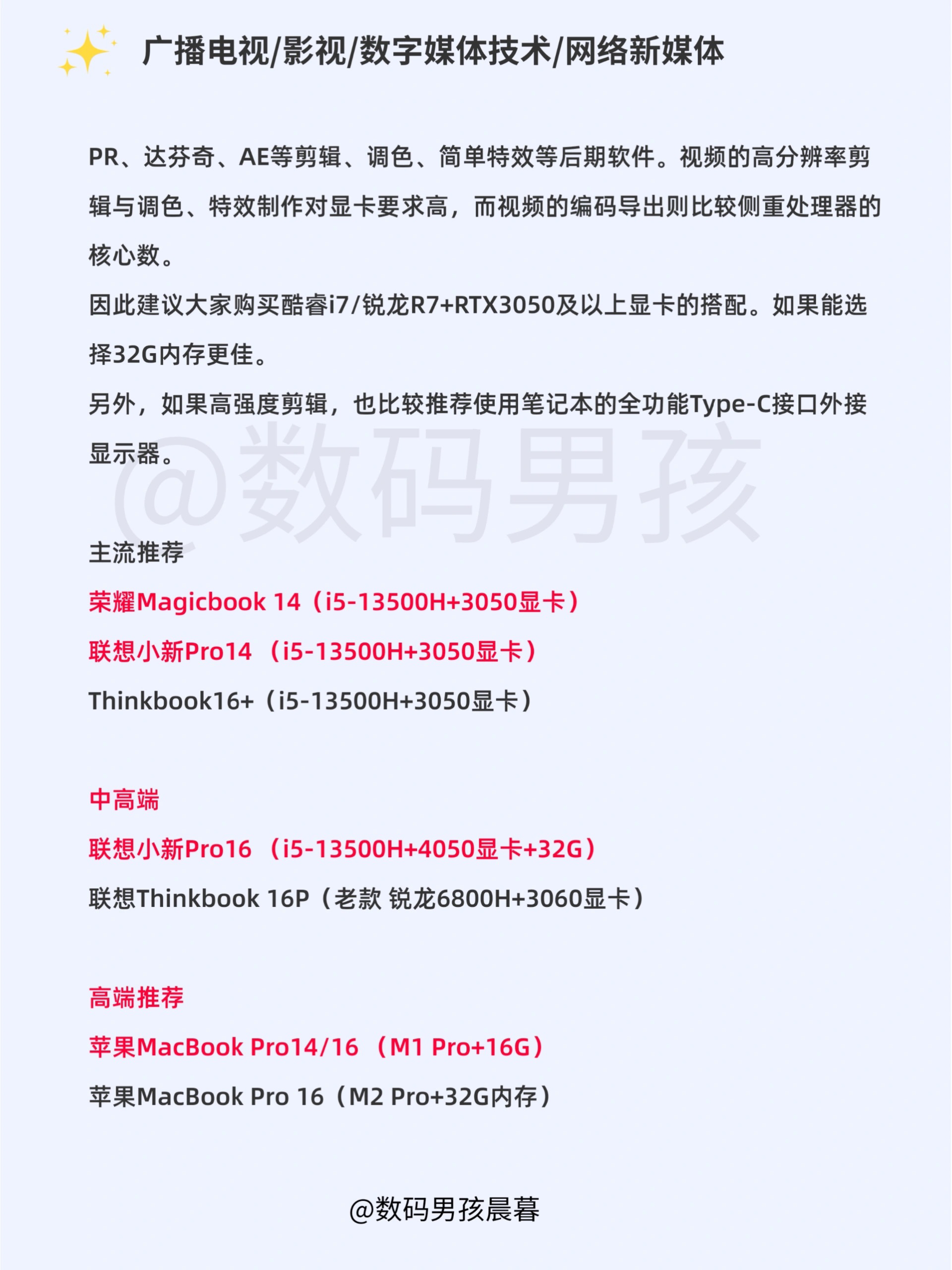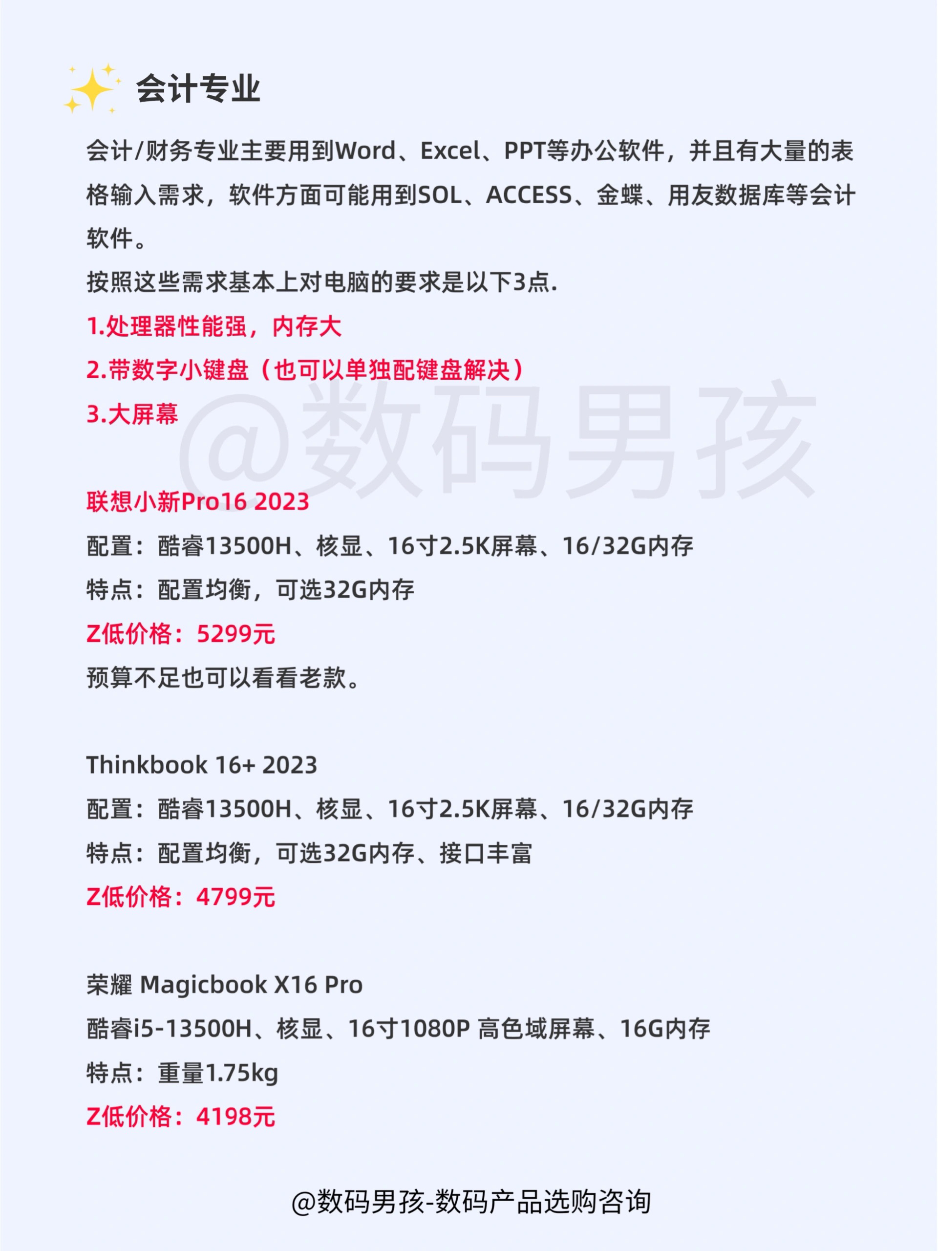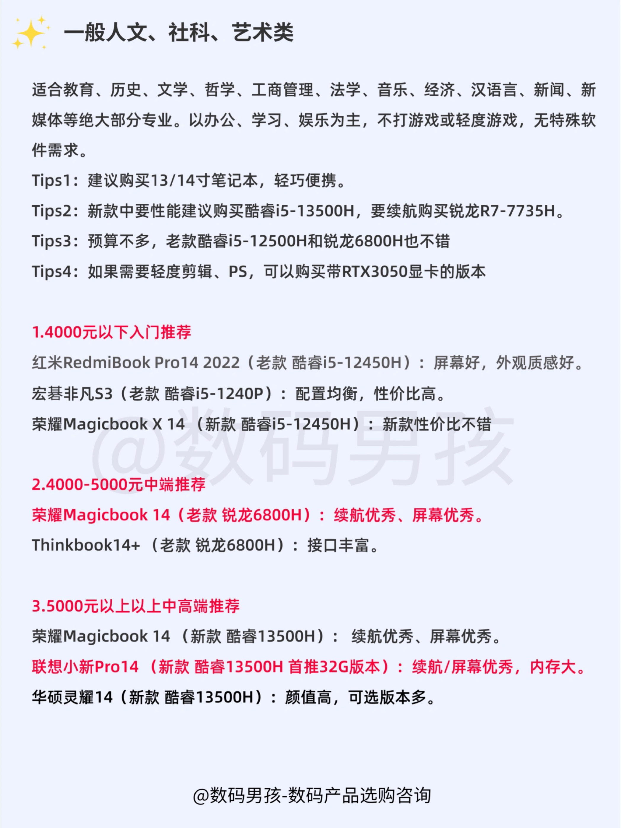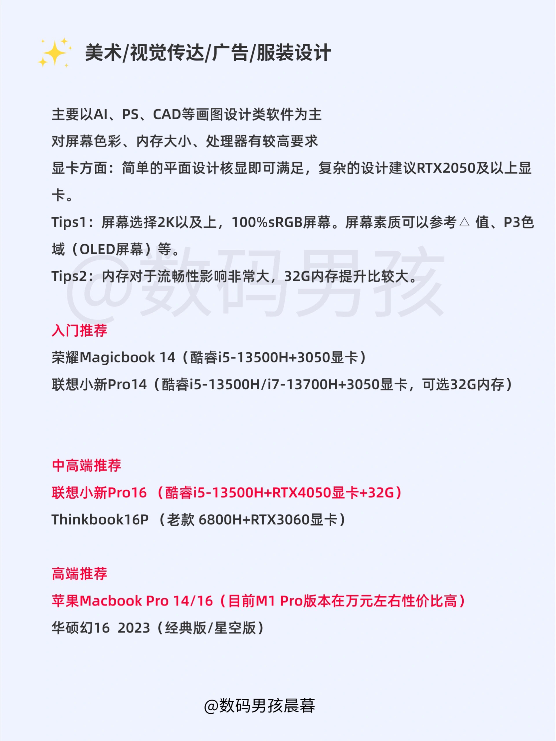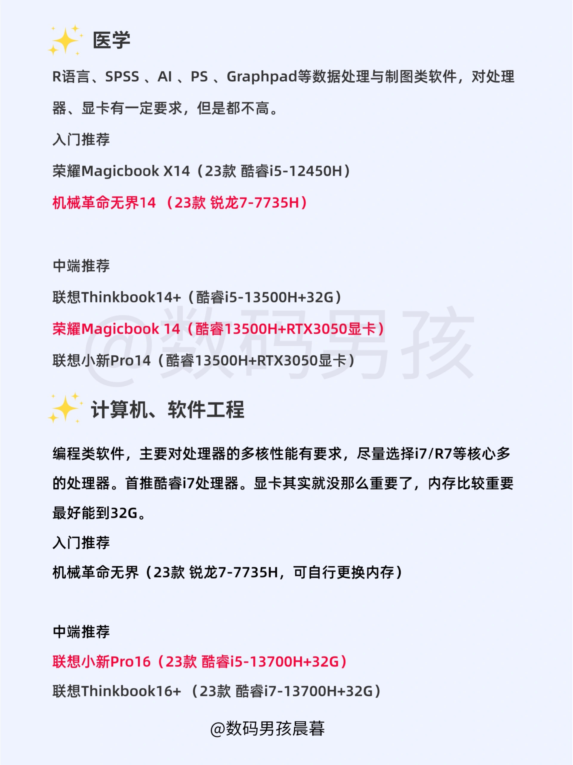 大家好这里是晨暮,2023年4月各大品牌都有新品笔记本发布的差不多了,给大家整理一期各专业笔记本选购指南!!主要有一下一些专业的推荐,如有遗漏,可以告诉我你的专业、用途、预算,我来推荐!! 一、普通文科生(包括语言、教育、文学、历史等) 二、会计专业 三、美术/设计等 四、广播电视/影视等 五、医学 六、计算机 具体解析和推荐大家可以看图。 有任何选购问题可以继续问我