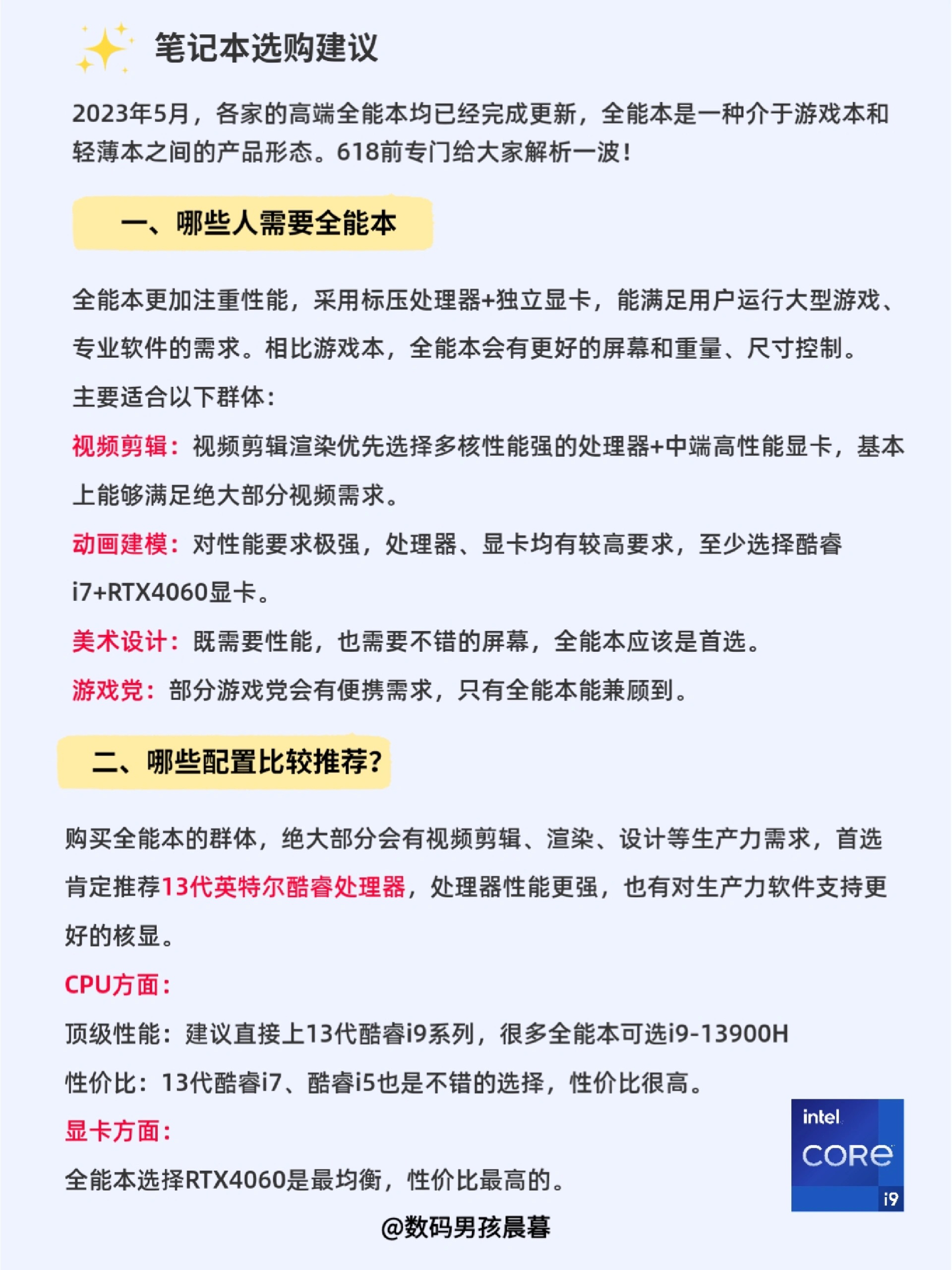 5月各大品牌的新品基本上已经更新完了,很多小伙伴有全能本的需求,今天给大家汇总一期高性能全能本推荐! 一、什么样的人需要全能本? 全能本更加注重性能,采用标压处理器+独立显卡,能满足用户运行大型游戏、专业软件的需求。相比游戏本,全能本会有更好的屏幕和重量、尺寸控制。 全能本基本上是各种生产力需求人群的必备工具。 主要适合以下群体: 1.视频剪辑:视频剪辑渲染优先选择多核性能强的处理器+中端高性能...