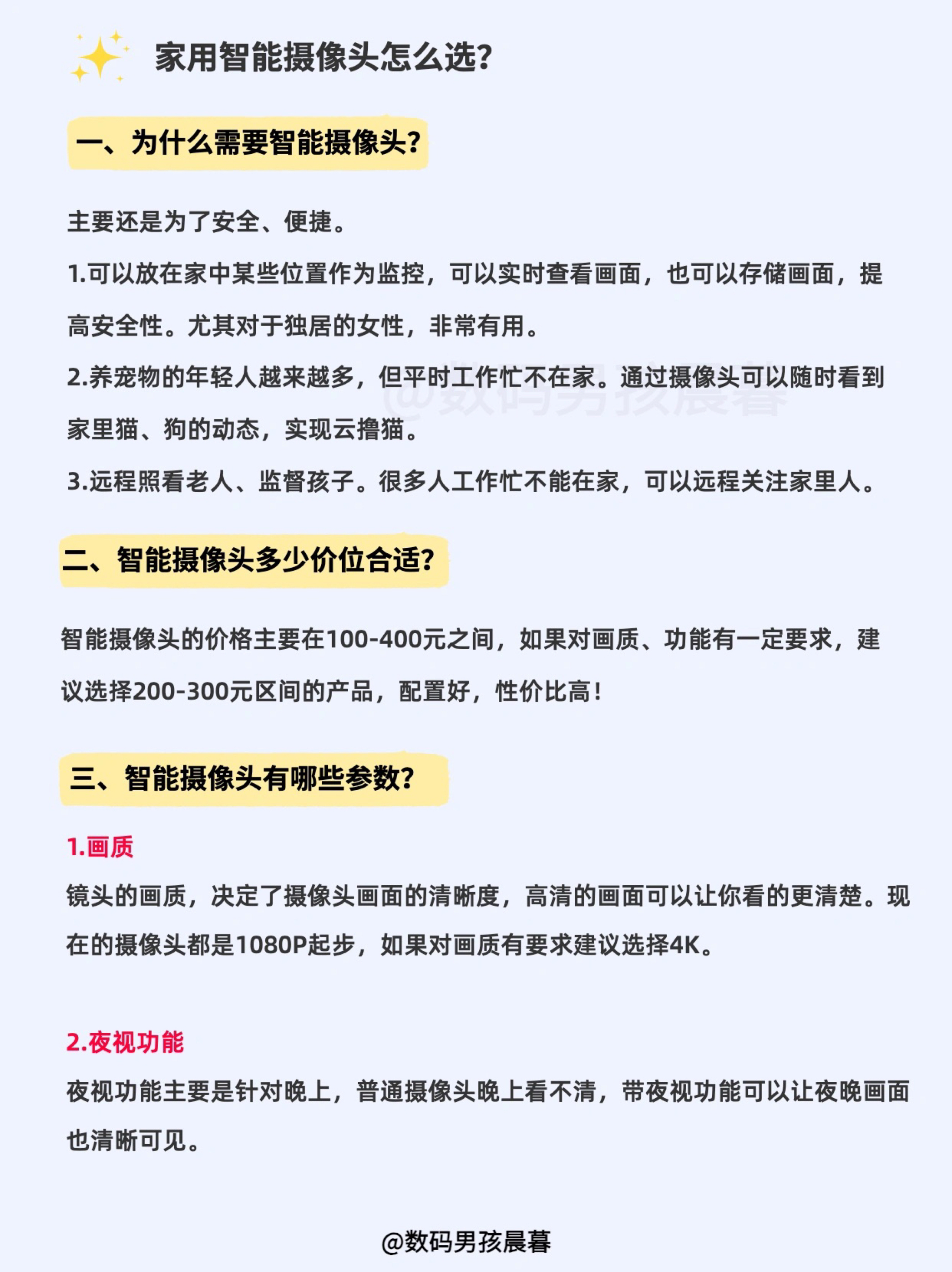 一、为什么需要智能摄像头 主要还是为了安全、便捷。 1.可以放在家中某些位置作为监控,可以实时查看画面,也可以存储画面,提高安全性。尤其对于独居的女性,非常有用。 2.养宠物的年轻人越来越多,但平时工作忙不在家。通过摄像头可以随时看到家里猫、狗的动态,实现云撸猫。 3.远程照看老人、监督孩子。很多人工作忙不能在家,可以远程关注家里人。 —— 二、选择多少价位合适? 智能摄像头的价格主要在100-4...