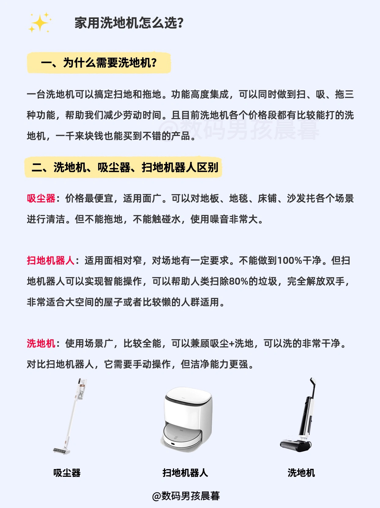一、为什么需要洗地机? 一台洗地机可以搞定扫地和拖地。功能高度集成,可以同时做到扫、吸、拖三种功能,帮助我们减少劳动时间。且目前洗地机各个价格段都有比较能打的洗地机,一千来块钱也能买到不错的产品。 二、洗地机、吸尘器、扫地机器人的区别 吸尘器:价格最便宜,适用面广。可以对地板、地毯、床铺、沙发扥各个场景进行清洁。但不能拖地,不能触碰水,使用噪音非常大。 扫地机器人:适用面相对窄,对场地有一定要求。...