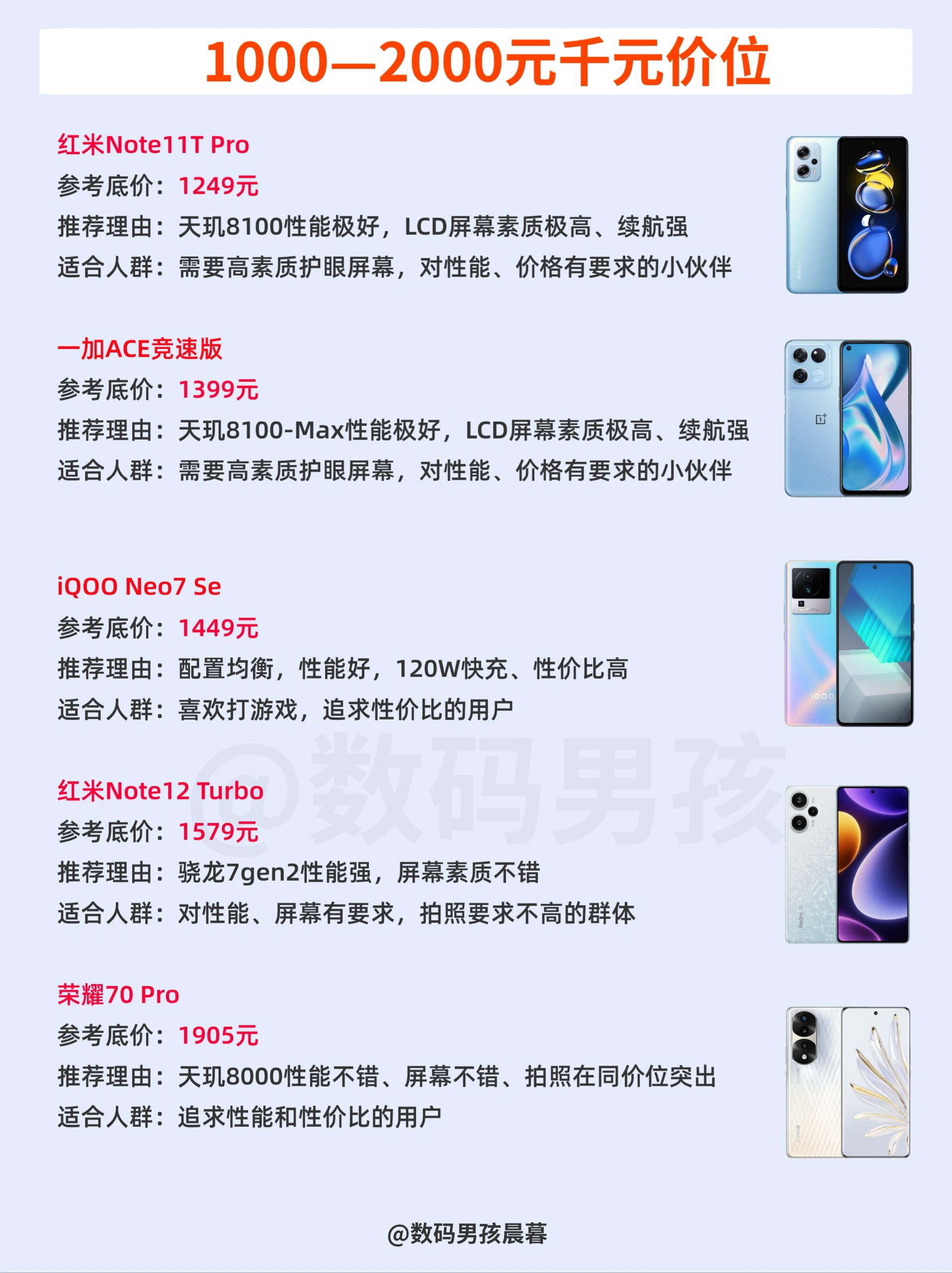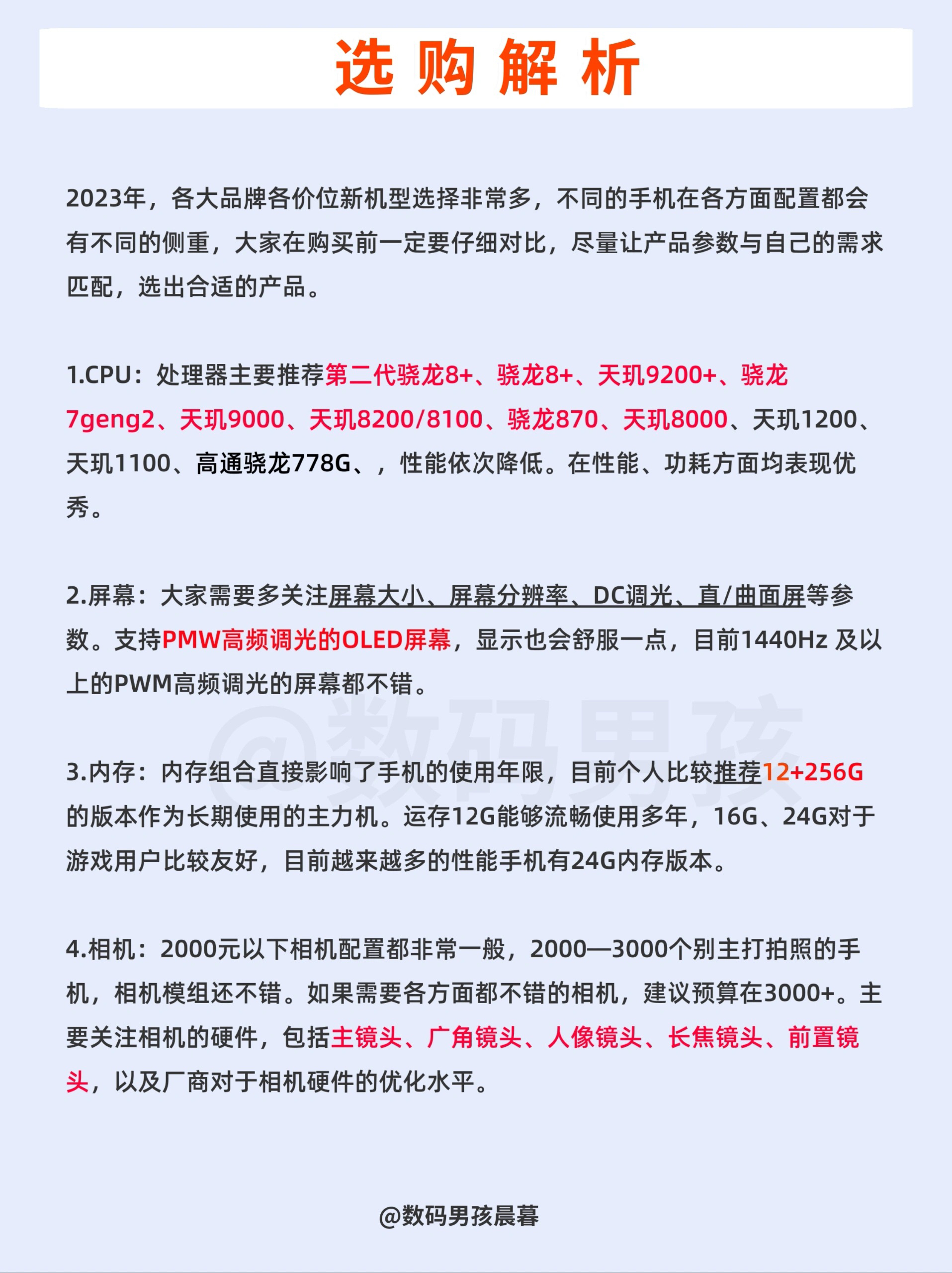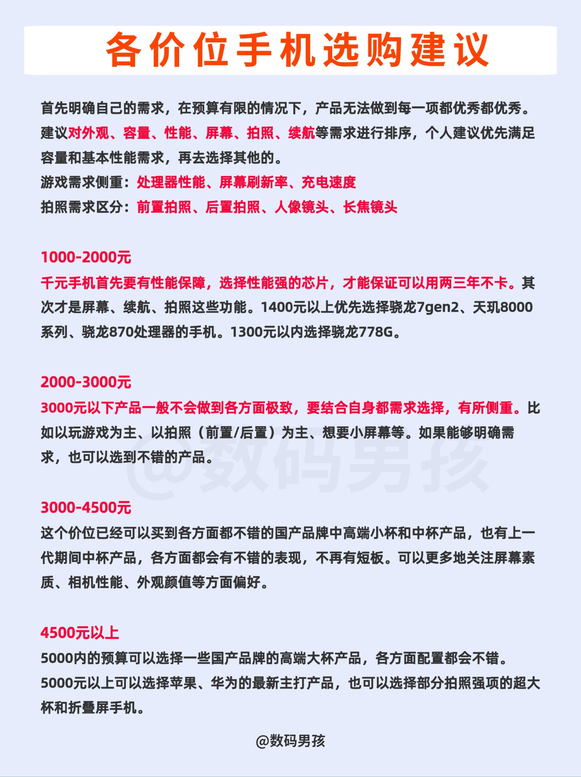 首先明确自己的需求,在预算有限的情况下,建议对外观、容量、性能、屏幕、拍照等需求排序,优先满足容量和基本性能需求,再去选择其他的。 游戏需求侧重:处理器性能、屏幕刷新率、充电速度 拍照需求区分:前置拍照、后置拍照、人像镜头、长焦镜头 一、各价位产品解析 1000-2000元 千元手机首先要有性能保障,选择性能强的芯片,才能保证可以用两三年不卡。其次才是屏幕、续航、拍照这些功能。1400元以上优先选...