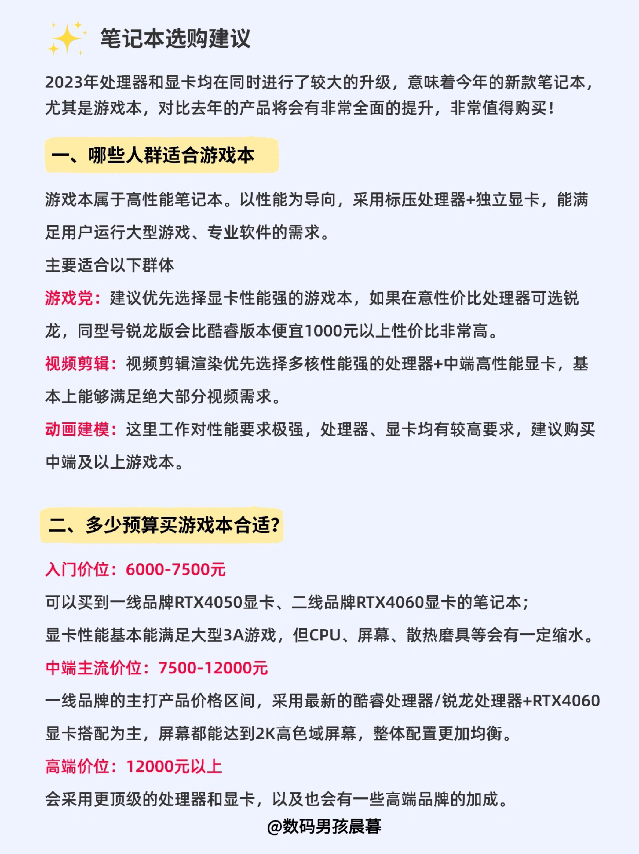 马上就要十一假期了,很多同学入学后还没买电脑,因为兼具了学业和游戏需求,建议一定要选一台高性能的游戏本!最最最重要的是,早一点上车的话马上到来的十一假期就能和小伙伴们组队开黑了! - 一、游戏本适合群体 游戏党:建议优先选择显卡性能强的游戏本,如果在意性价比处理器可选锐龙,同型号锐龙版会比酷睿版本便宜1000元以上性价比非常高。 视频剪辑:视频剪辑渲染优先选择多核性能强的处理器+中端高性能显卡,基...