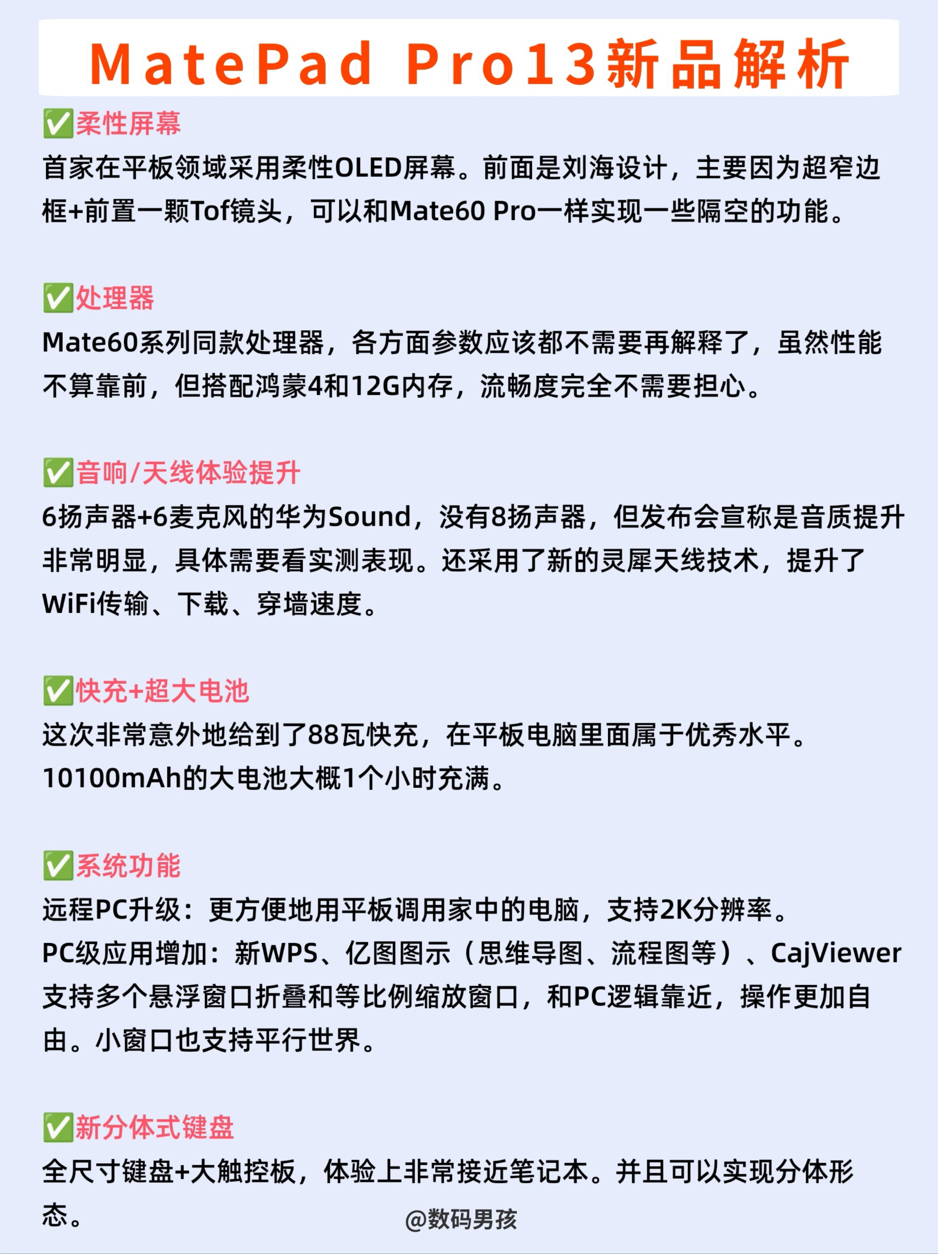 今天下午华为发布了新品高端平板电脑MatePad Pro13.2英寸,马上给大家带来一波解析! - MatePad Pro13.2产品升级点 ✅柔性屏幕 首家在平板领域采用柔性OLED屏幕。前面是刘海设计,主要因为超窄边框+前置一颗Tof镜头,可以和Mate60 Pro一样实现一些隔空的功能。 ✅处理器 Mate60系列同款处理器,各方面参数应该都不需要再解释了,虽然性能不算靠前,但搭配鸿蒙4和1...