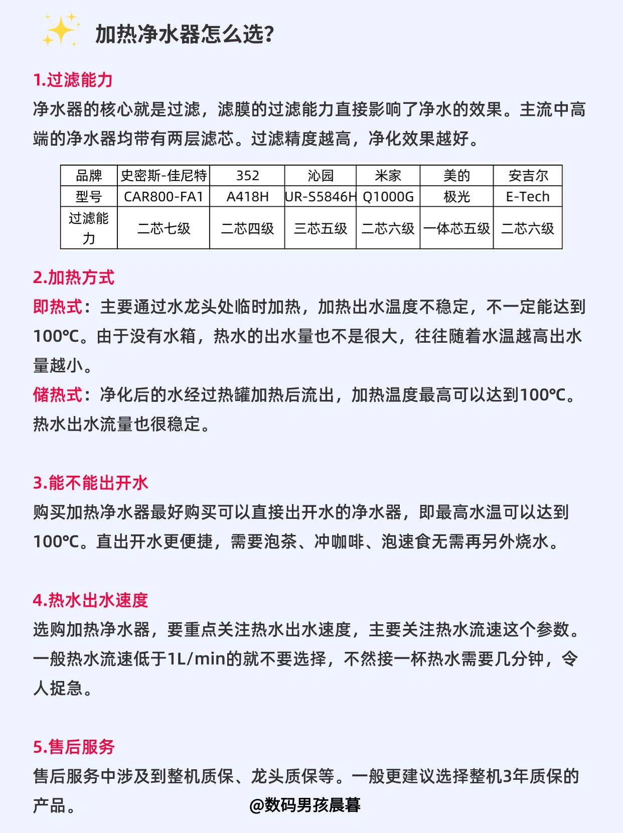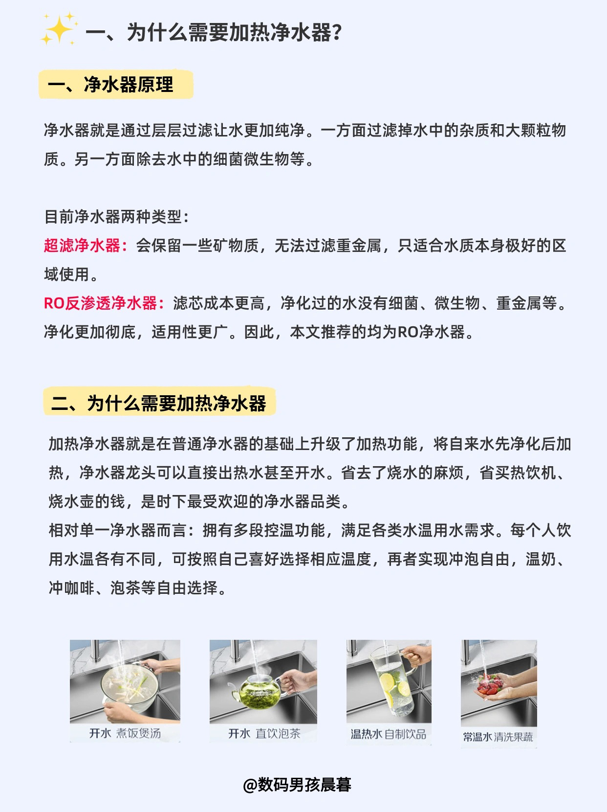 大家好这里是晨暮!10月了,很多小伙伴准备冲刺双11,今天开始每一期给大家整理一个品类,一篇研究透,帮助大家挑好产品!不买错! — 今天这一期是家用加热净水器推荐! 一、什么是加热净化器 加热净水器就是在普通净水器的基础上升级了加热功能,将自来水先净化后加热,净水器龙头可以直接出热水甚至开水。省去了烧水的麻烦,省买热饮机、烧水壶的钱,是时下最受欢迎的净水器品类。 — 二、加热净水器怎么选? 1.过...