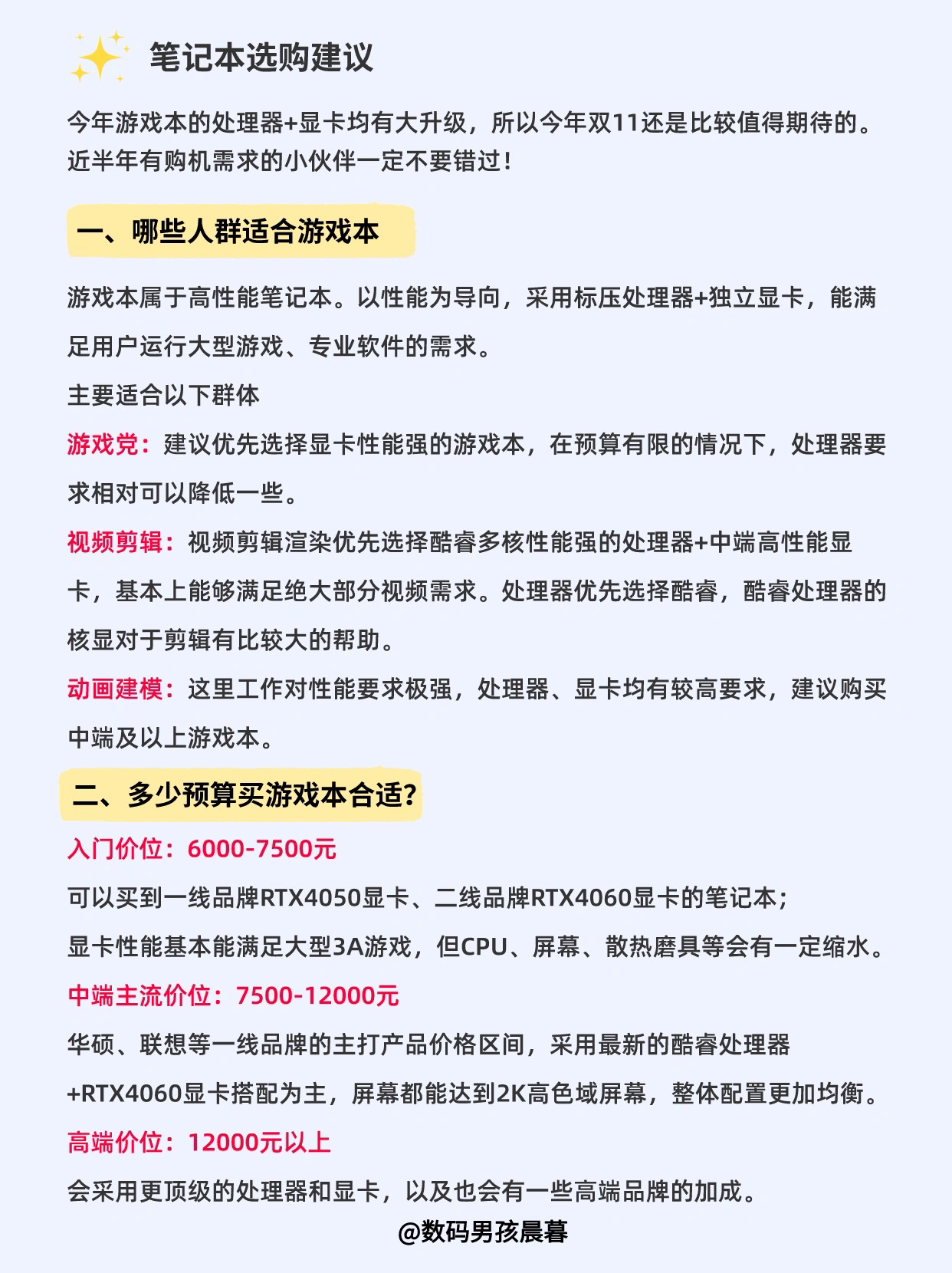 今年游戏本的处理器+显卡均有大升级,所以今年双11还是比较值得期待的。近半年有购机需求的小伙伴一定不要错过! - 一、游戏本选购预算分析 入门价位:6000-7500元 可以买到一线品牌RTX4050显卡、二线品牌RTX4060显卡的笔记本; 显卡性能基本能满足大型3A游戏,但CPU、屏幕、散热磨具等会有一定缩水。 - 中端主流价位:7500-12000元 华硕、联想等一线品牌的主打产品价格区间,...