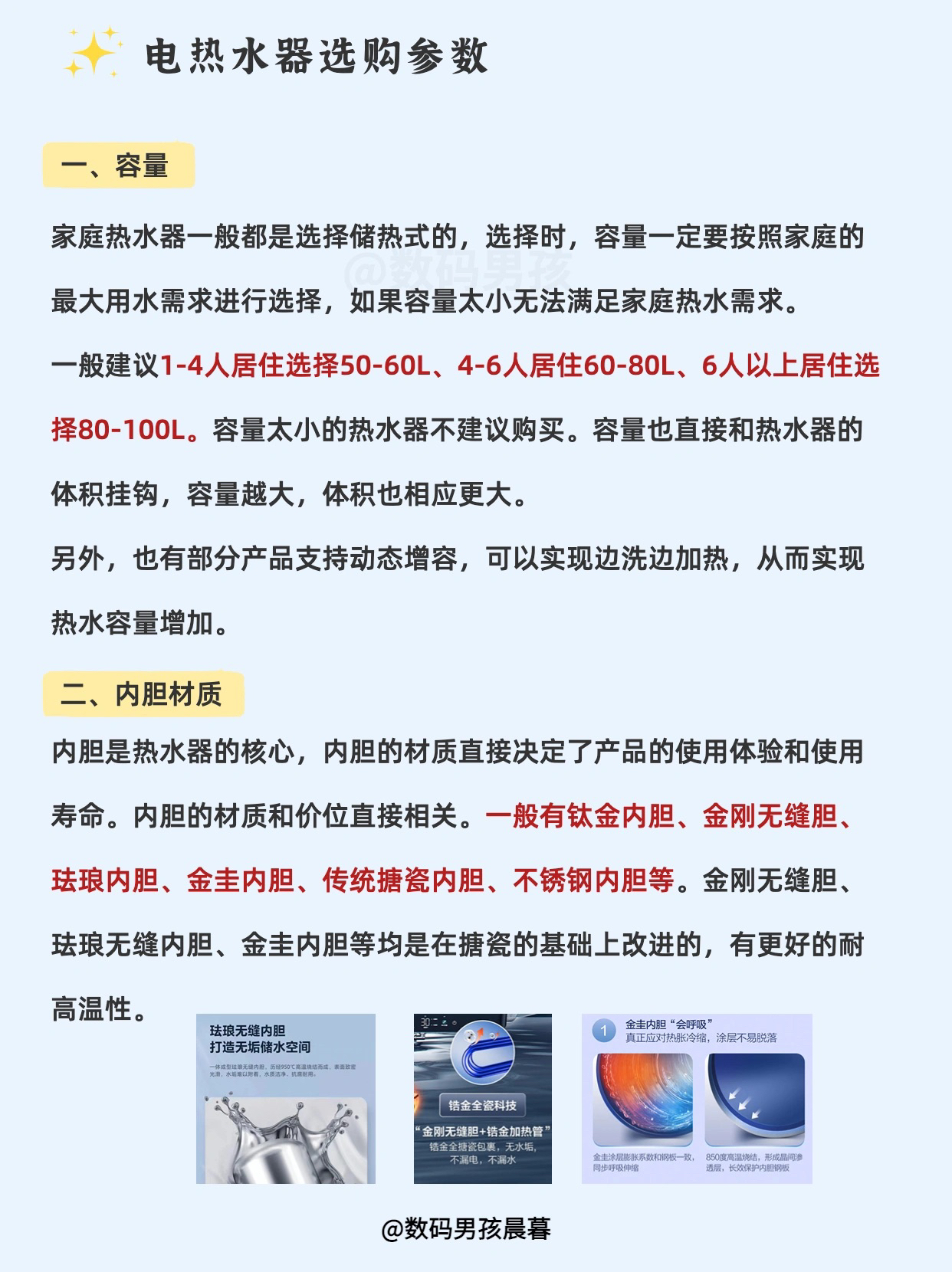 很多小伙伴想要在双11选购电热水器,今天给大家一篇给大家说清楚电热水器怎么选? - 一、选购参数 1.容量 家庭热水器一般都是选择储热式的,选择时,容量一定要按照家庭的最大用水需求进行选择,如果容量太小无法满足家庭热水需求。 一般建议1-4人居住选择50-60L、4-6人居住60-80L、6人以上居住选择80-100L。容量太小的热水器不建议购买。容量也直接和热水器的体积挂钩,容量越大,体积也相应...