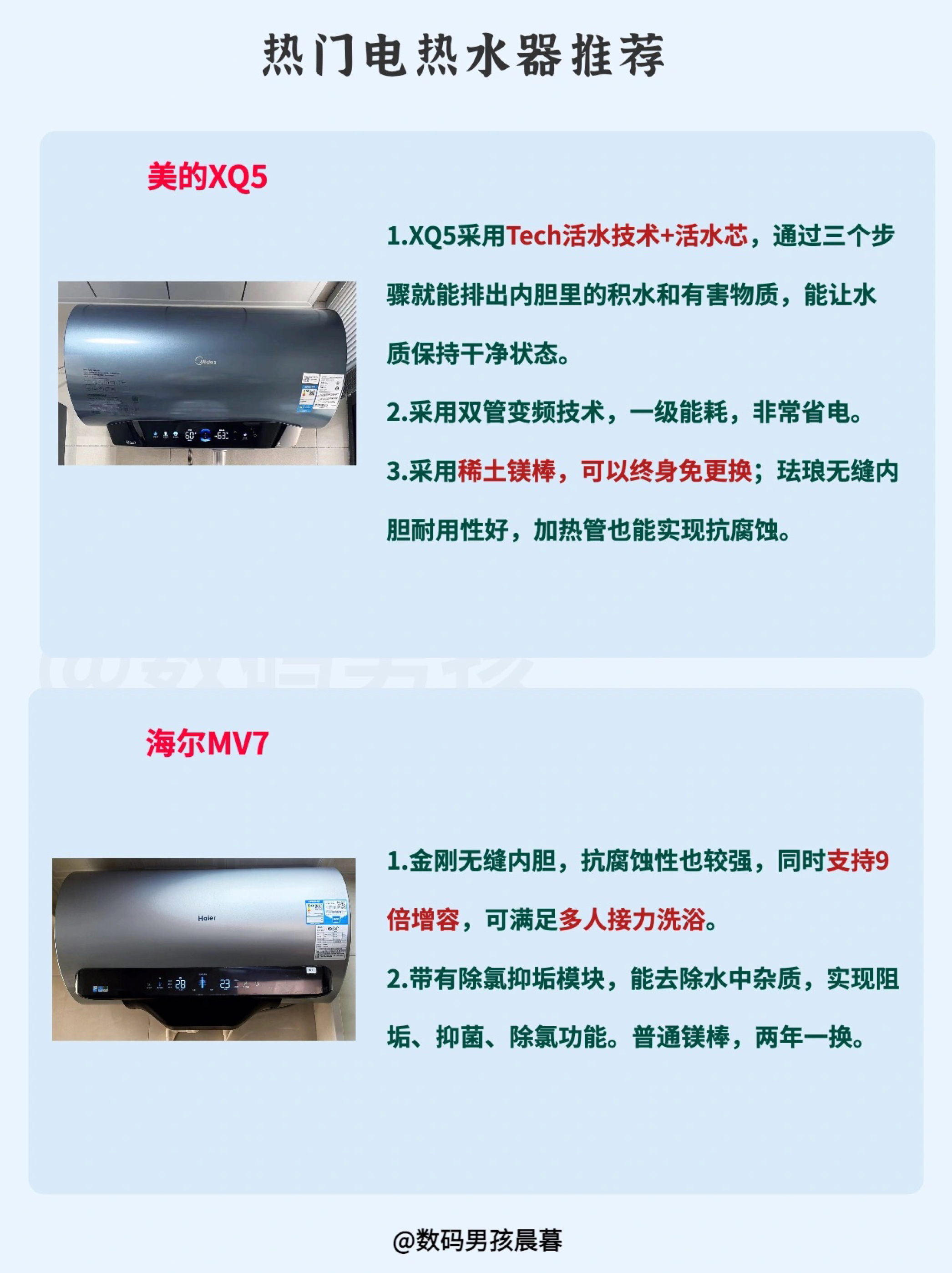 本篇笔记关联了Midea/美的 60L 电热水器 速热 除氯技术 养肤级活水芯 自动断电 防触电 圆筒形 储水式 F60-33XQ5(HE) 蓝色、Haier/海尔 MV7系列 60/80L 电热水器 除氯净水 变频速热 一级能效 卫生间 储水式 一级节能 小蓝瓶 净水洗 EC6005-MV5(U1) 浅蓝色 60L EC6005-MV7U1、Vanward/万和 A6 储水式 电热水器 50/60L 超薄扁桶 出水断电 双擎短双胆 一级能效 免更换镁棒 深度净滤 节能 速热 卫生间 浅蓝色等商品,为用户提供真实的使用体验和购买参考。