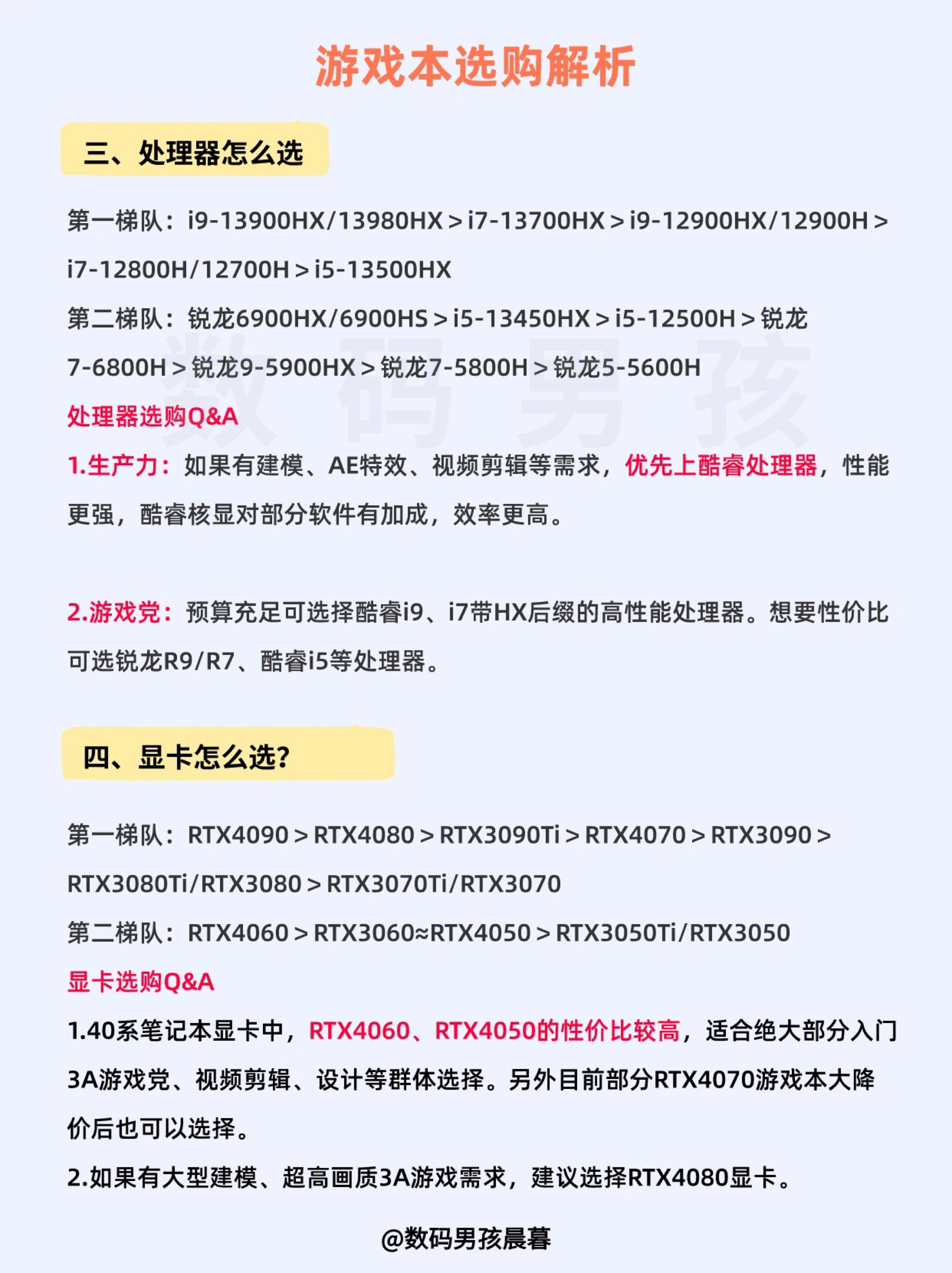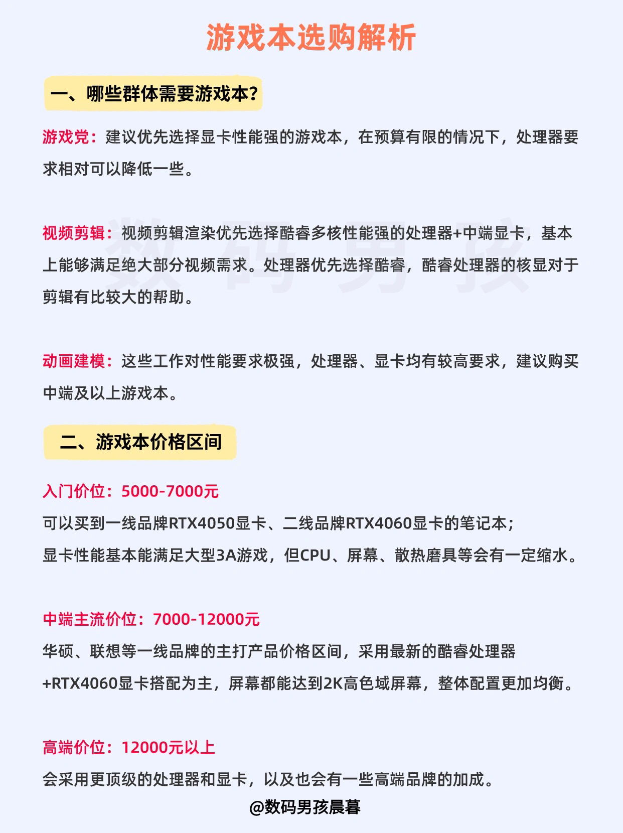 大家好,马上又到了23年末,今天给大家盘点一下23年度值得购买度游戏本!今年下半年其实是购买游戏本的最佳时间点,配置全面升级,性价比超级高,想买的小伙伴一定不要错过! 一、需要游戏本的群体 游戏党、视频剪辑/动画建模等工作者 —— 二、游戏本价格区间 入门价位:5000-7000元 可以买到一线品牌RTX4050显卡、二线品牌RTX4060显卡的笔记本; 显卡性能基本能满足大型3A游戏,但CPU...