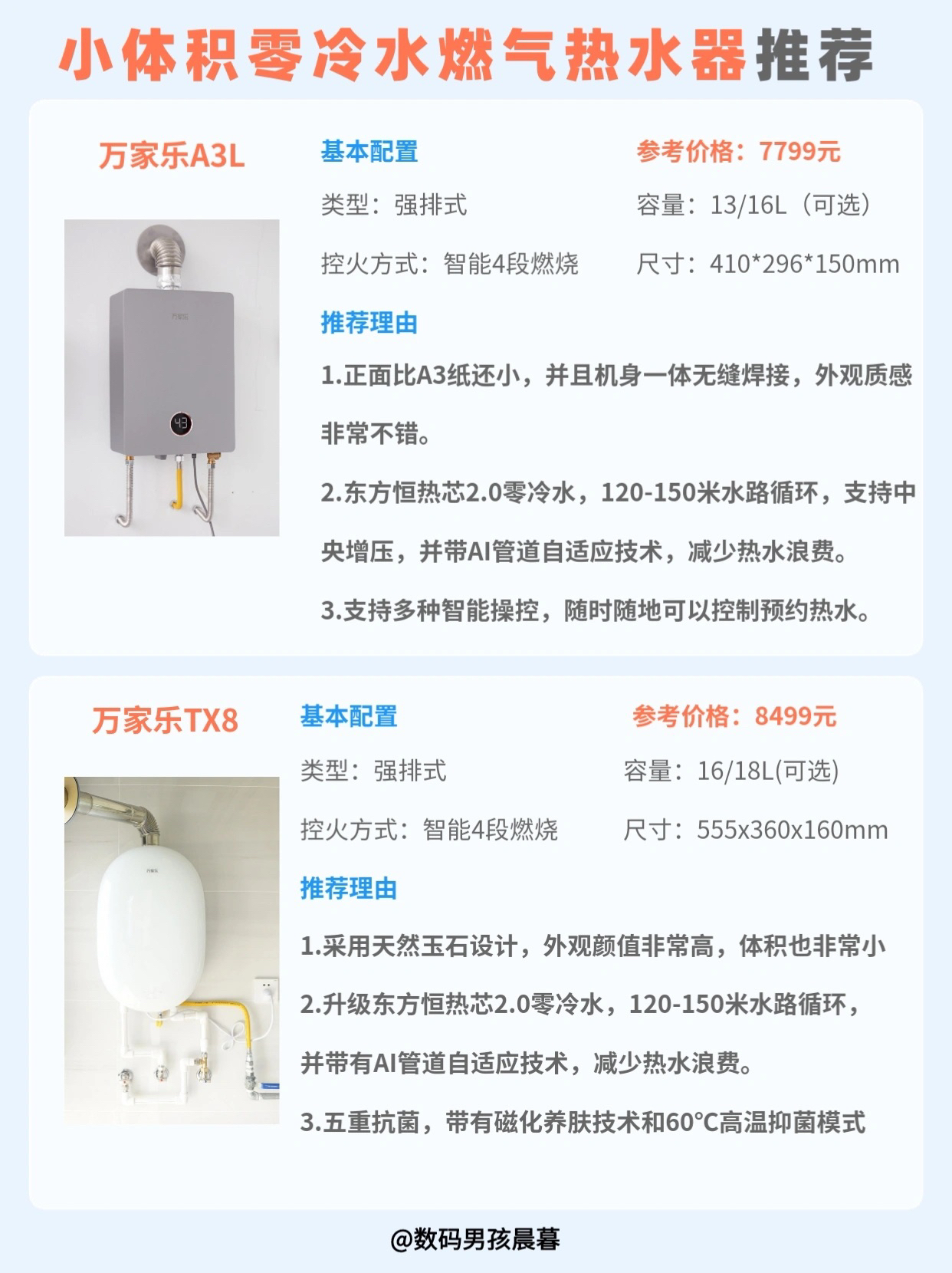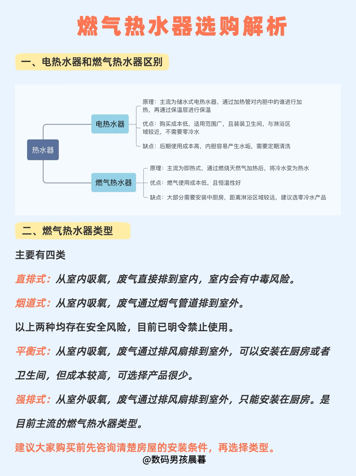 快到年底,天气越来越冷,热水器就成了家里必须的电器。今天给大家解析一期燃气热水器选购攻略,并梳理6款适合不同需求的万家乐热水器! 一、电热水器和燃气热水器怎么选? 总的来说,电热水器前期购买成本低,使用成本高,且适用范围更广,可以安装在卫生间。燃气热水器使用成本更低,恒温效果好。但大部分需要安装中厨房或者阳台。 ~ 二、燃气热水器类型 主要有四类直排式:从室内吸氧,废气直接排到室内,室内会有中毒...