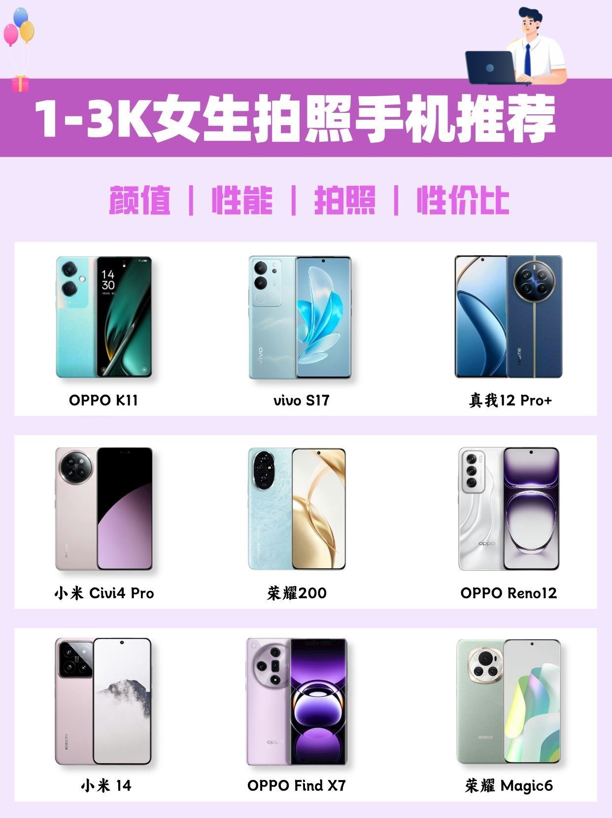 很多女生想换手机,不知道该怎么选?今天给大家整理一期适合女生的高颜值拍照手机! 下面是选购事项和产品推荐! ~ 一、性能配置 CPU、运存、内存——决定手机的性能,即一款手机会不会卡,能用几年? 1.CPU:手机的核心性能参数,购机时一定要优先考虑!女生如果不玩游戏,处理器不一定需要最顶级的,但也不能太差。性能太差,很容易卡顿。 2.运存:一般建议选择12G起步,想用5年以上可选16G。 3.内存...