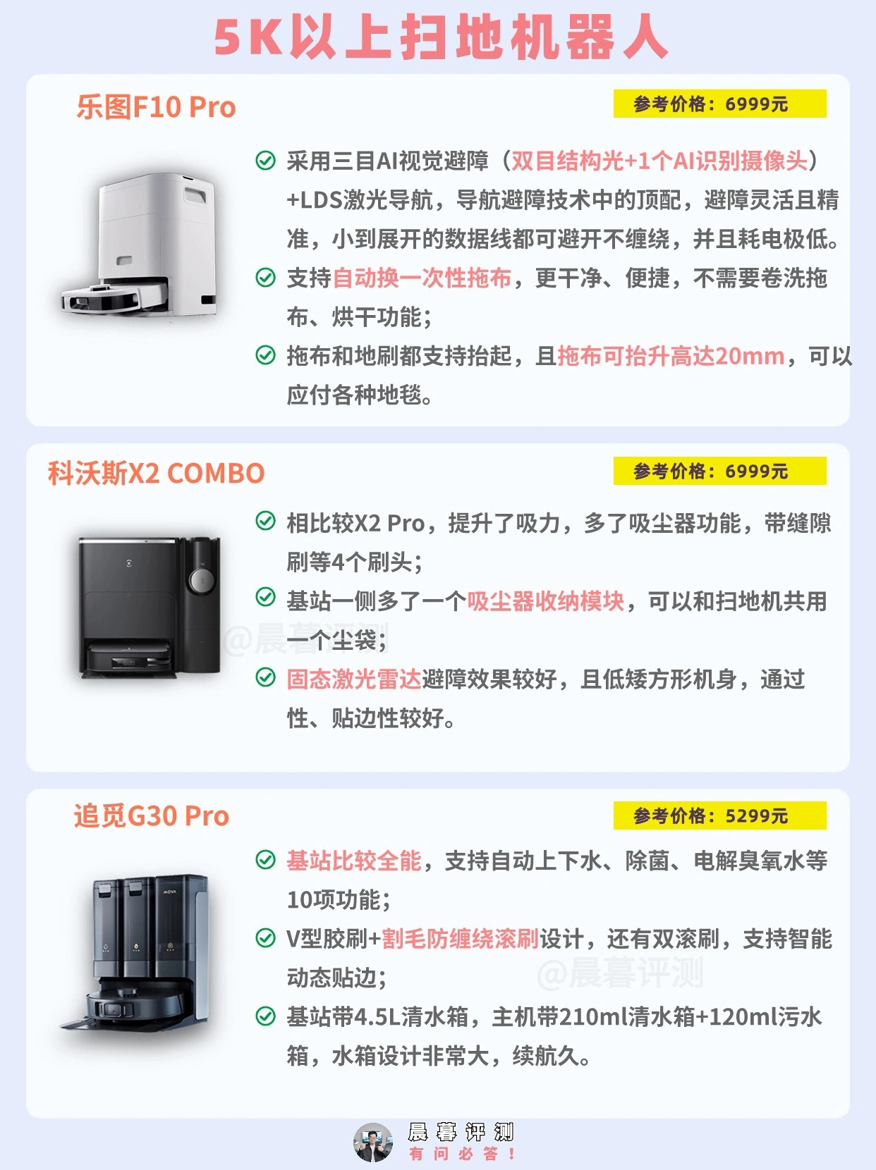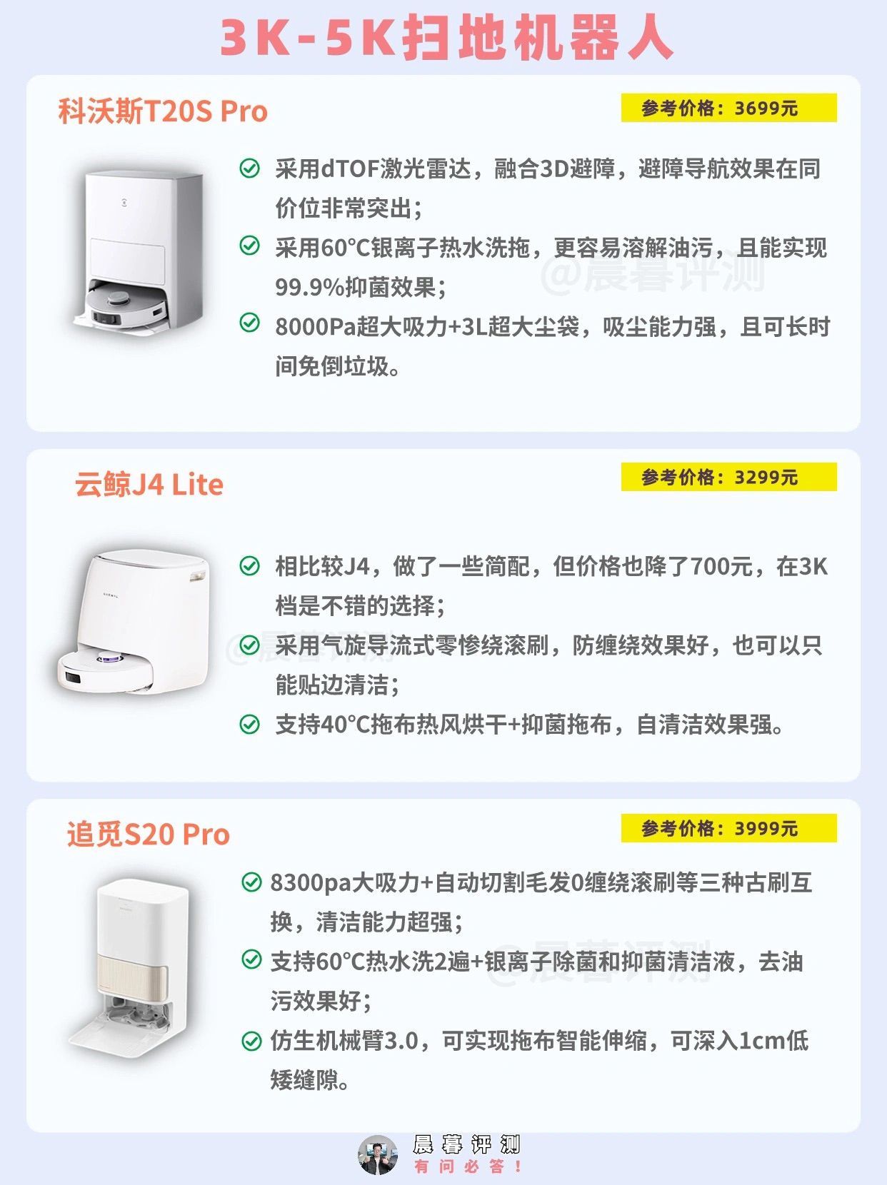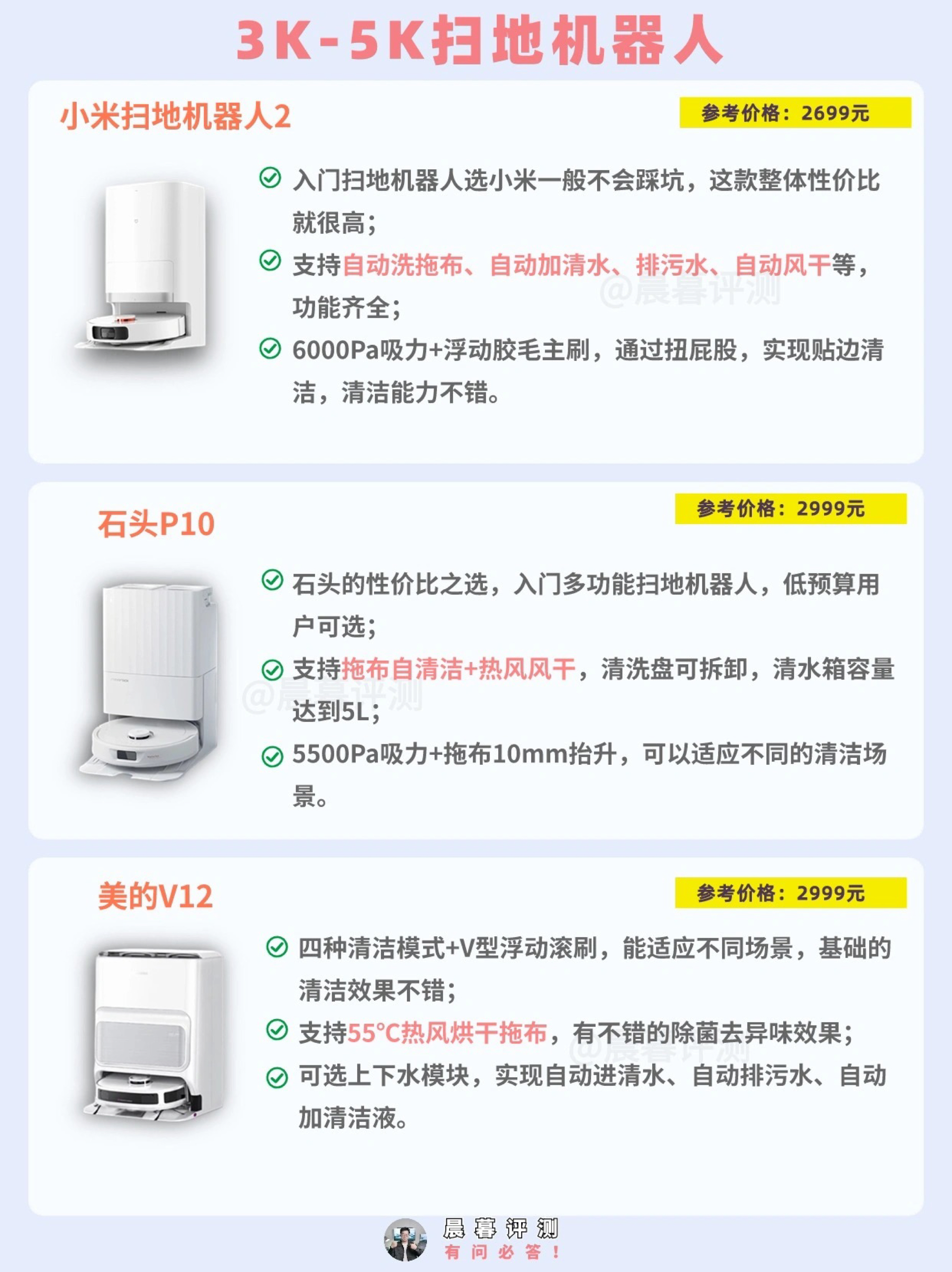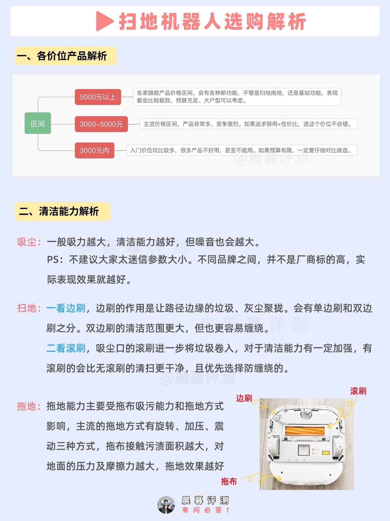 很多朋友想要选购扫地机器人,但是不知道怎么选,今天给大家汇总一期全价位扫地机器人推荐! ~ 各价位段扫地机器人解析 5K以上:各家旗舰产品价格区间,清洁和基站都会有各种新功能,表现都会比较极致,预算充足、大户型可以考虑。 3-5K:主流价格区间,产品非常多,竞争激烈。如果追求够用+性价比,选这个价位。 3K以内:入门价位坑比较多。如果预算在这个区间一定要仔细对比挑选。 ~ 清洁能力解析 吸尘:一般...