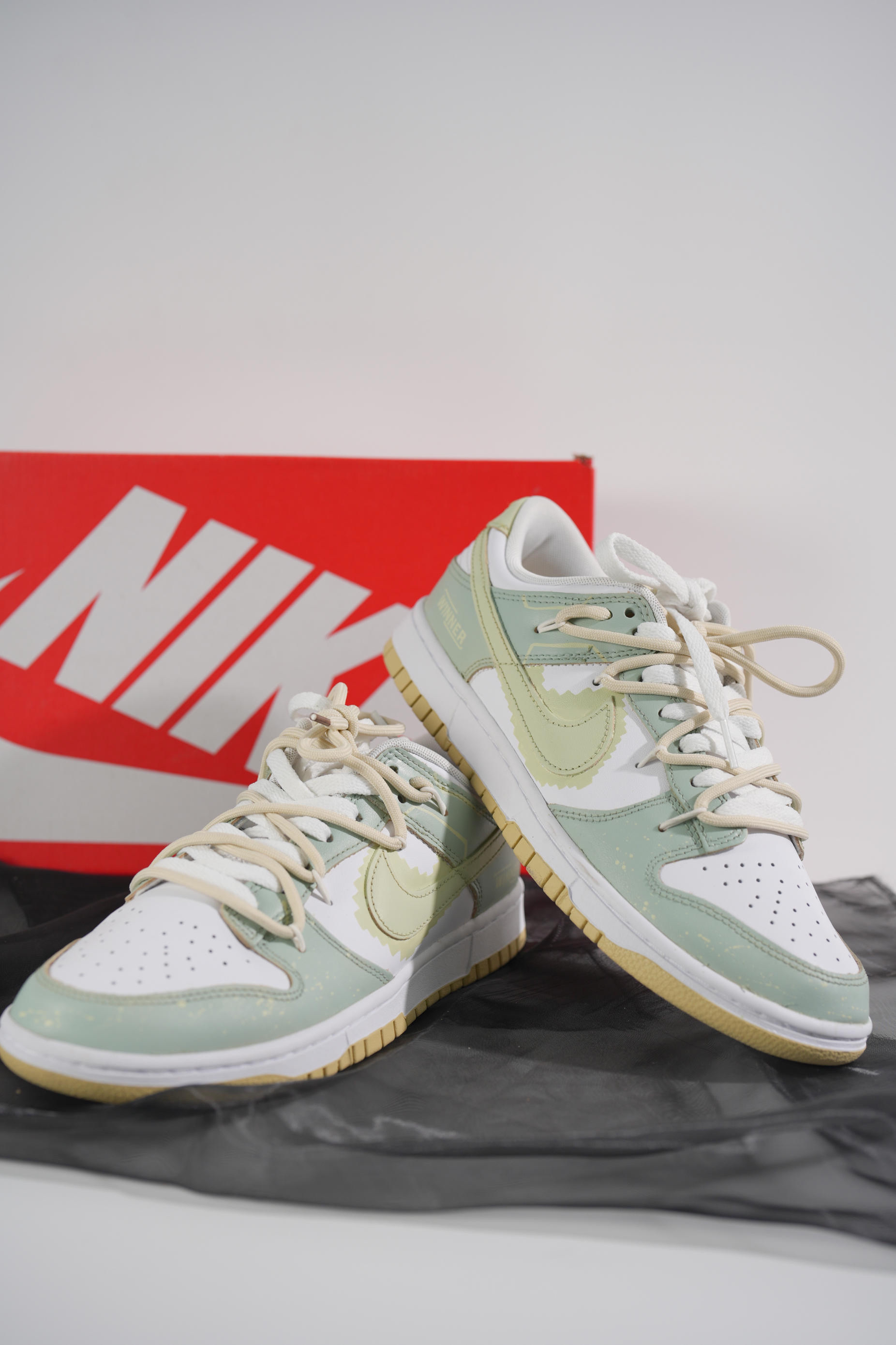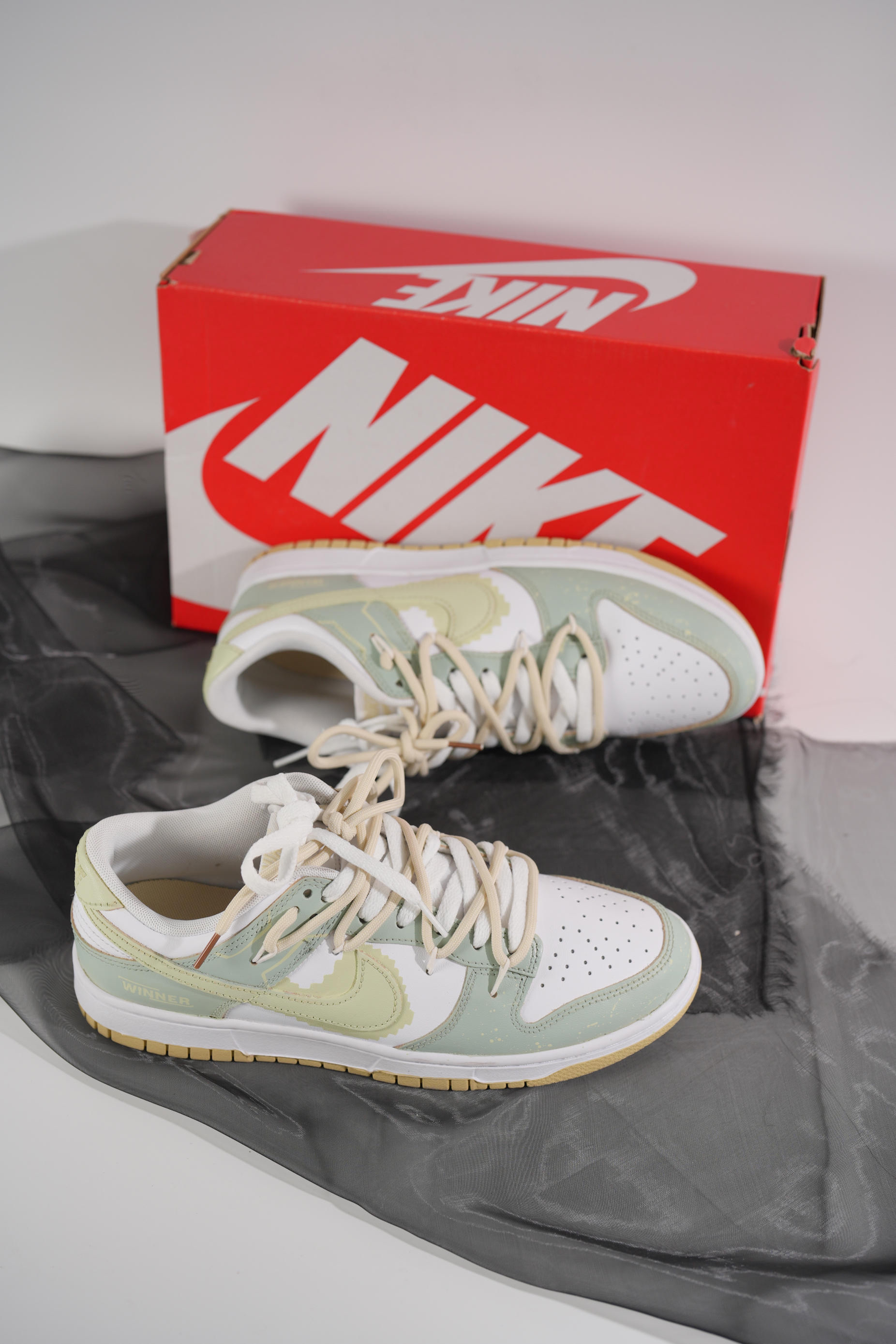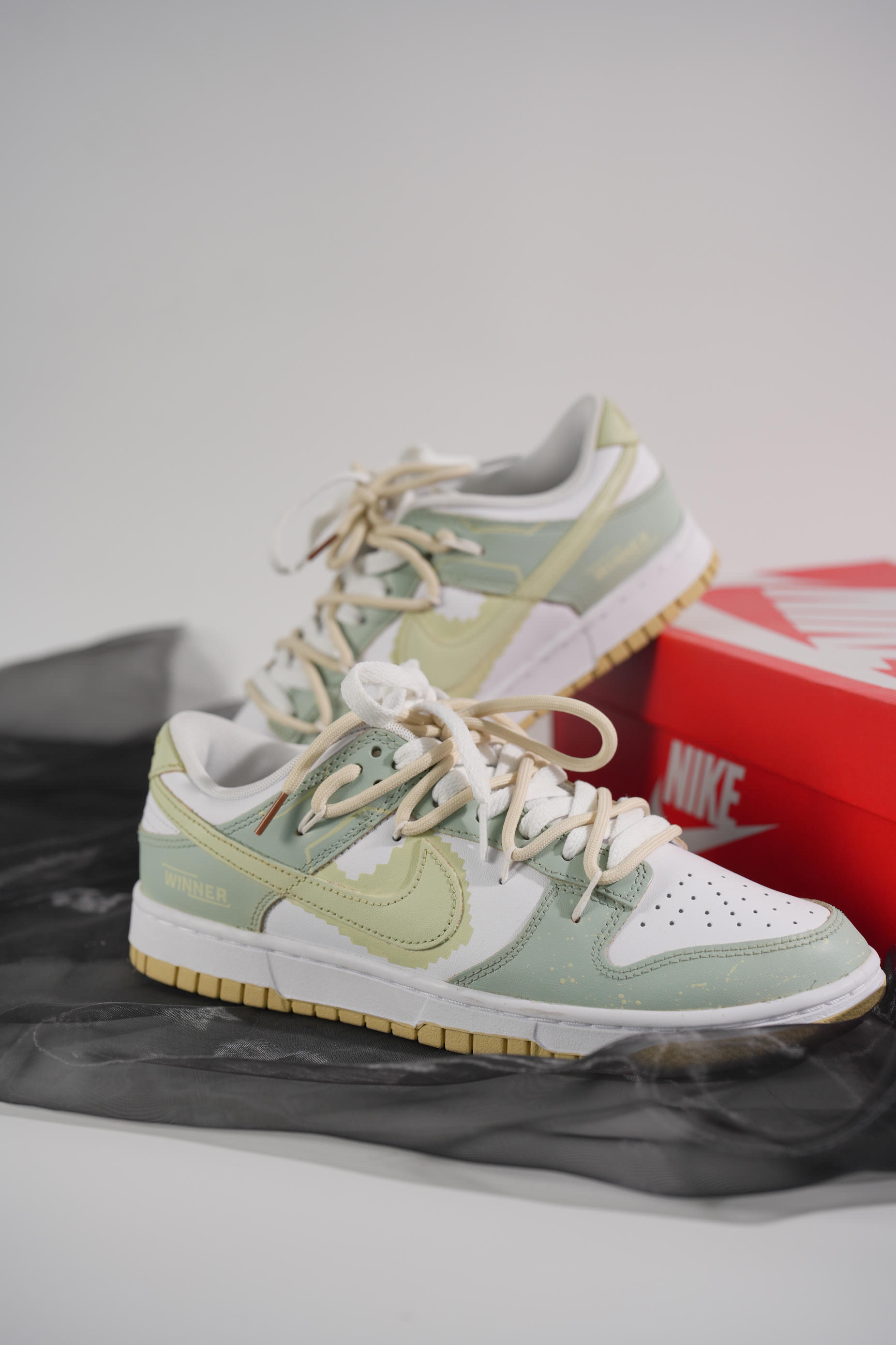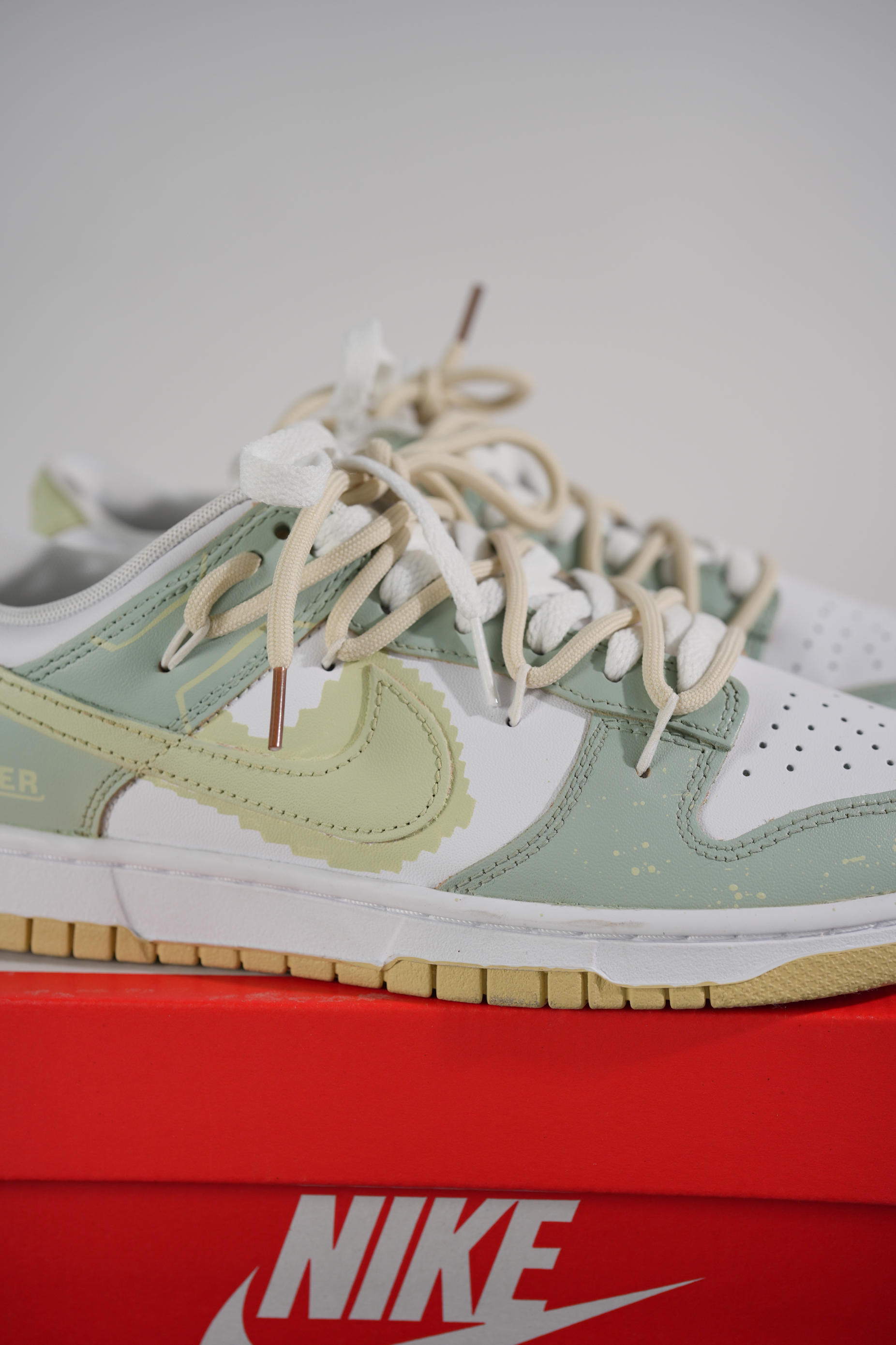 这双由米白色dunk进行二次创作的球鞋真的让我眼前一亮 整体鞋身以为淡绿色主,增添更多设计细节,赋予了鞋子独有的灵魂,打破了原先基础款dunk的单调 鞋子最大的亮点莫过于在swoosh周围添加像素设计,与双鞋带解构设计相得益彰,使鞋子更具层次感、高级感。 “像素世界”春夏出街必备,脚感舒适,减龄百搭,对于还在寻找合适球鞋的男生...