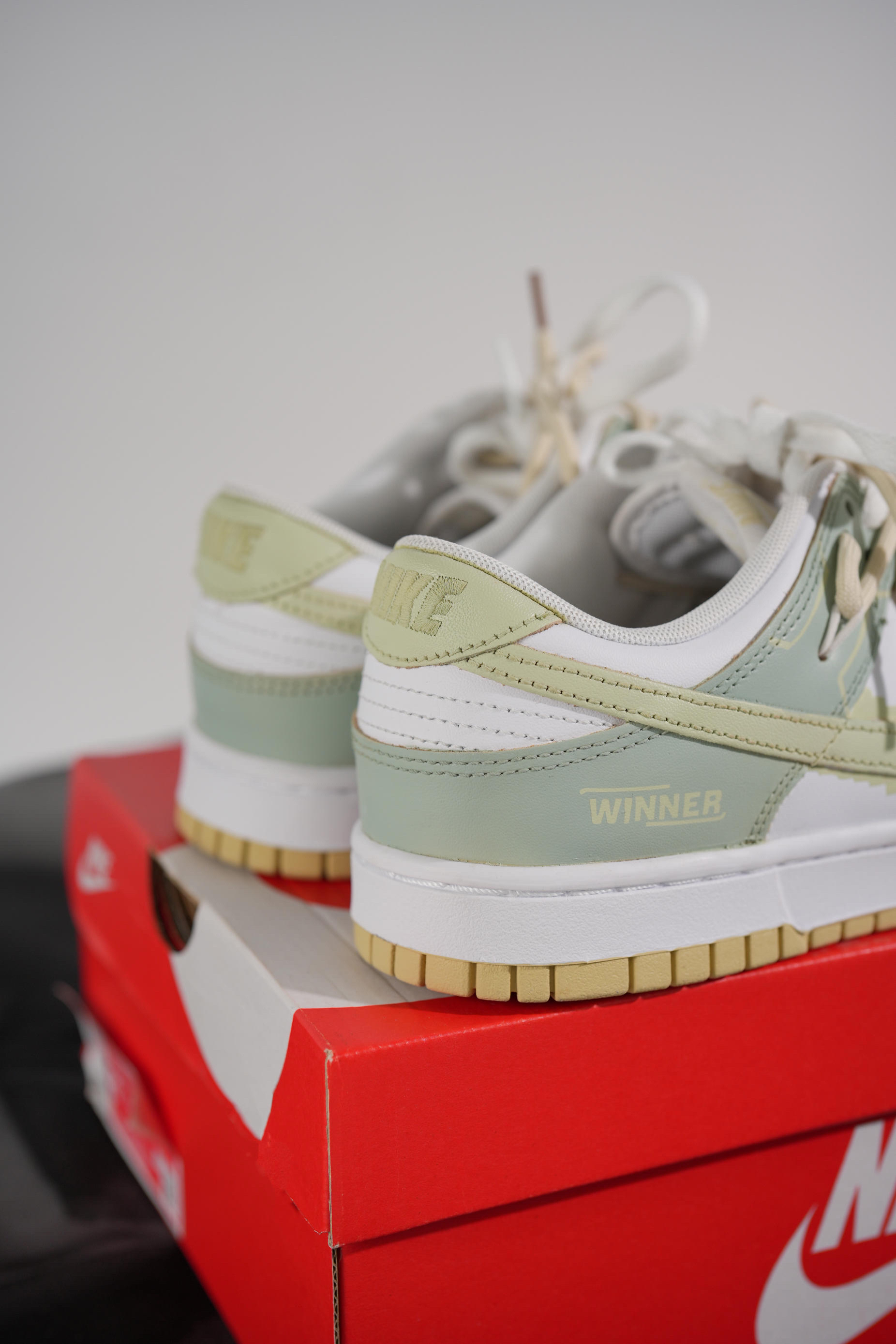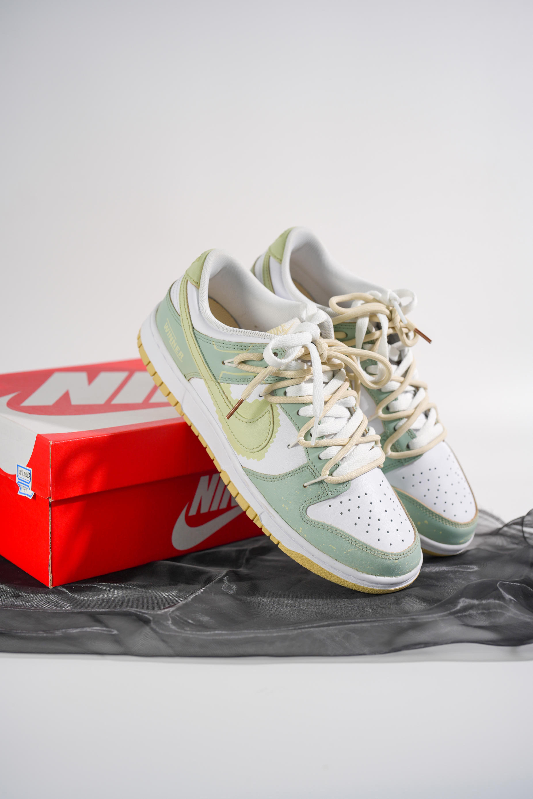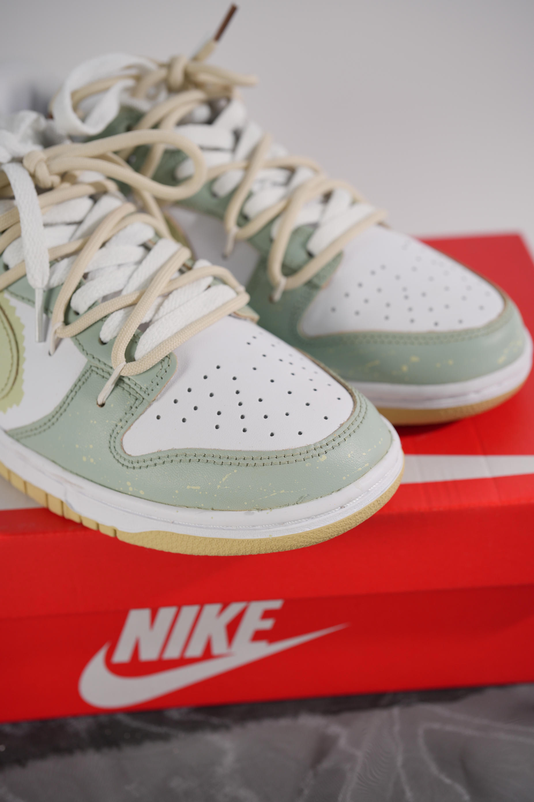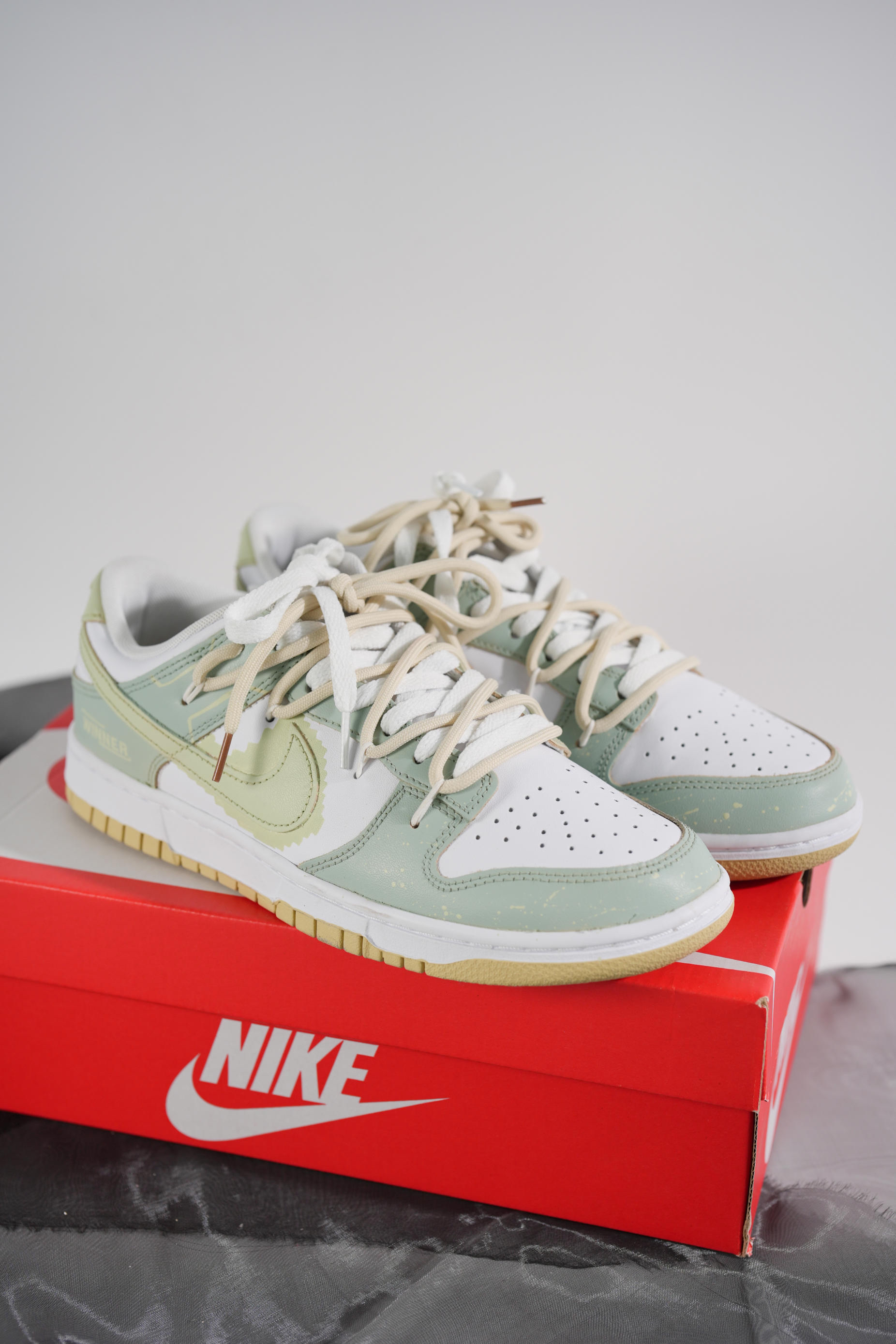 这双由米白色dunk进行二次创作的球鞋真的让我眼前一亮 整体鞋身以为淡绿色主,增添更多设计细节,赋予了鞋子独有的灵魂,打破了原先基础款dunk的单调 鞋子最大的亮点莫过于在swoosh周围添加像素设计,与双鞋带解构设计相得益彰,使鞋子更具层次感、高级感。 “像素世界”春夏出街必备,脚感舒适,减龄百搭,对于还在寻找合适球鞋的男生...