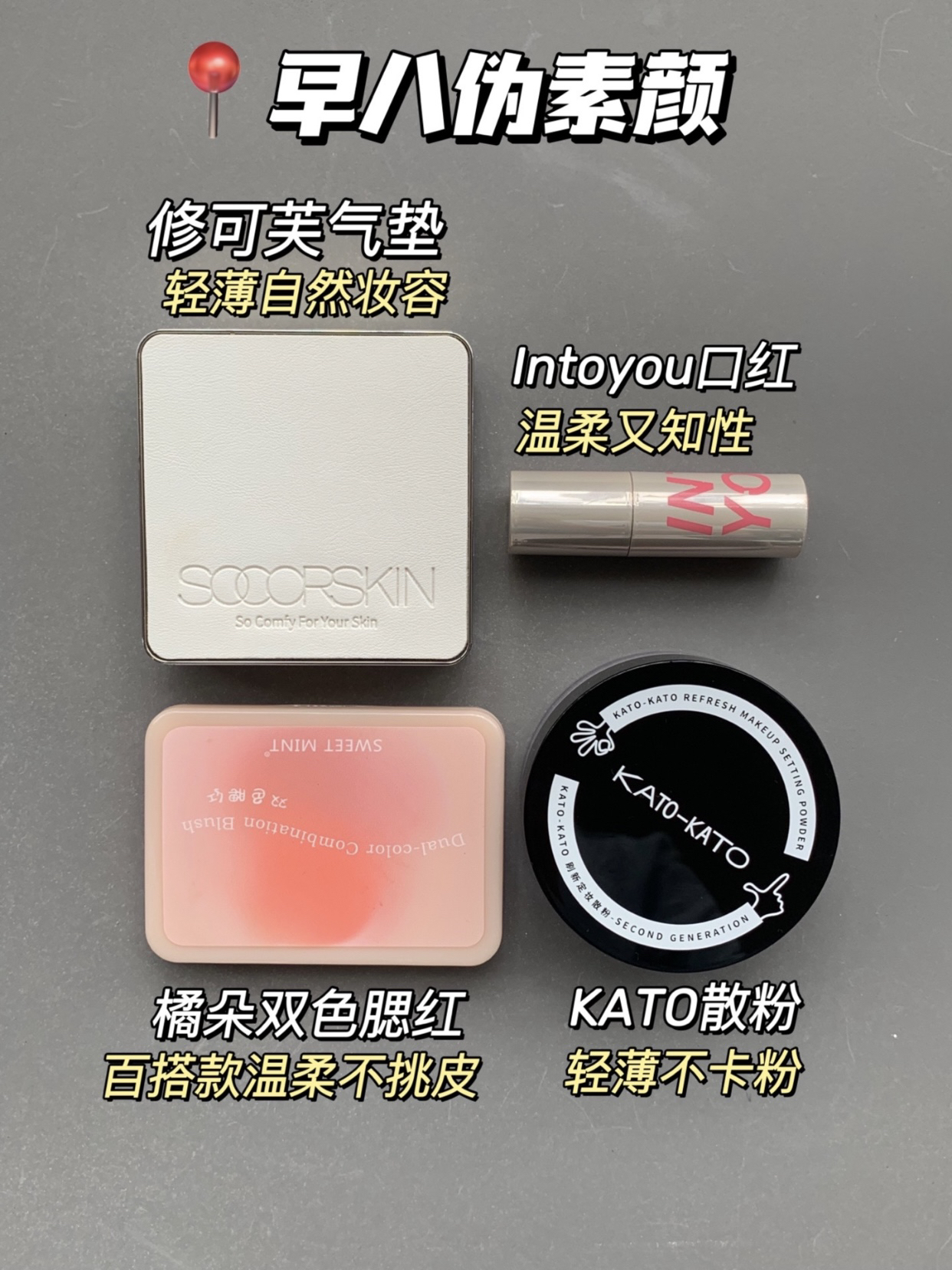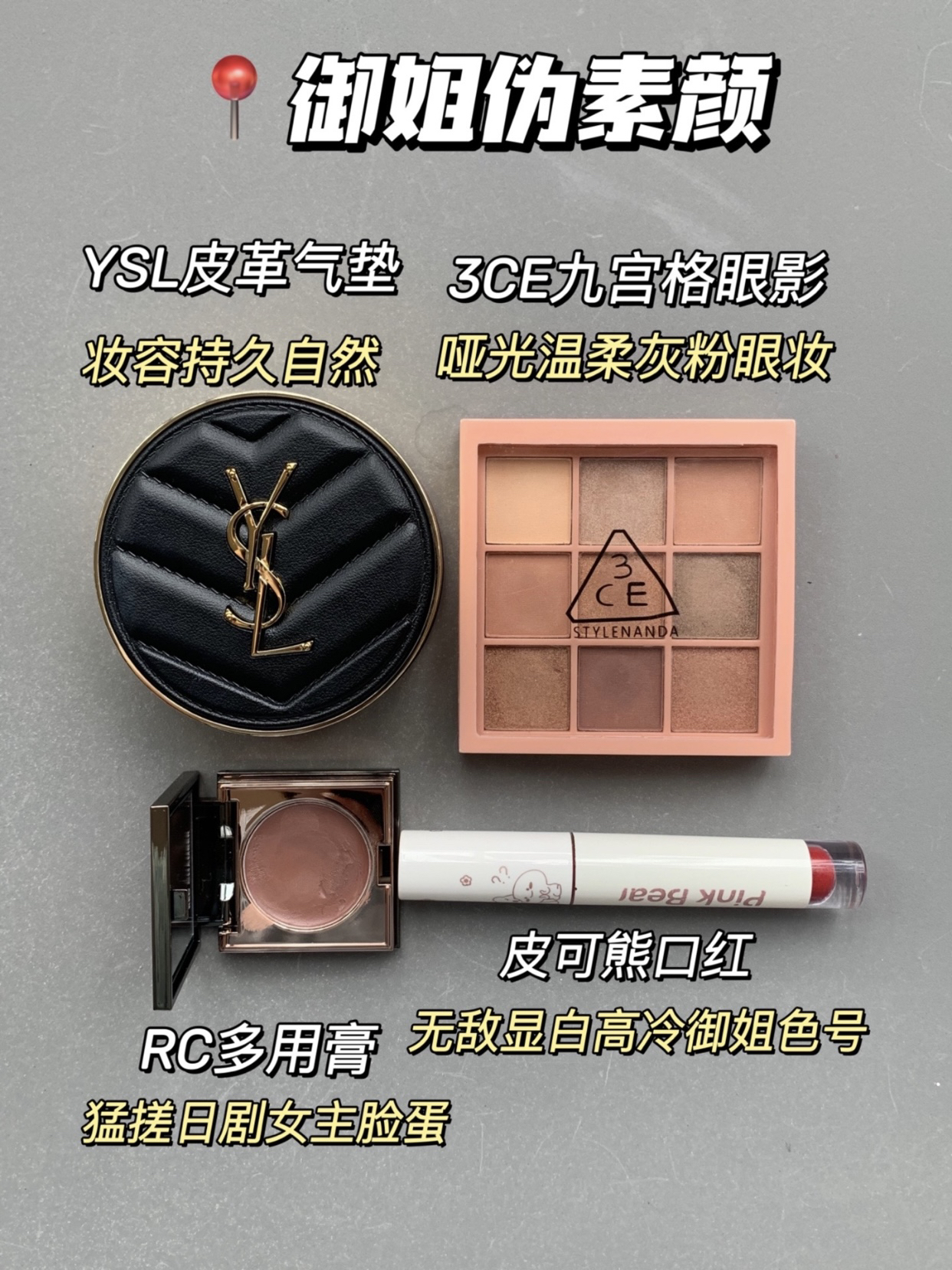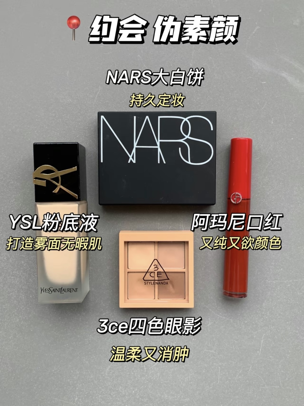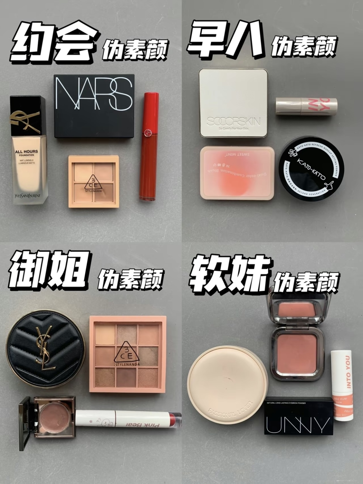 你懂5min快速撸妆出门的感觉吗? 简直快乐的不要不要~~~ 今天给姐妹们整理下! 平时我应对不同场合的伪素颜四件套这几个组合可以说我常用的搭子 ①约会伪素颜 YSL粉底液-NARS粉饼-3CE四宫格眼影-阿玛尼 口红 2早八伪素颜 修可芙气垫-橘朵腮红-intoyou口红-kato散粉 3御姐仂秦顔 YSL气垫-REDCHAMBER多用膏-3CE九宫格眼影 皮可熊口红 4 软妹伪素颜 PL看不见...