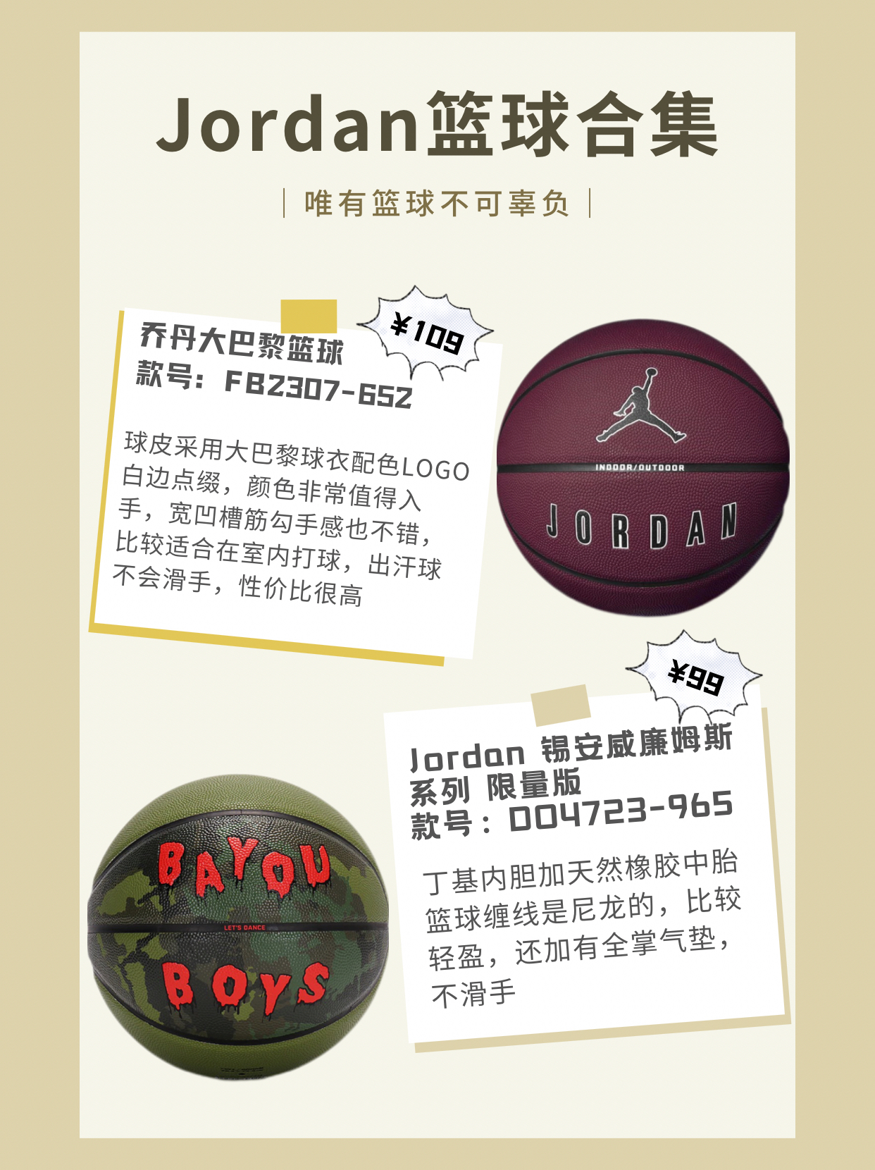 本篇笔记关联了Jordan 锡安威廉姆斯系列 限量版 比赛 训练 实战 手感之王 室内外 耐磨 PU 篮球 DO4723 绿色、JORDAN 比赛 训练 耐磨 防滑 吸湿 室内外 PU 篮球 FB2305 FB2305-044、JORDAN 比赛 训练 耐磨 防滑 吸湿 室内外 PU 篮球 FB2305 FB2305-427等商品,为用户提供真实的使用体验和购买参考。