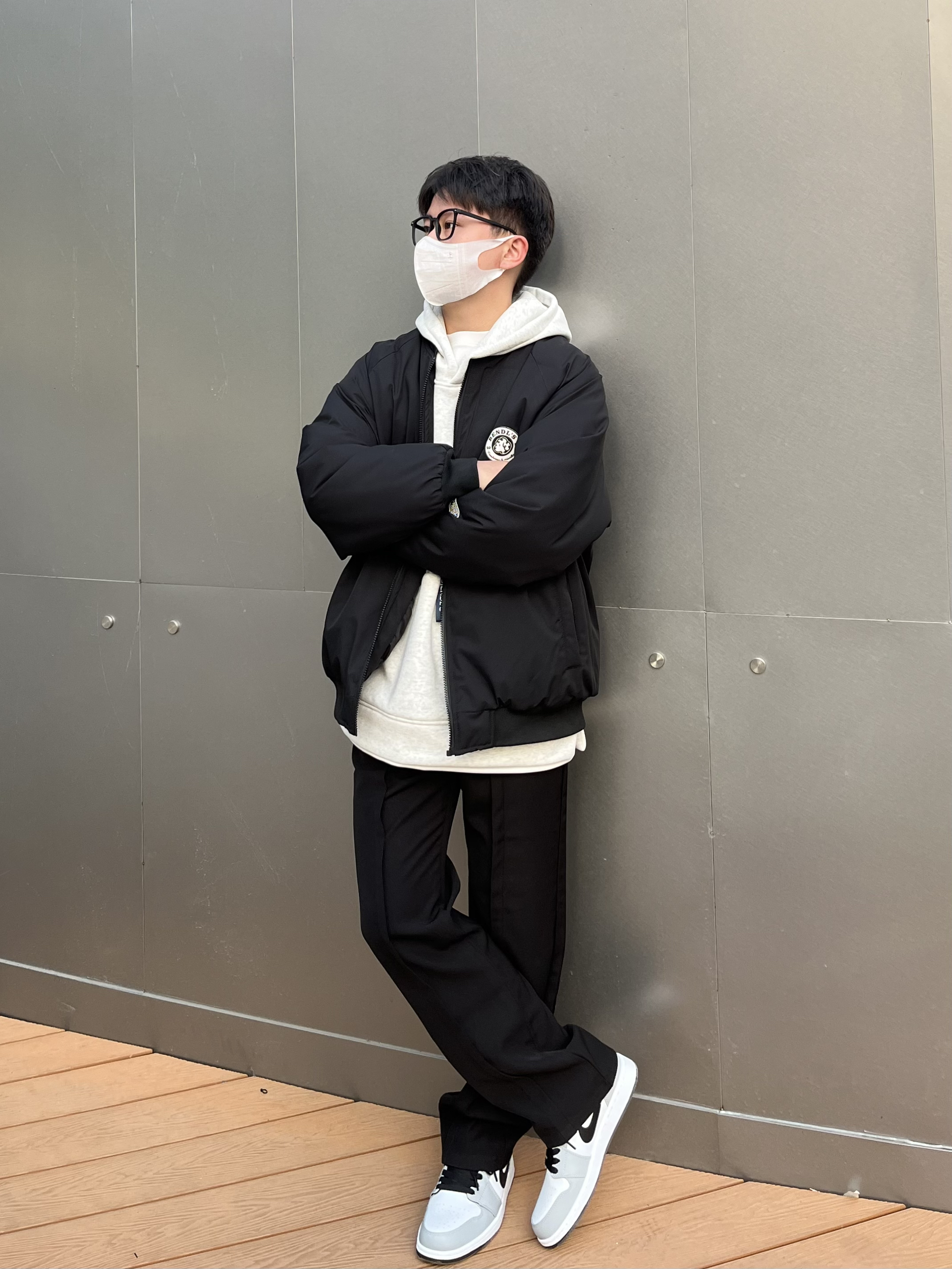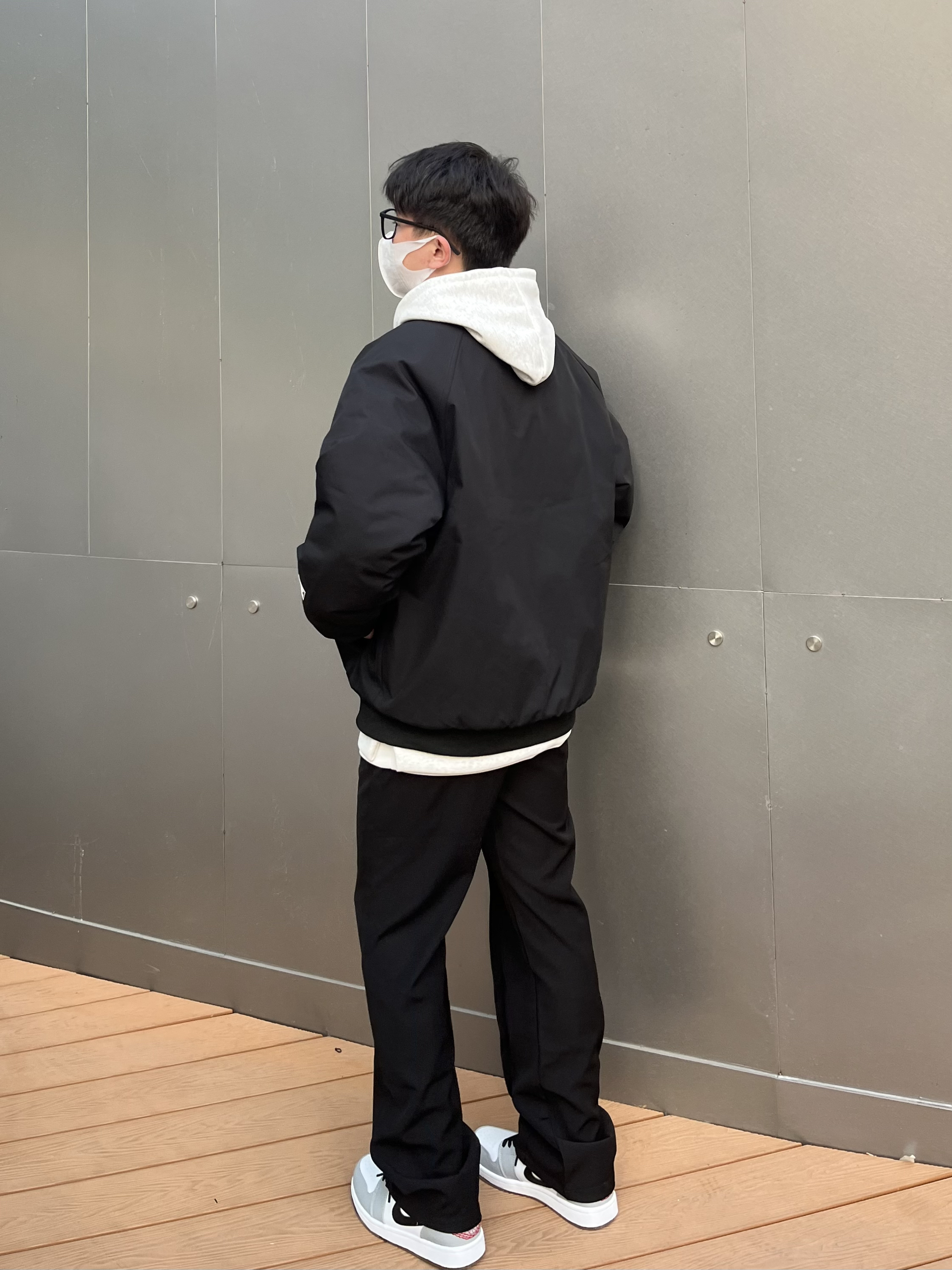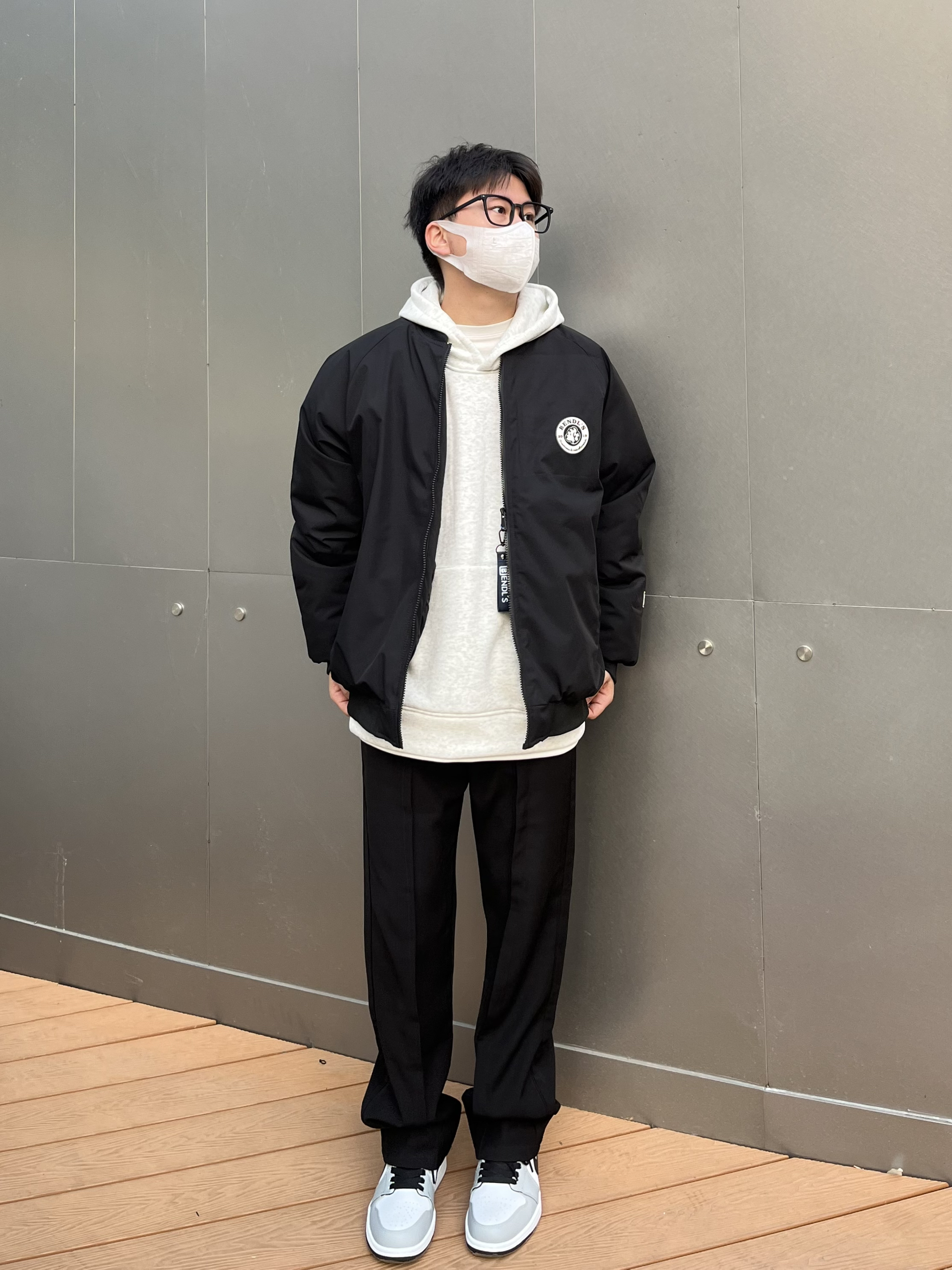 美式棒球服夹克 加厚夹棉厚度完全可以抗冻 短宽版型拉长身材比例显高显身材 不挑人✔️ 内里搭配灰色卫衣 叠穿增加层次感 视觉丰富 裤子选择一条高级感拉满的黑色休闲西裤⚫️ 中缝贴边更显设计 直筒宽松的版型很百搭🤓 裤裆拉高4cm更加显高显身材 四季可穿舒服 鞋子搭配的是德训 生胶大底复古耐磨超好穿