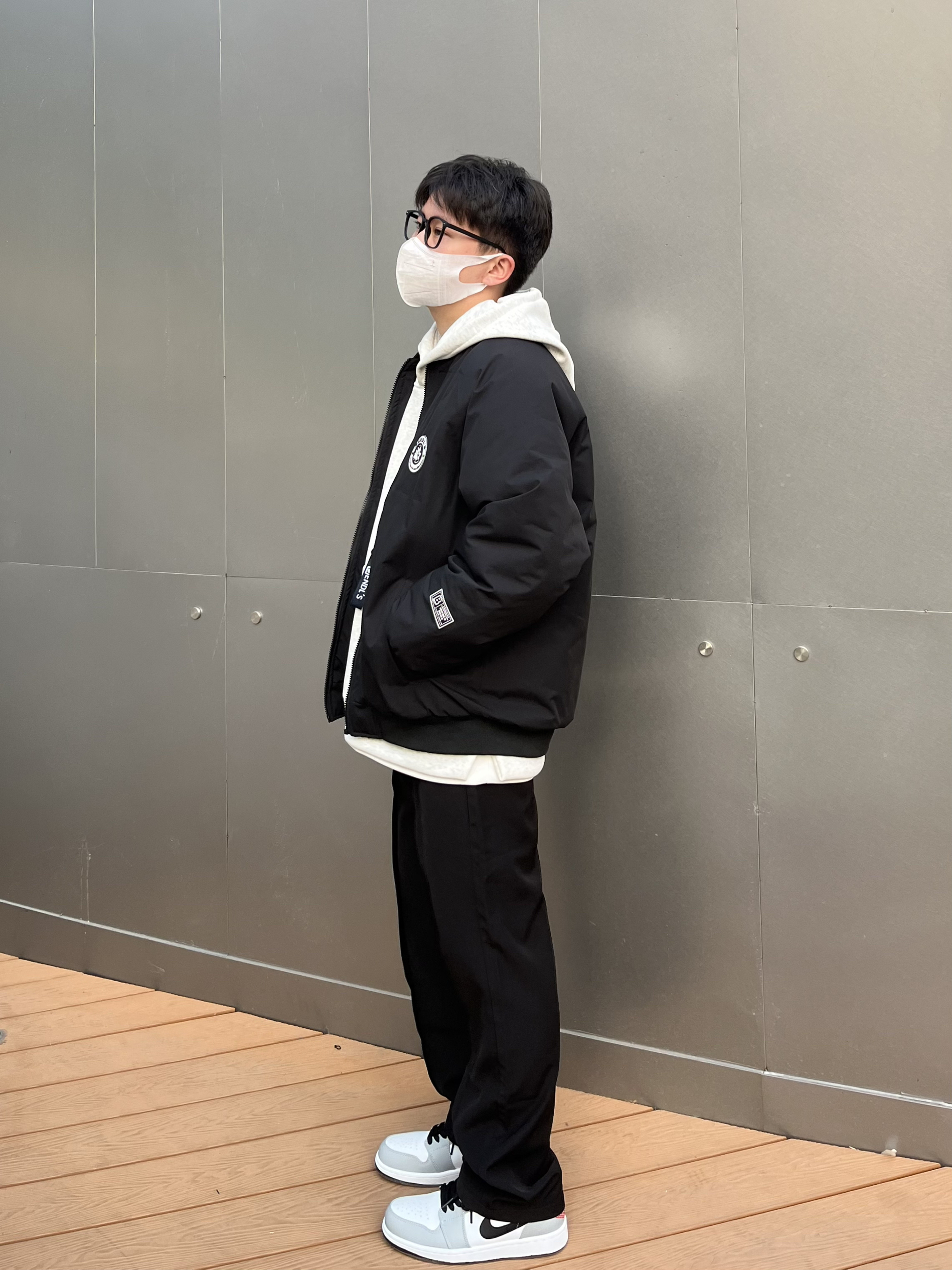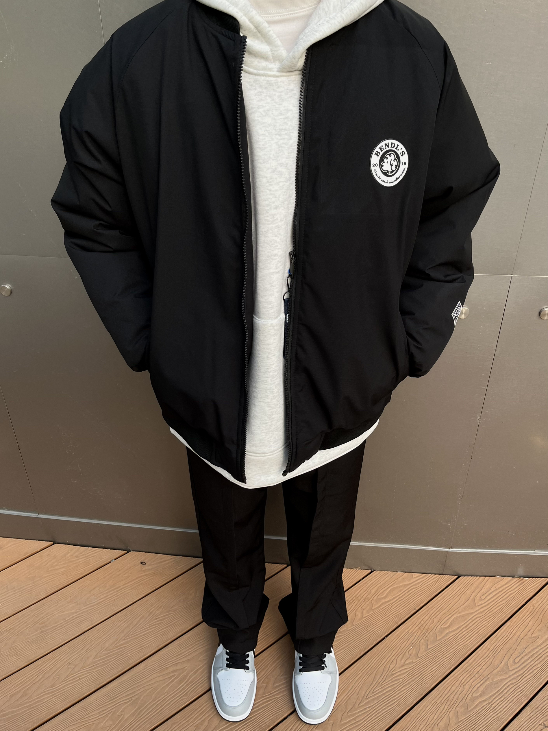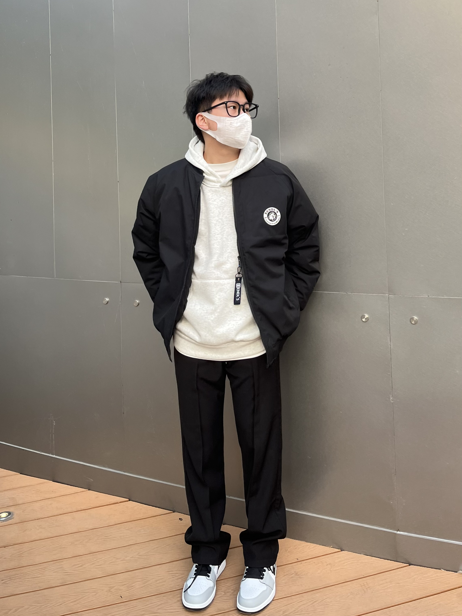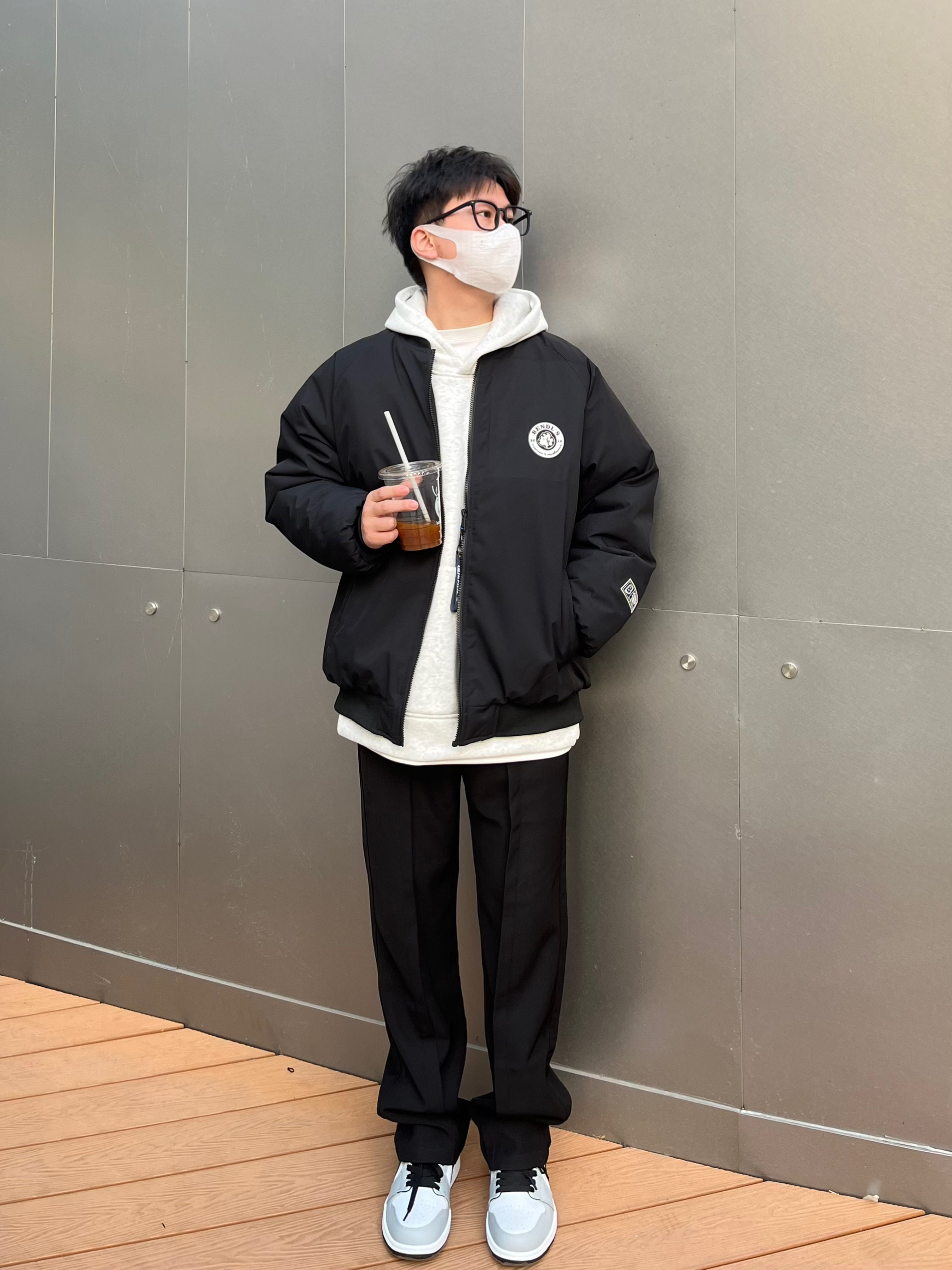 美式棒球服夹克 加厚夹棉厚度完全可以抗冻 短宽版型拉长身材比例显高显身材 不挑人✔️ 内里搭配灰色卫衣 叠穿增加层次感 视觉丰富 裤子选择一条高级感拉满的黑色休闲西裤⚫️ 中缝贴边更显设计 直筒宽松的版型很百搭🤓 裤裆拉高4cm更加显高显身材 四季可穿舒服 鞋子搭配的是德训 生胶大底复古耐磨超好穿