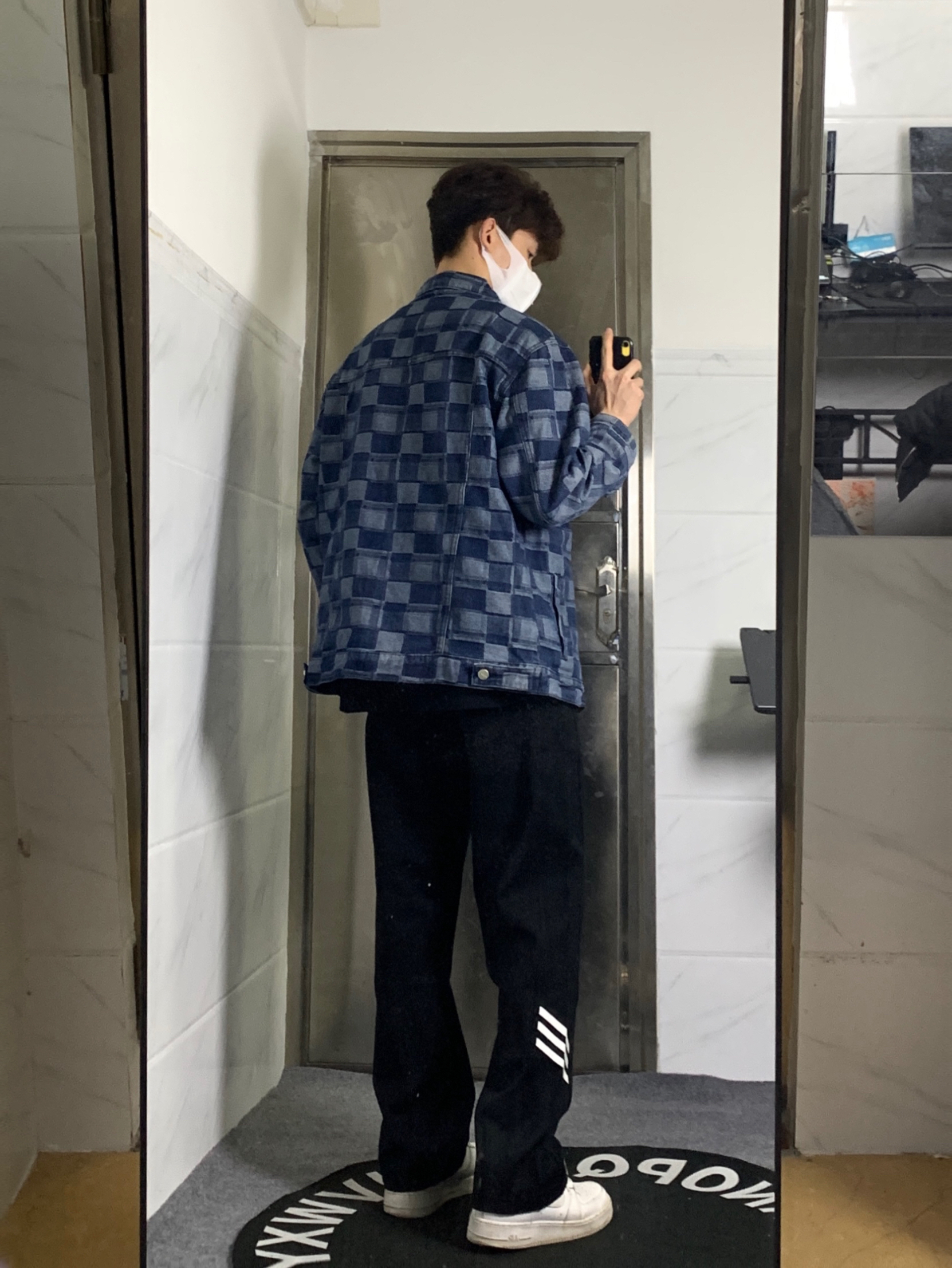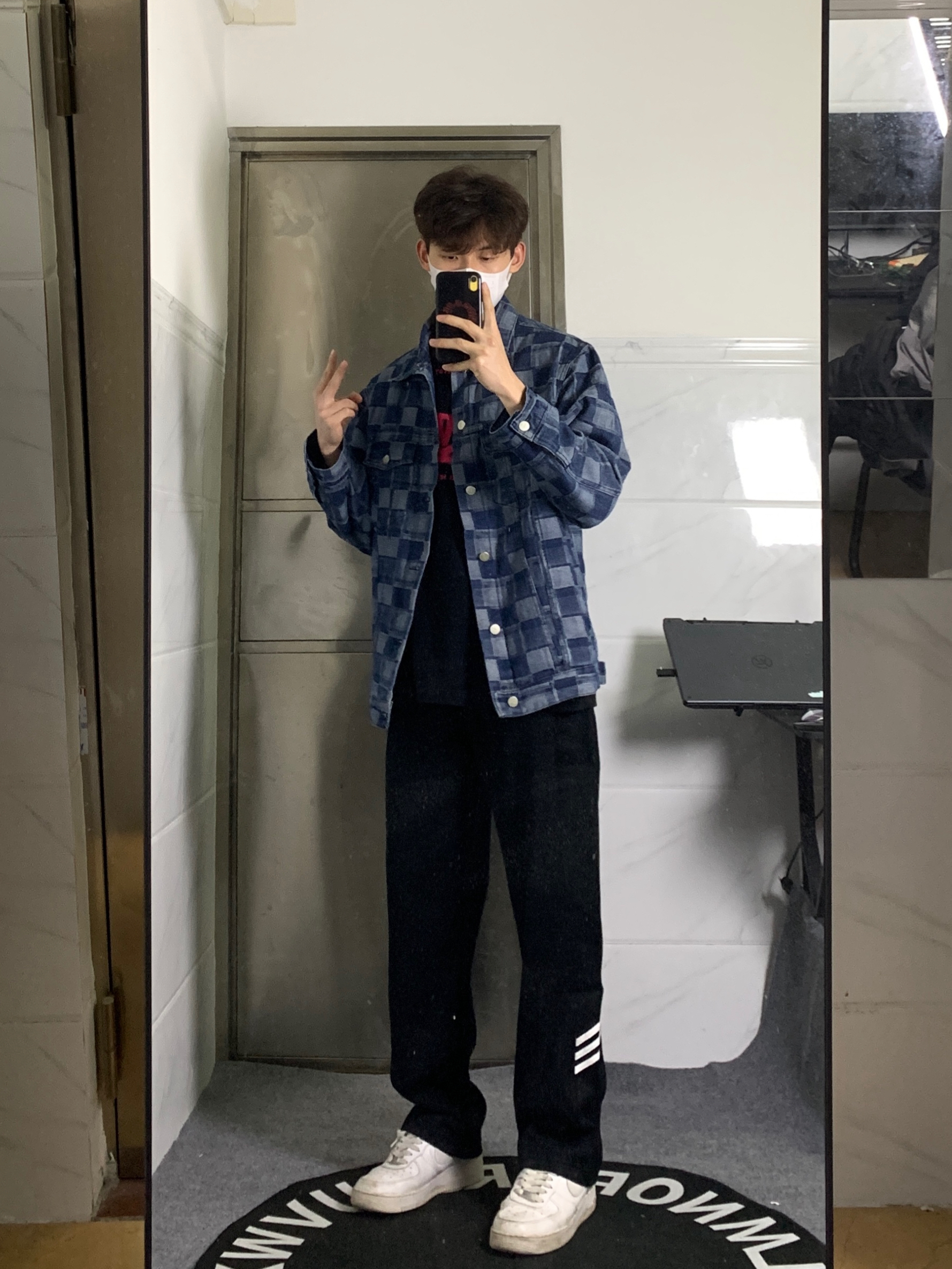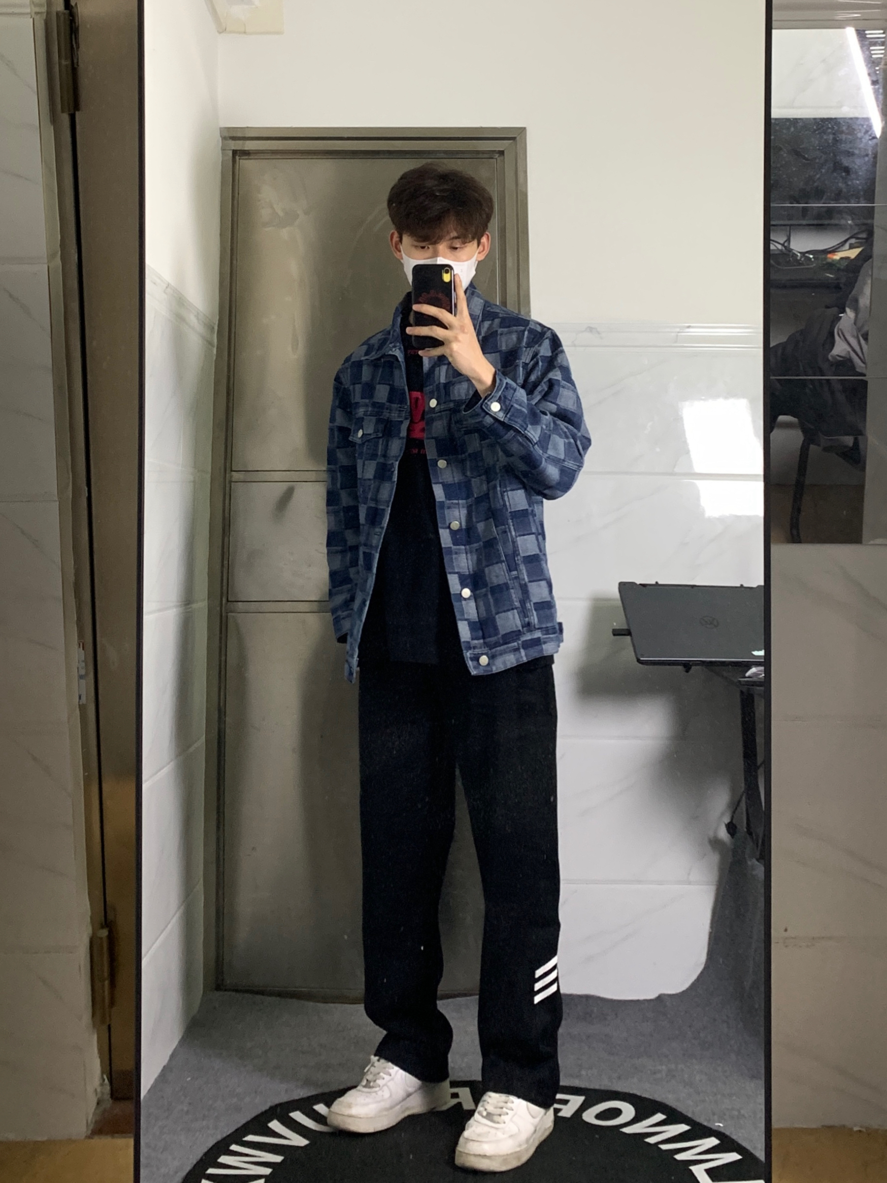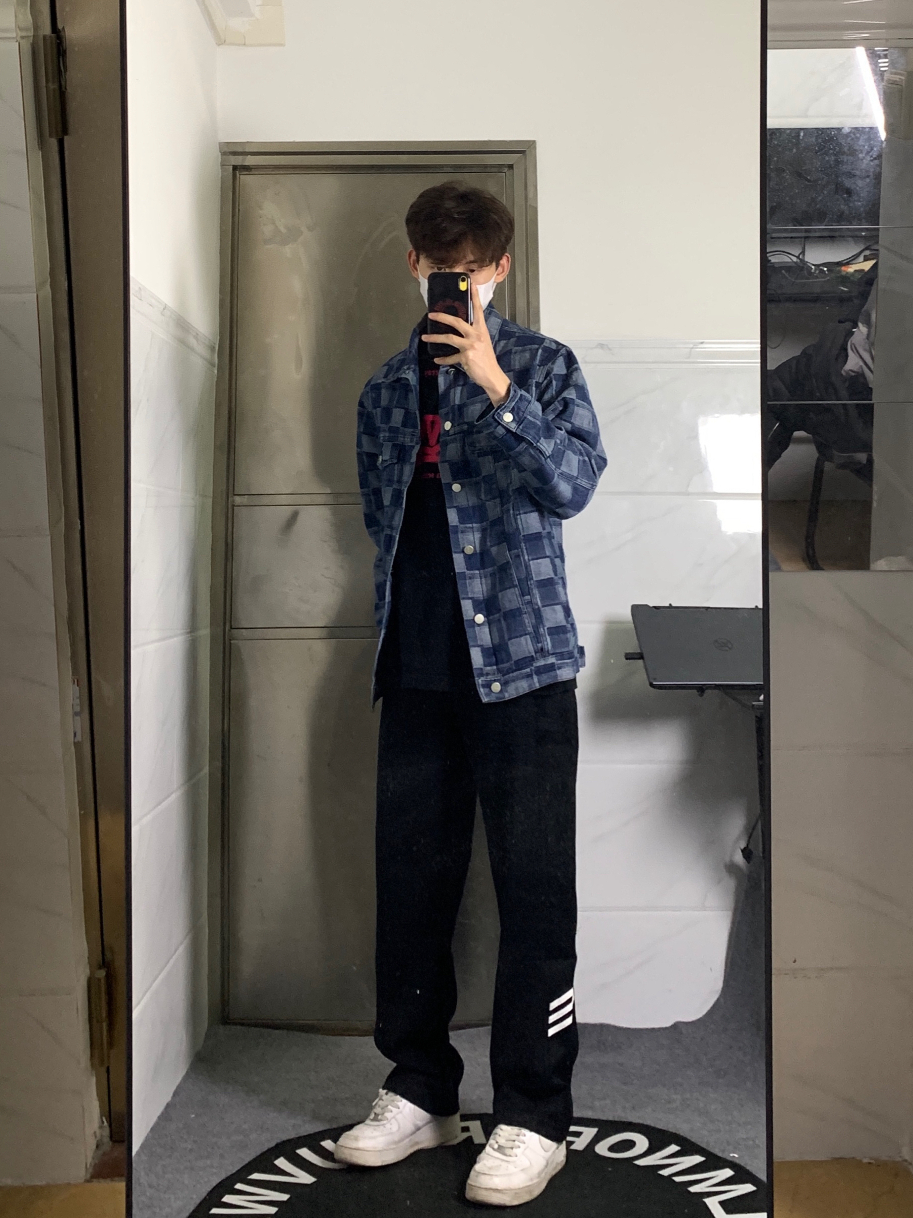 👔上衣是来自HELIPORT停机坪的满印夹克 整体宽松版型,面料厚实有型,上身蛮挺括。 格子深浅拼接设计个性十足✅ 👖裤子是一条直筒侧边条纹设计的黑色休闲裤 直筒的版型上身显瘦显腿长,上身也是非常有质感✨ 👟鞋子是nike非常经典百搭的空军一号小白鞋