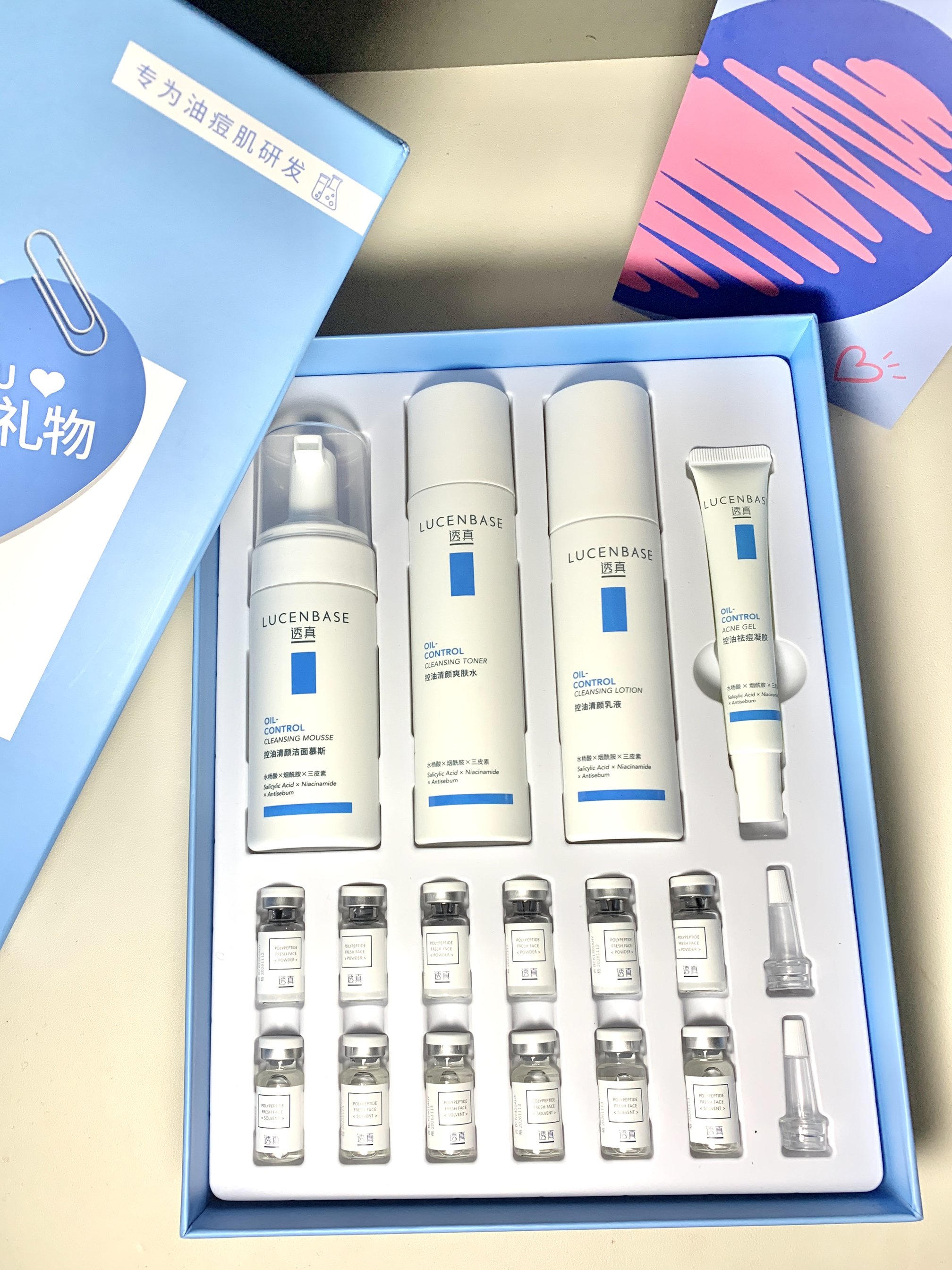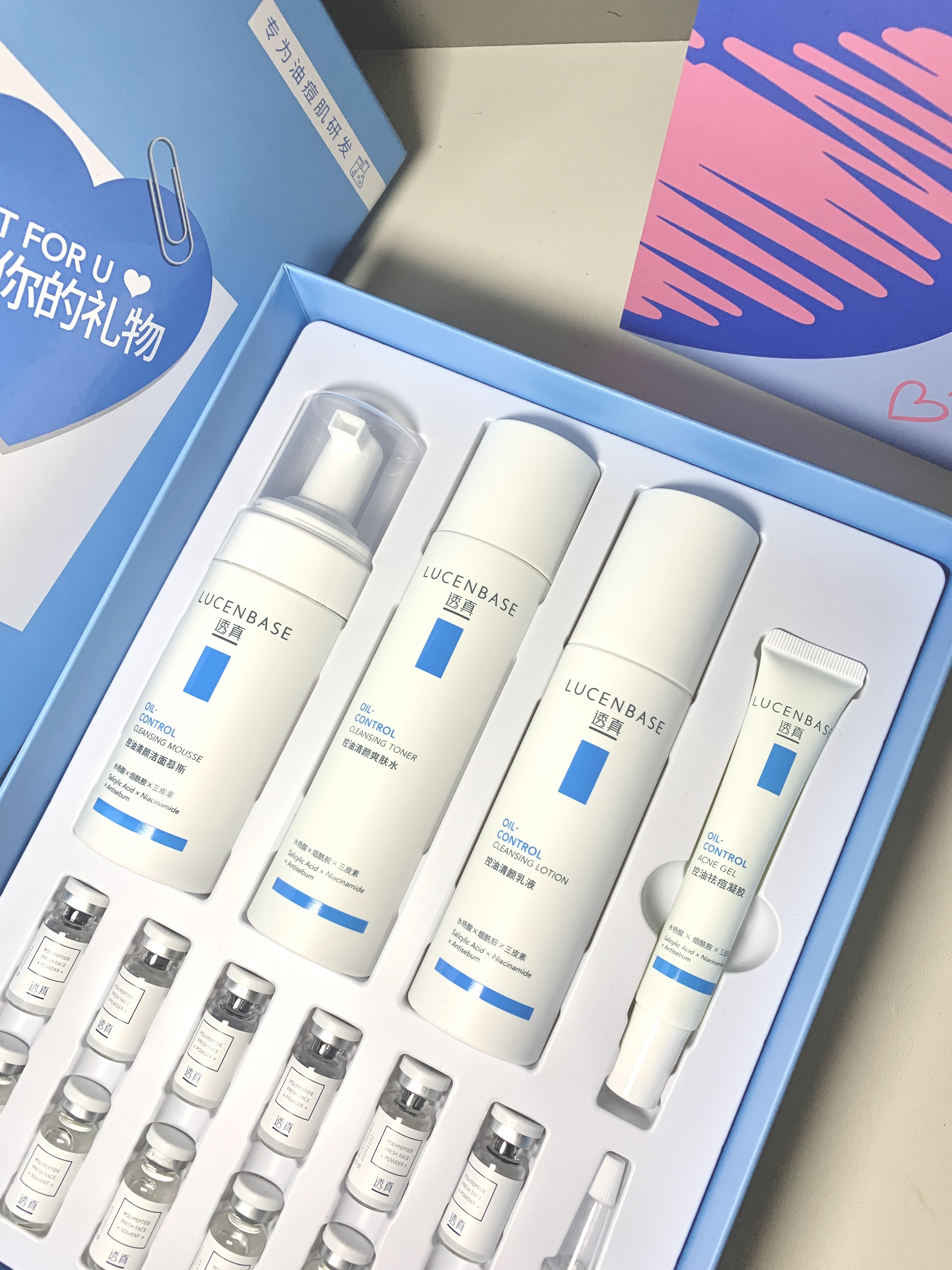 选来选去还是给女朋友选择了透真这个祛痘护肤礼盒 包装很有仪式感 里面有一整套护肤洁面的产品 还有祛痘凝胶和冻干粉 一套满足了油痘肌日常需求 而且百元价格对学生党也是非常友好滴~