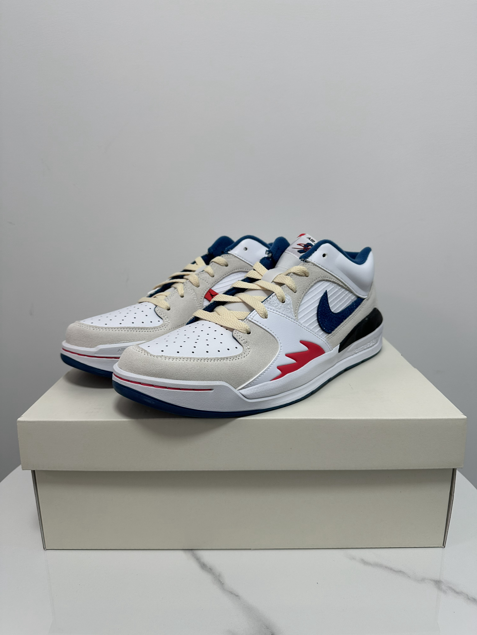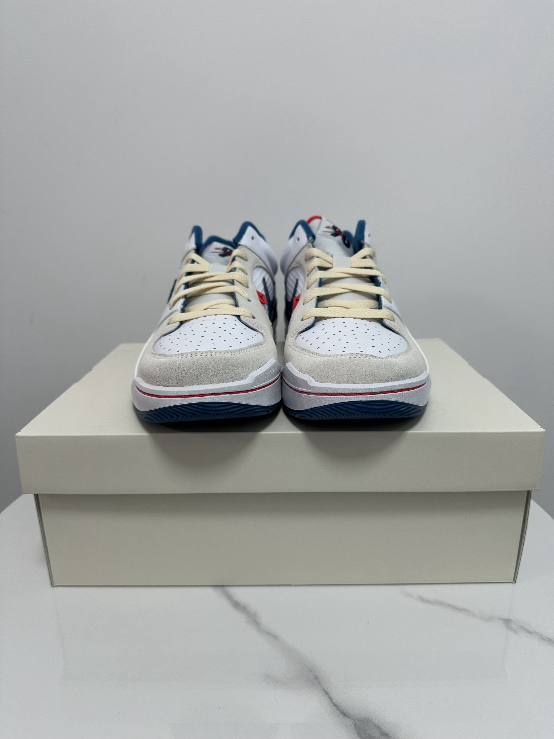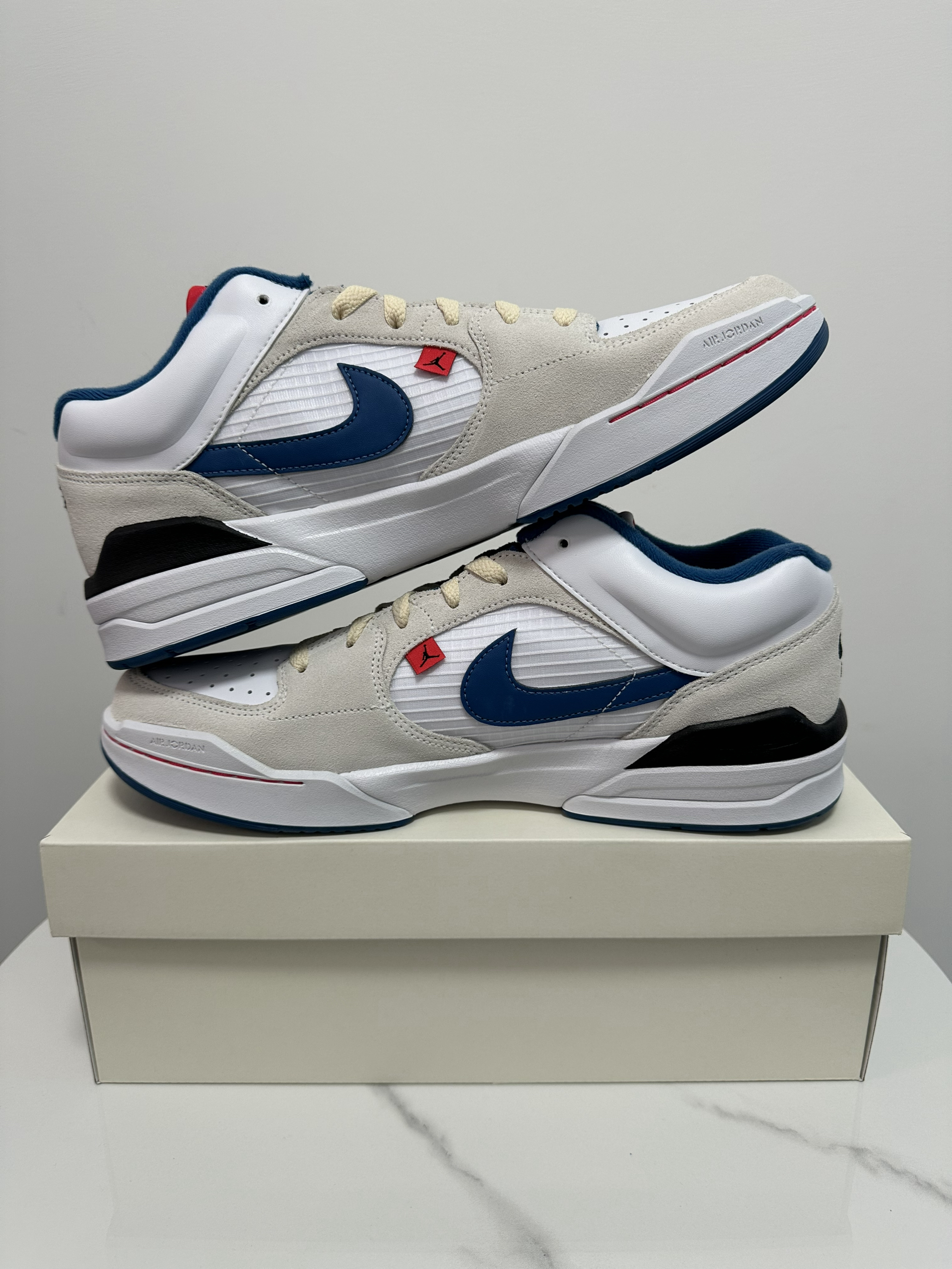 今天给大家分享的是Jordan的新款板鞋 JORDAN STADIUM 90 白蓝 1️⃣作为Jordan的新款板鞋,外底纹路致敬Aj1,鞋身火焰细节和后跟SWOOSH致敬Aj5,自己抄自己,还是勾子会玩。 2️⃣鞋身整体以灰白为主,辅以蓝色红色点缀,既不单调也好搭配,皮革、麂皮、网布等多种面料的运用让鞋子整体更有层次感和质感。 3️⃣中底采用Nike Air缓震配置,整体脚感有所提升,平时通勤没...