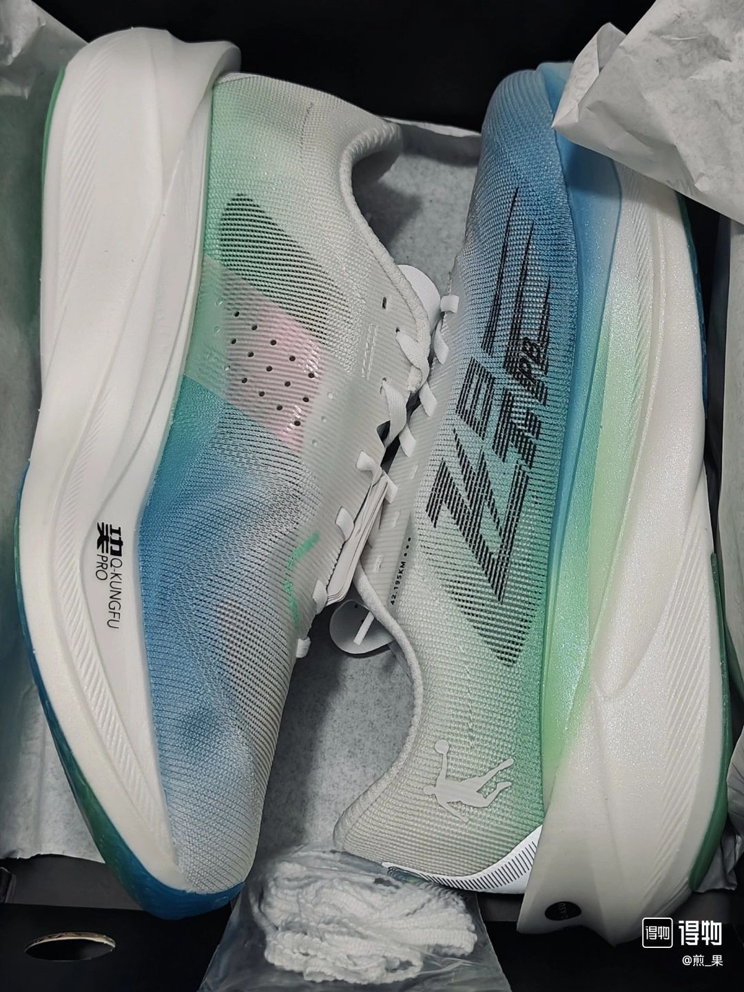 极光配色真的帅死~Pb4 颜值上:极光配色,蓝色搭配绿色看起来很清爽,跑起来感觉有股夏天的感觉。性能上:鞋面为 TPEE 纱线,透气性拉满上脚感觉很舒适凉爽 中底采用了超临界发泡的奖 PRO 科技、静态脚感比较的韧弹、支撑缓震在线!全掌碳板的加入也使得刚性有所加强、推进力 or 抗扭转能 OK 。 外底耐磨 Q - ASU 大底、耐磨防滑 鞋面黑色飞影字体点缀真的帅 跑步脚感舒服,很轻。用他参加比...
