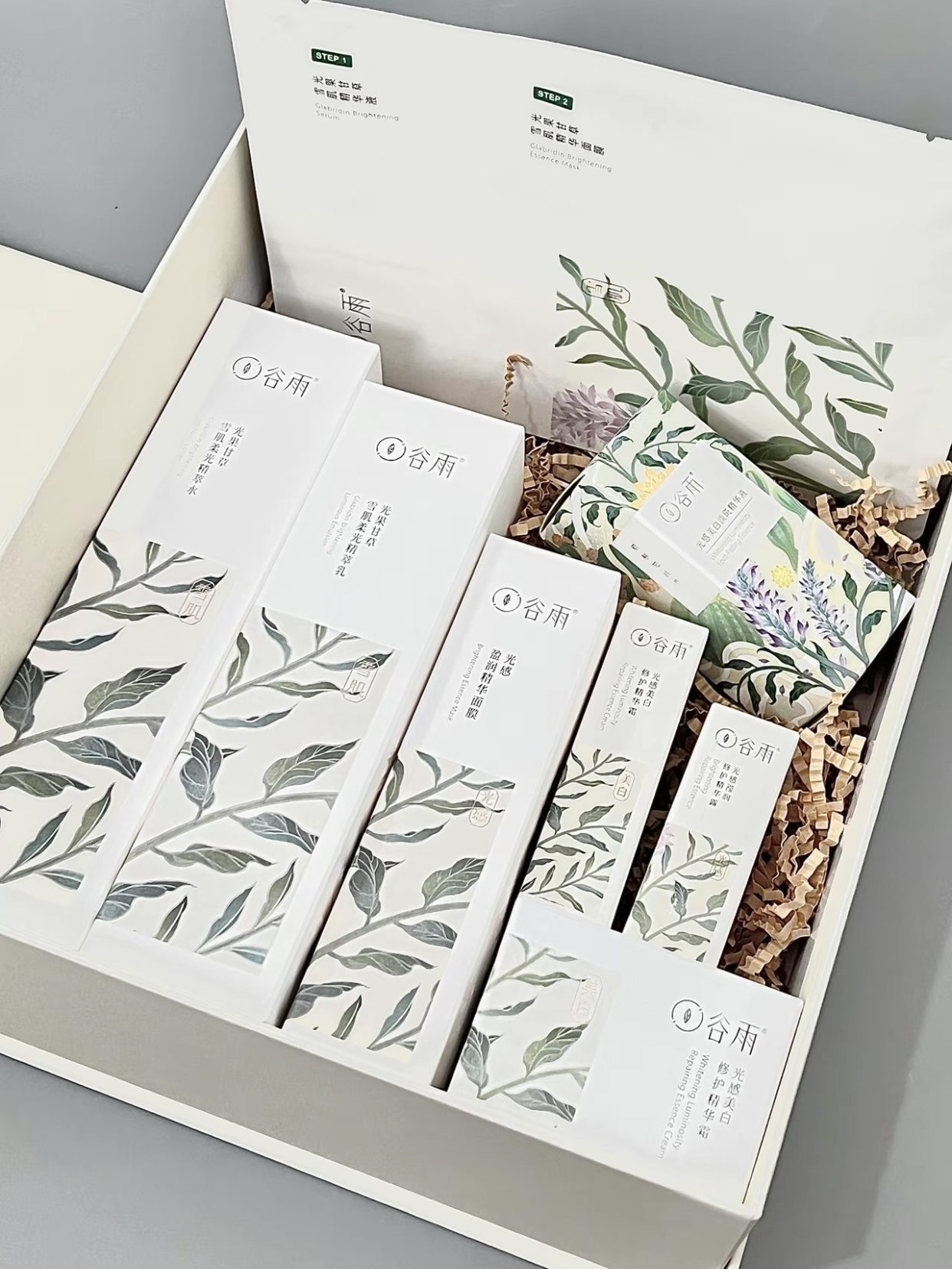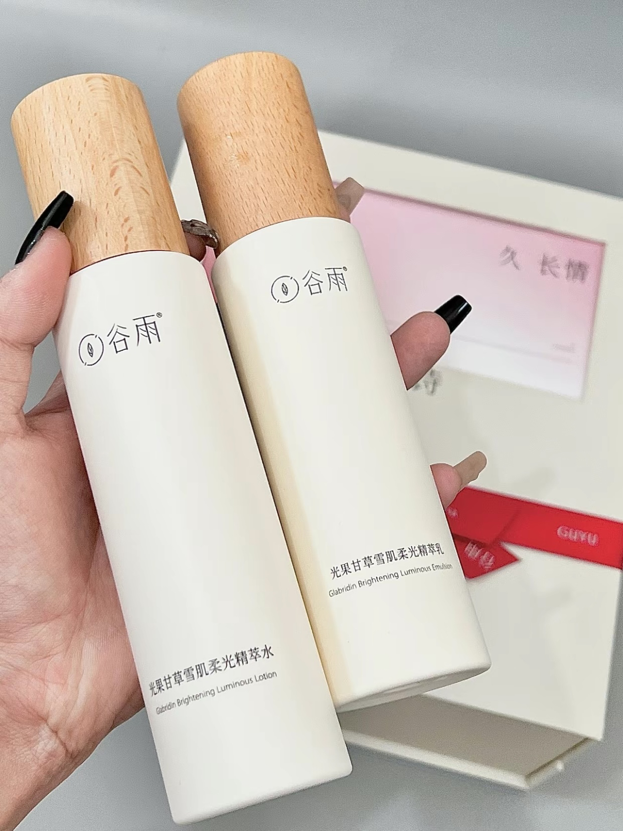 谷雨雪肌水乳礼盒的新包装真的太可了 国风氛围感满满送礼真的很拿得出手 水乳十美白奶罐面霜十精华十面膜 满足日常护肤需求 主要是针对皮暗黄提亮的补水保湿效果好上脸易推开好吸收 送人真的很不错 毕竟没有女生能拒绝变白嫩!