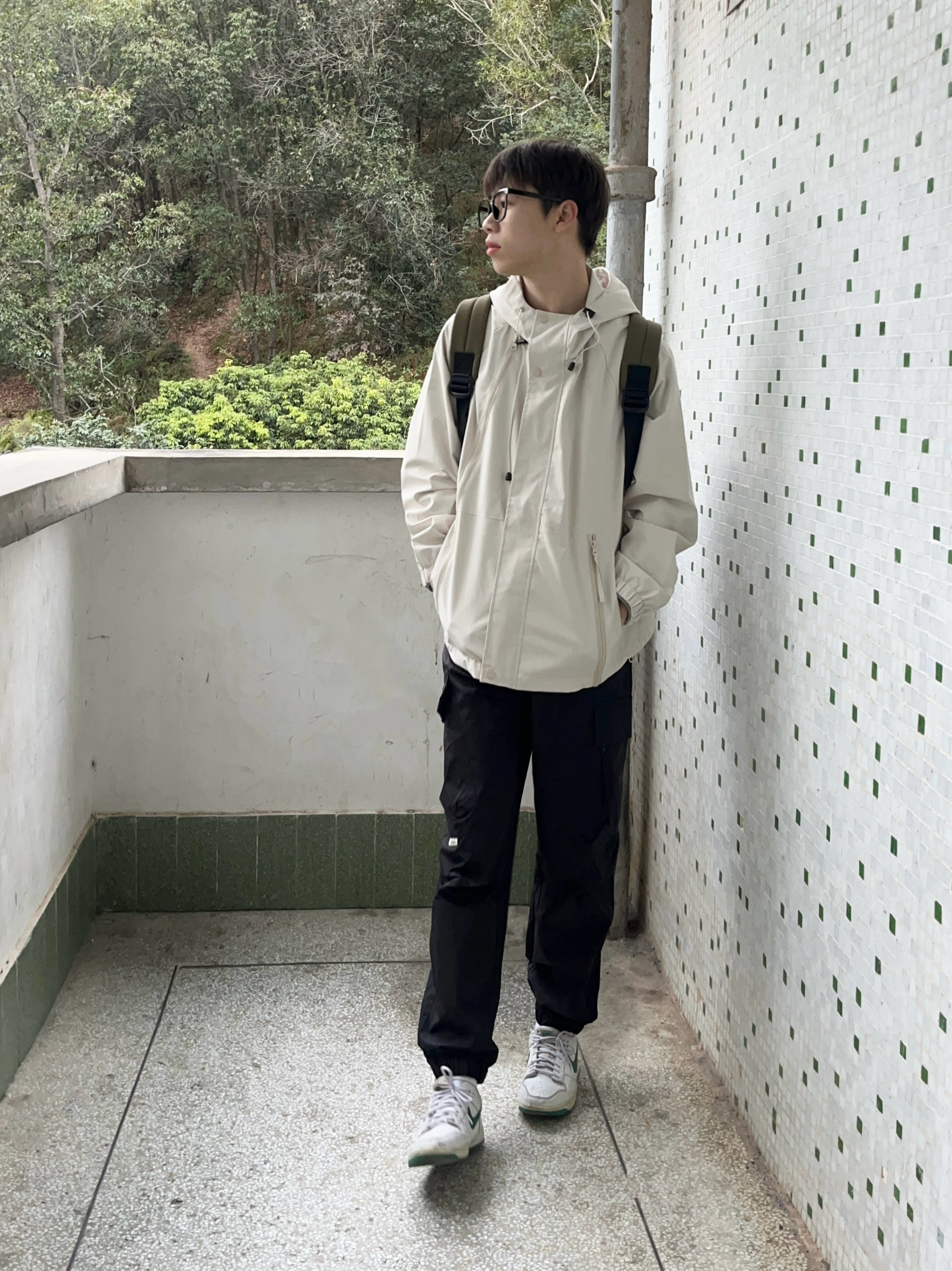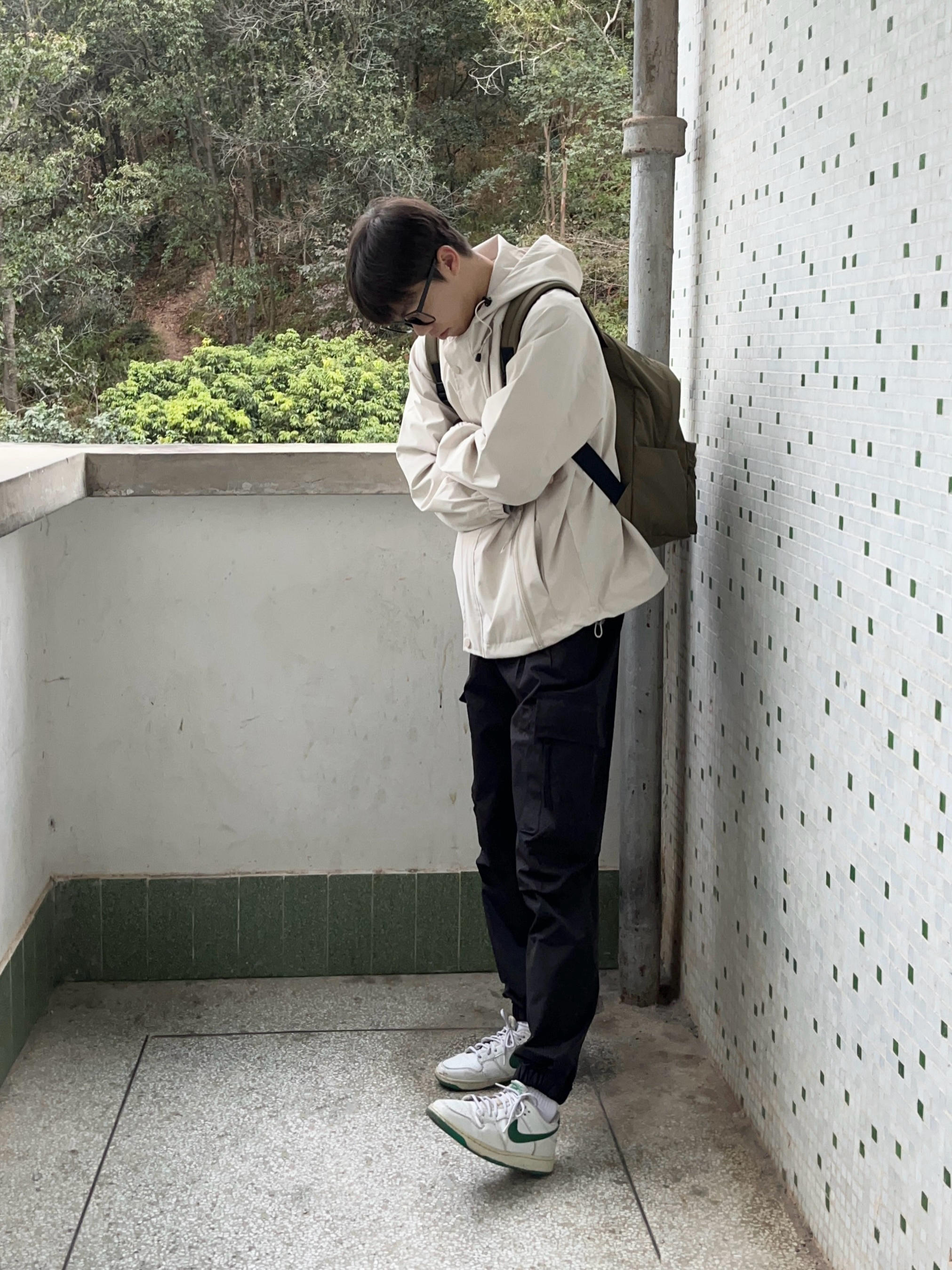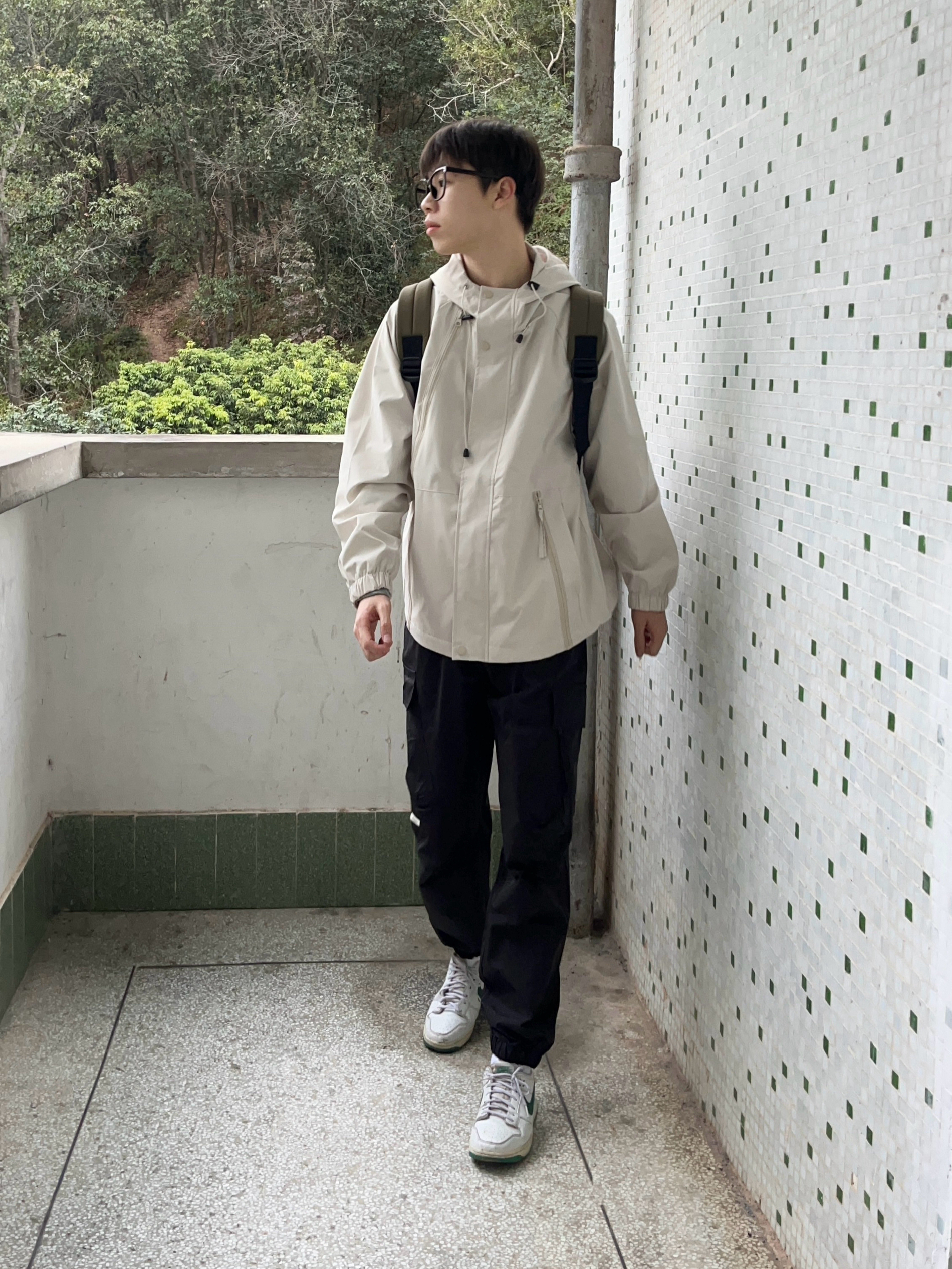 今日份穿搭分享look👀 衣服是eooy家的米杏色的山系冲锋夹克 版型防风又舒适 机能风满满🏝️ 再搭配一条eooy家的黑色工装直筒裤 穿上后无论是日常出街还是户外运动都很合适 最后橄榄绿休闲双肩包➕百搭板鞋点缀 这一套真的好适合出门🔥