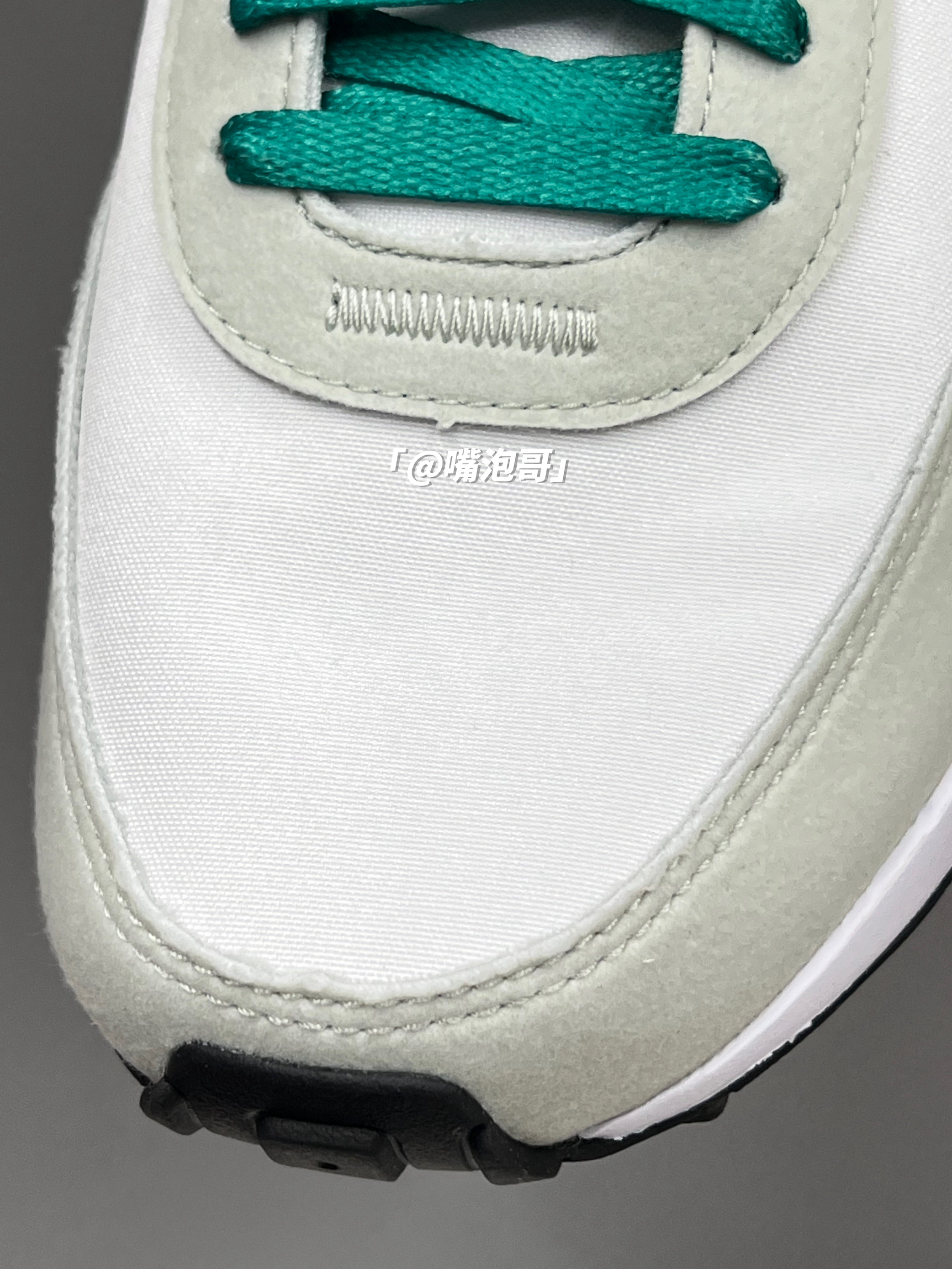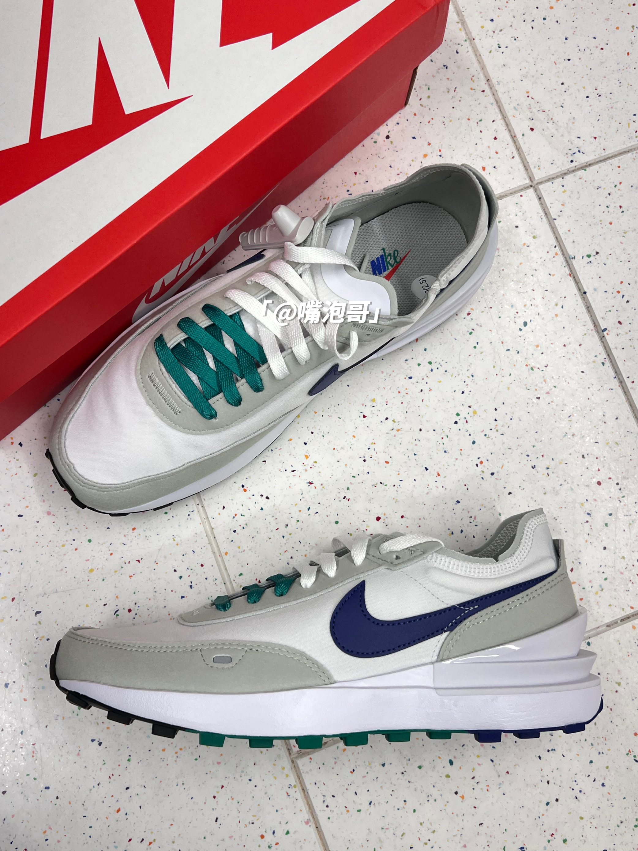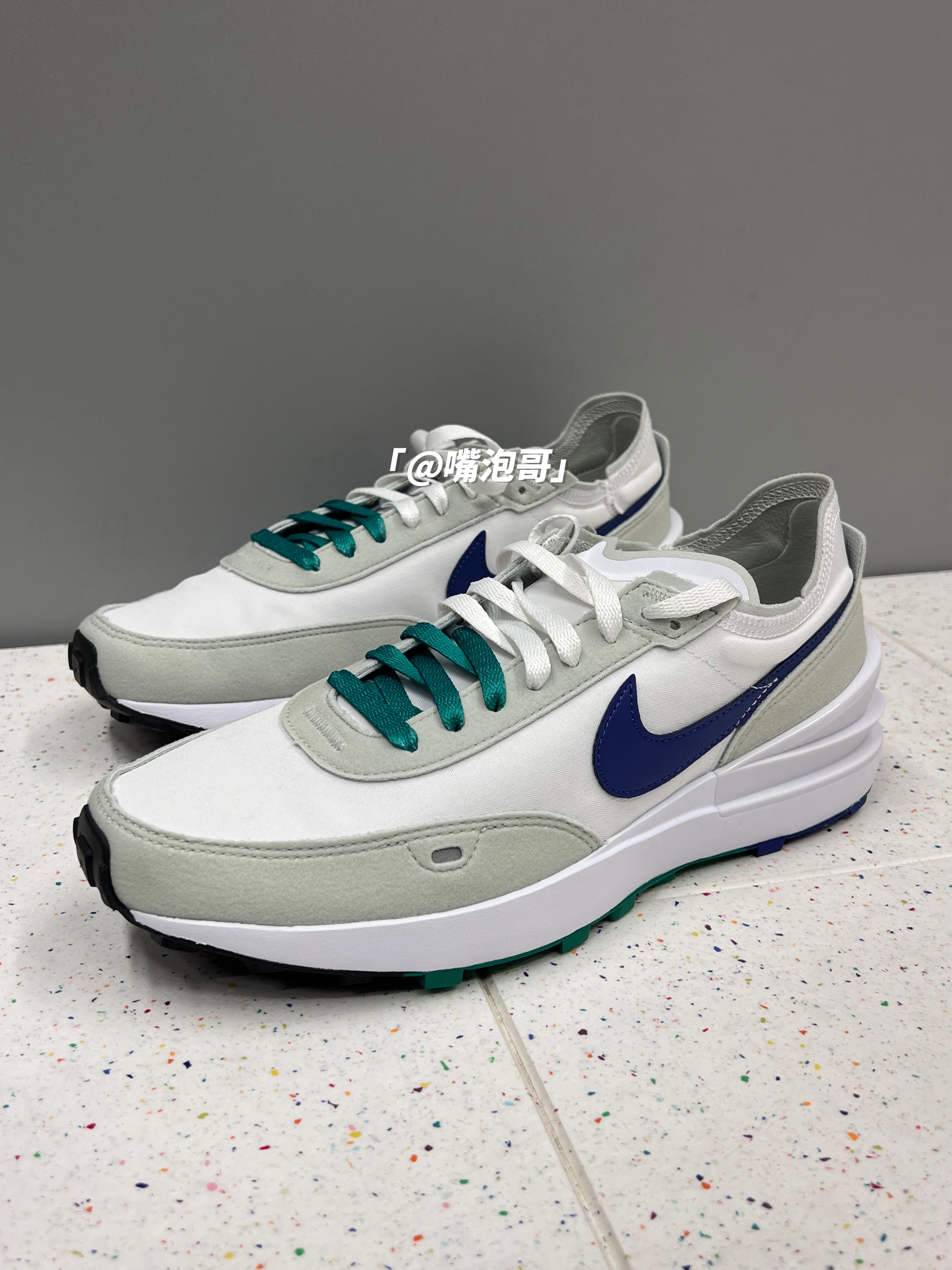 👟:Waffle One 白绿蓝 简介: 鞋款是一双低帮的休闲鞋,整双鞋子选用了多种复合材料制作,并且外观配色上选用了白色作为主色调,在日常穿搭中更好的搭配,春季出游穿还是蛮适合的。 细节: 鞋面采用了复合帆布与绒面革材料拼接而成,使鞋面整体具有良好的透气性,鞋舌与后跟都是轻薄的设计,在后跟位置还加入了TPU稳定模块,使稳定性提升,鞋带选用了白绿双色的设计,中底为普通的泡棉,大底是黑绿...
