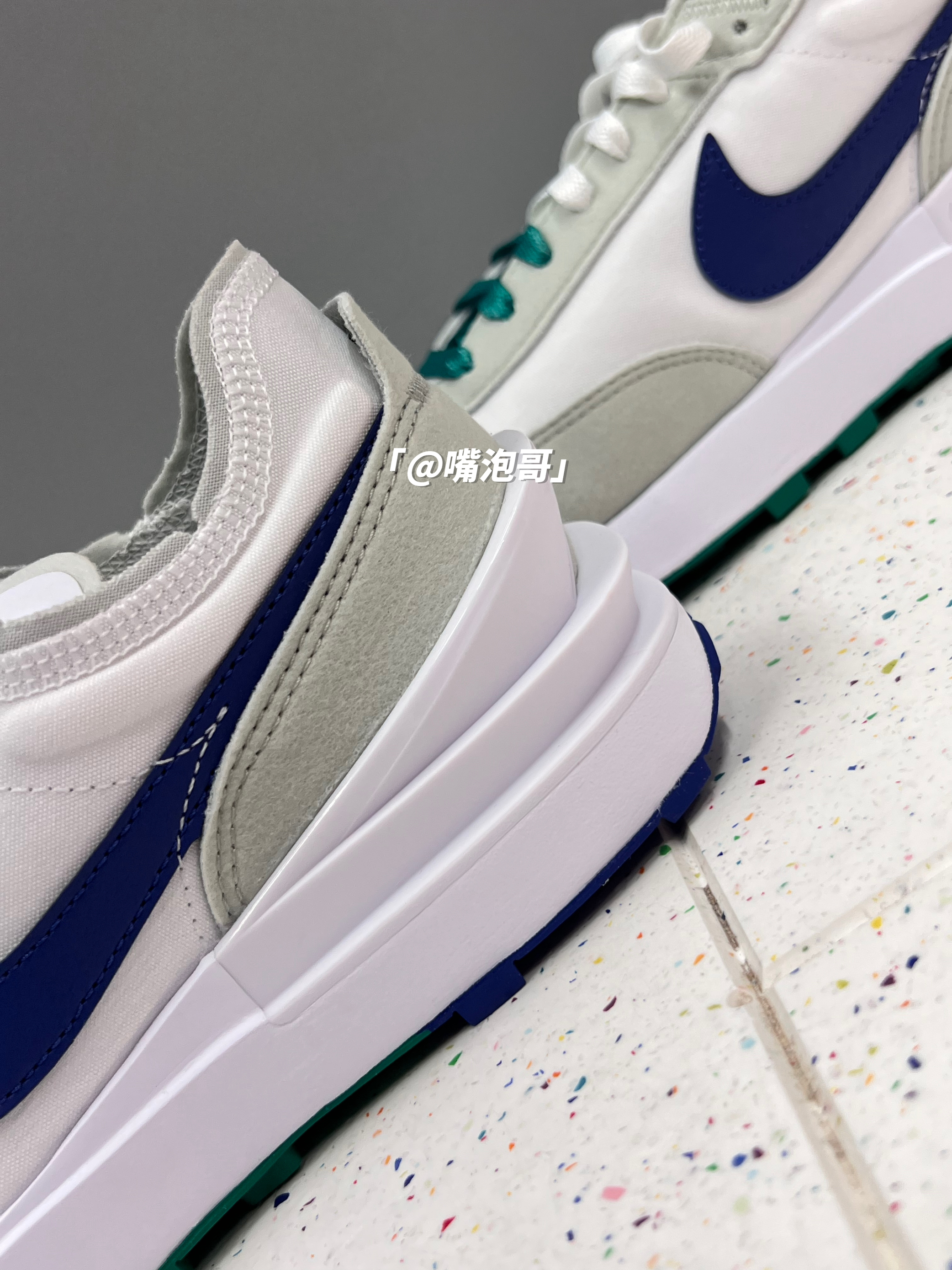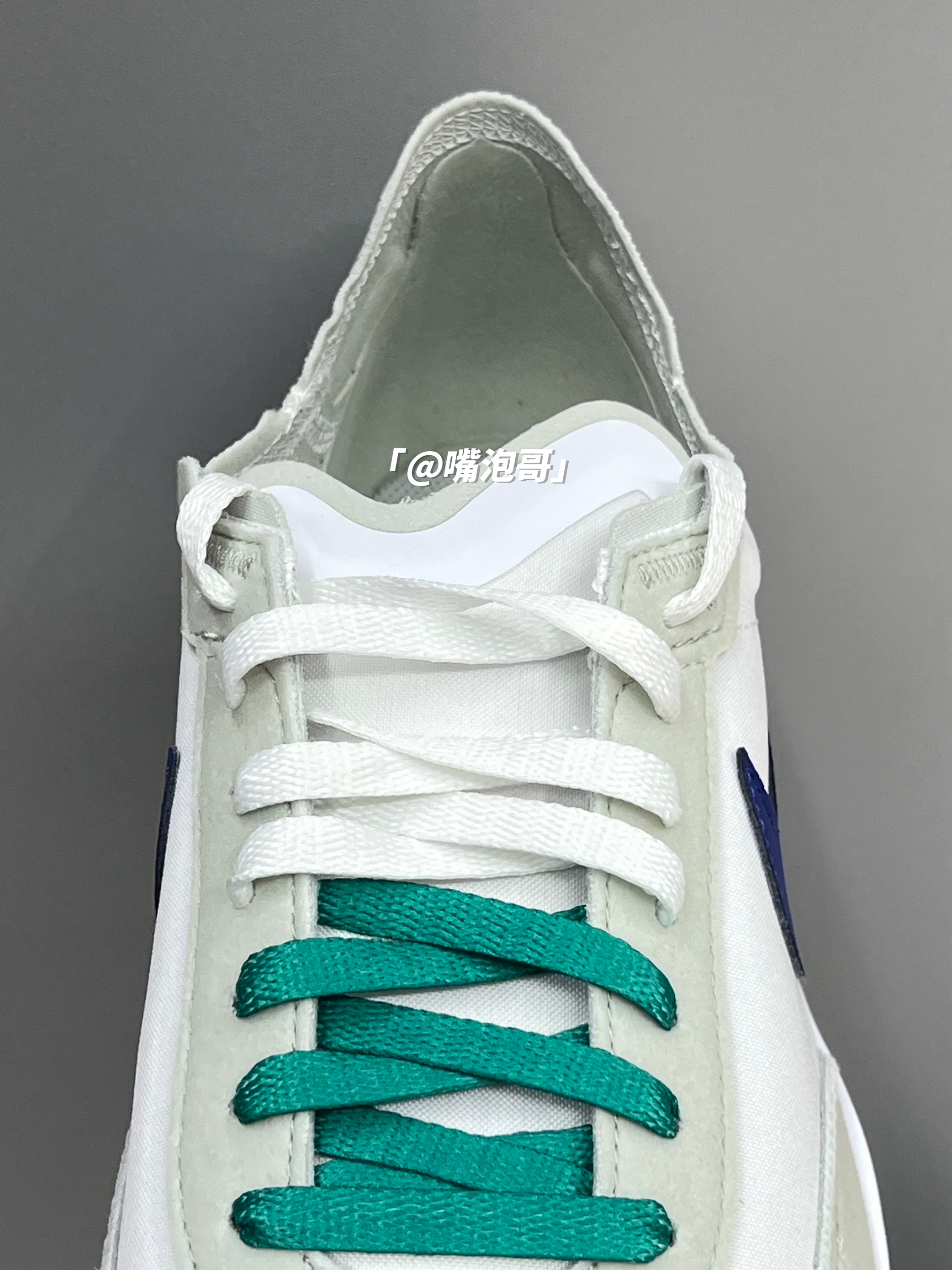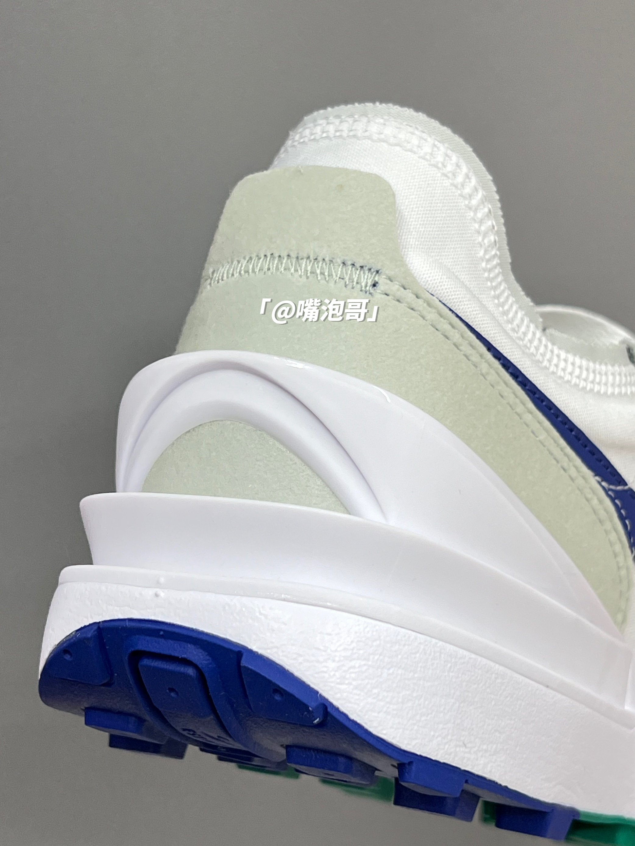 👟:Waffle One 白绿蓝 简介: 鞋款是一双低帮的休闲鞋,整双鞋子选用了多种复合材料制作,并且外观配色上选用了白色作为主色调,在日常穿搭中更好的搭配,春季出游穿还是蛮适合的。 细节: 鞋面采用了复合帆布与绒面革材料拼接而成,使鞋面整体具有良好的透气性,鞋舌与后跟都是轻薄的设计,在后跟位置还加入了TPU稳定模块,使稳定性提升,鞋带选用了白绿双色的设计,中底为普通的泡棉,大底是黑绿...