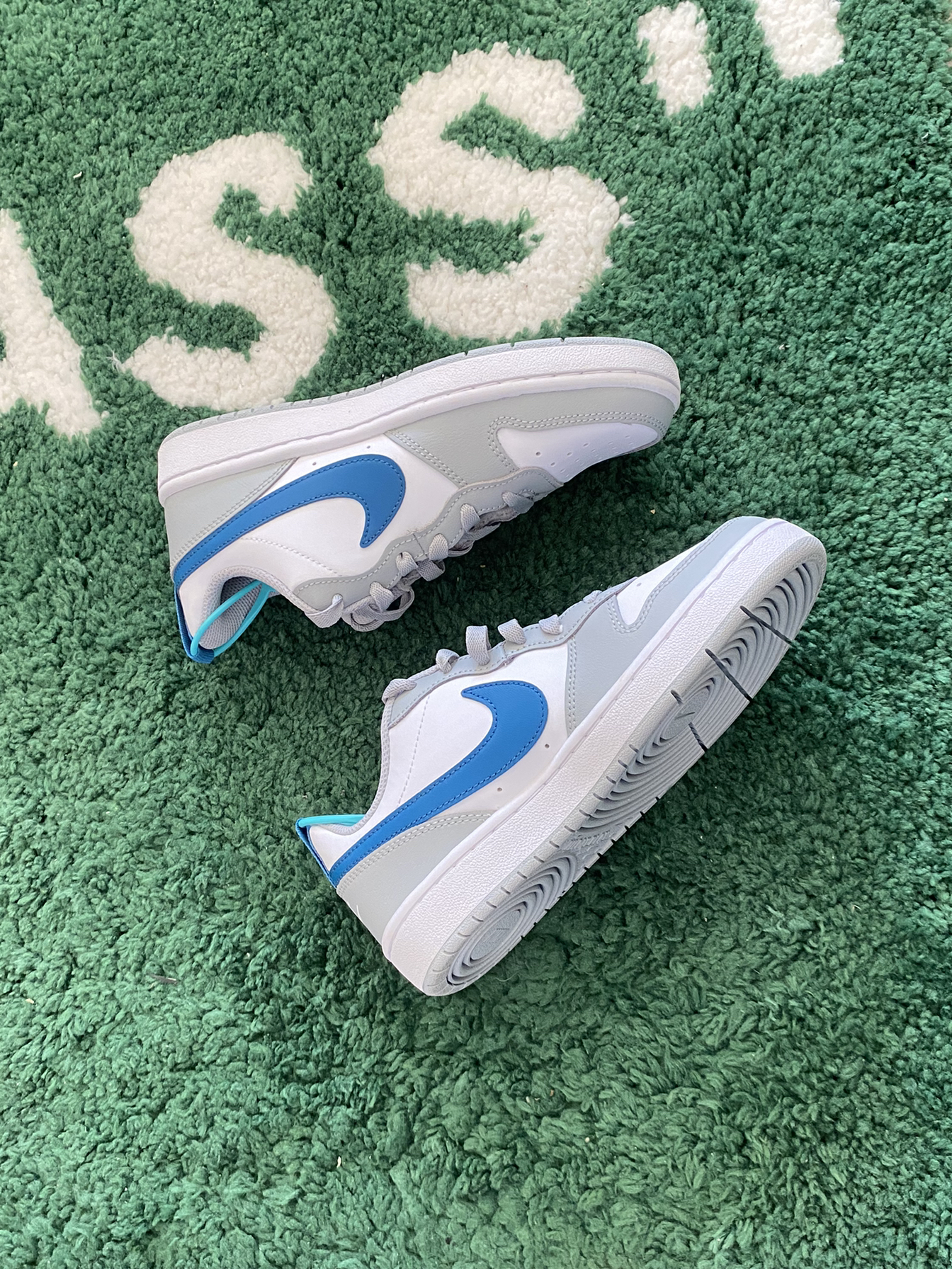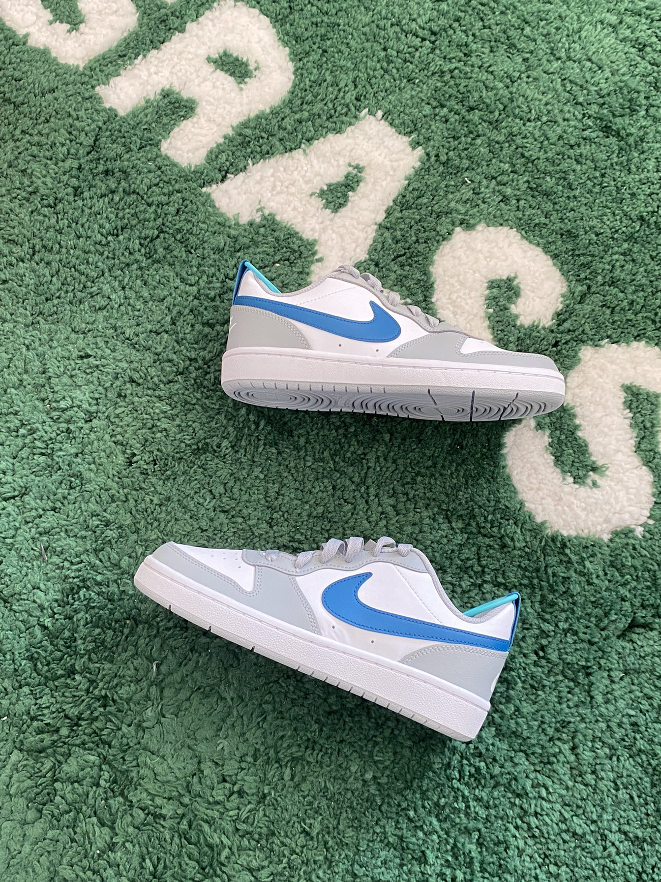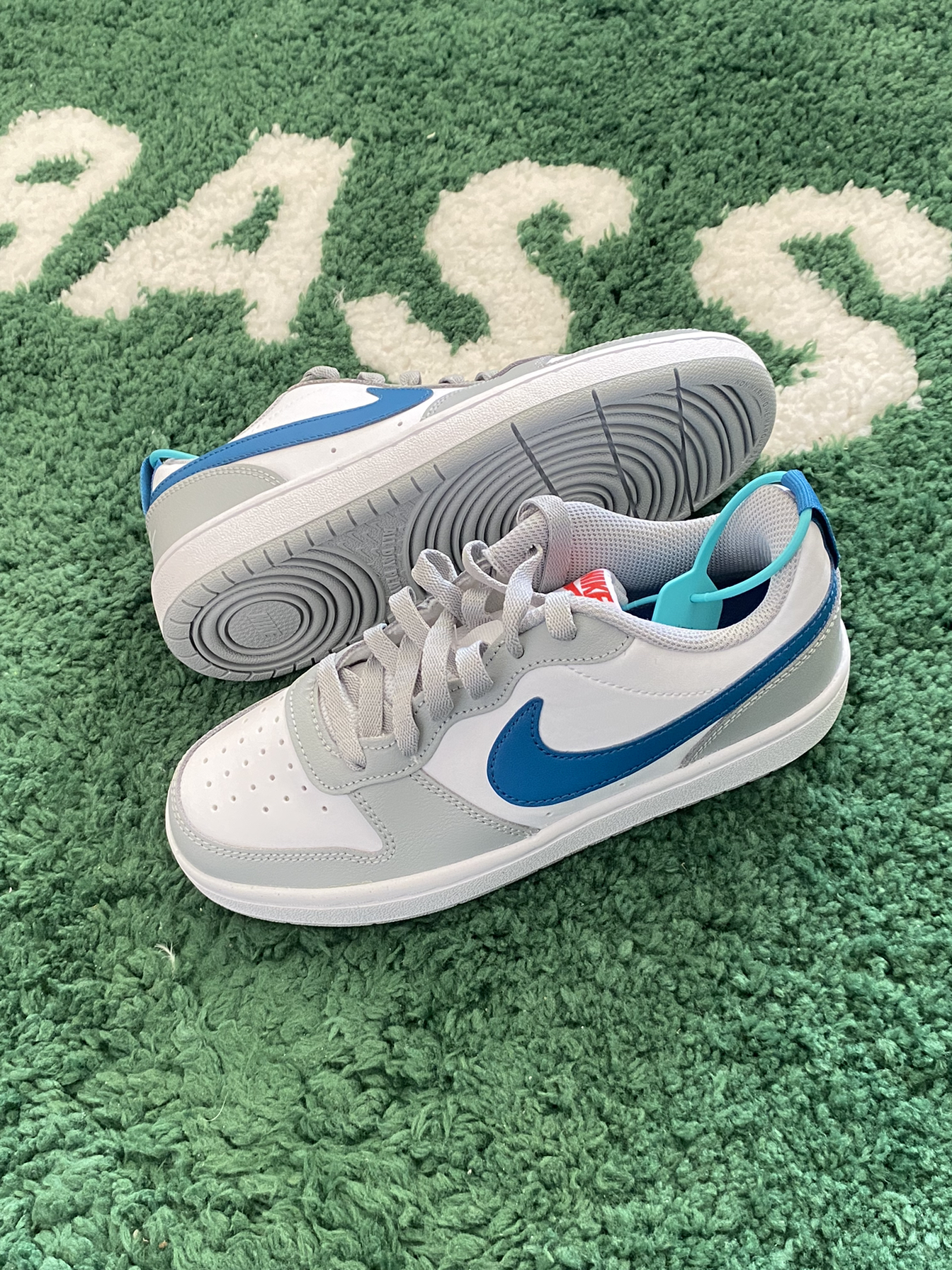 今日球鞋开箱📦分享 Nike Court Borough板鞋 鞋款配色由灰白蓝三色拼搭 清新百搭的风格 皮革面料质感还是可以接受的 搭配灰色休闲裤或者阔腿裤都蛮好看的 唯一不足也就是脚感方面的
