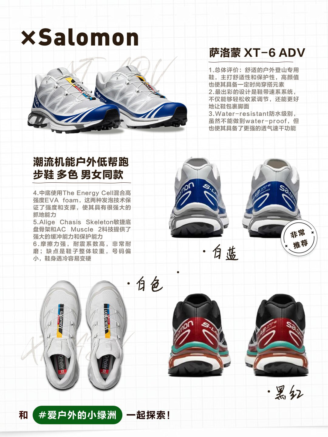 户外就要有户外的样子,户外最重要的就是鞋,既要颜值又要舒适,拿不定主意的就在这个清单里挑吧 - 👍👍「Salomon·XT-6ADV潮流机能跑步鞋」 大众休闲潮流款,主打舒适&保护性 高颜值大众百搭,有时尚穿搭元素‼️ 有一定防水,透气速干功能强💨 非科班出身的专业登山鞋 - 👍👍「 HOKA ONE ONE·Bondi7缓震运动鞋」 明星同款的经典人气王🔥 充满功能性同时兼具高颜值。 出色的...