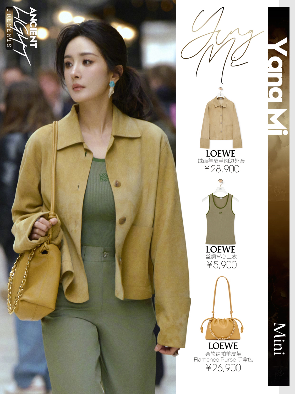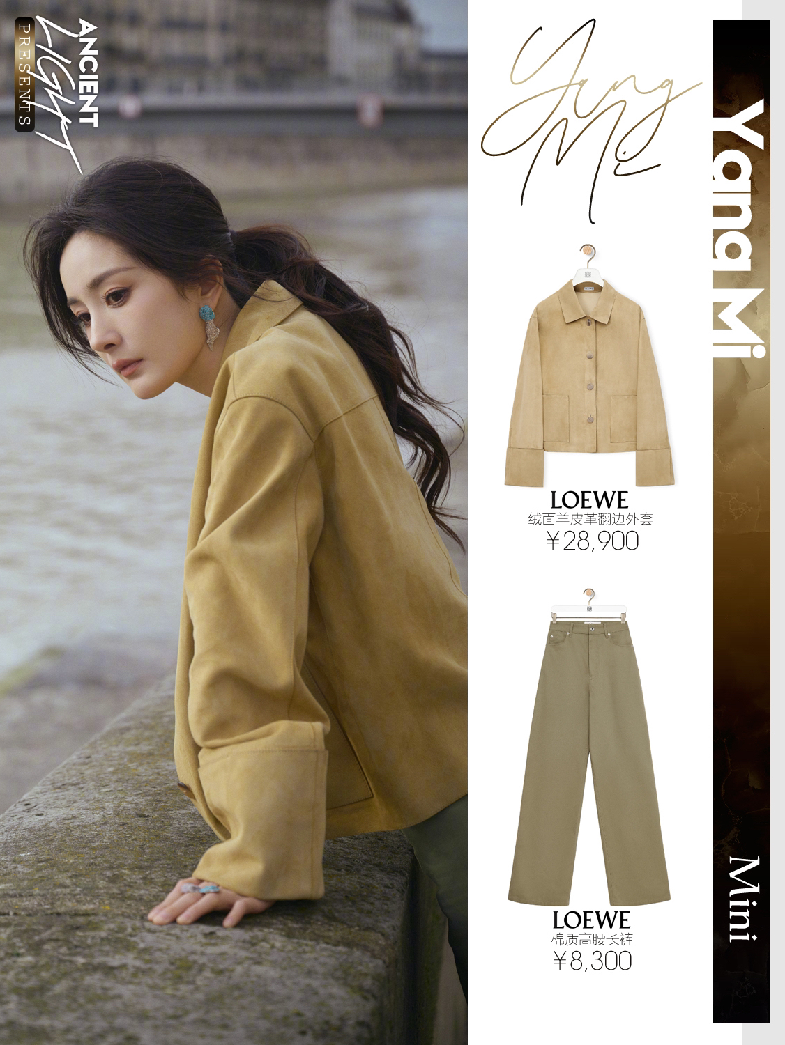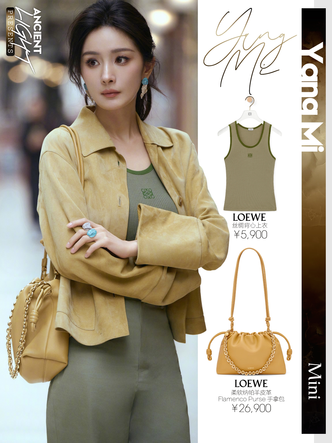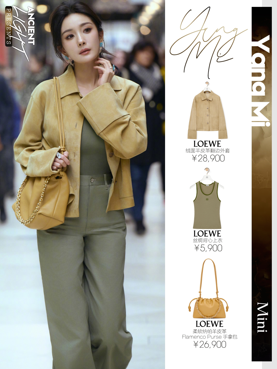 真真儿只是被杨幂这一颦一笑吸引了,很松弛的美,美的很简单。又怂又可爱的大幂幂,又见月牙笑啦。 外套|LOEWE绒面羊皮革翻边外套 货号S359Y19LA0 背心|LOEWE丝绸背心上衣 货号S540Y23X30 长裤|LOEWE棉质高腰长裤 货号S540Y04XHI 手袋|LOEWE柔软纳帕羊皮革 Flamenco Purse 手拿包 货号A411FCRX02 鞋履|LOEWE双色磨砂...