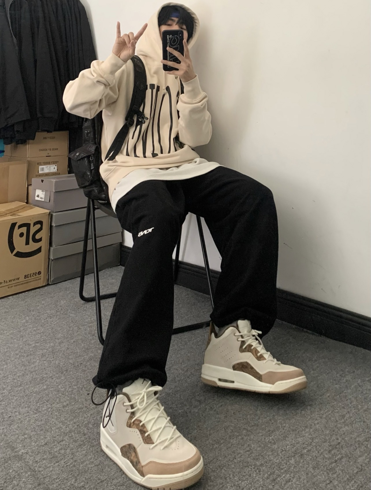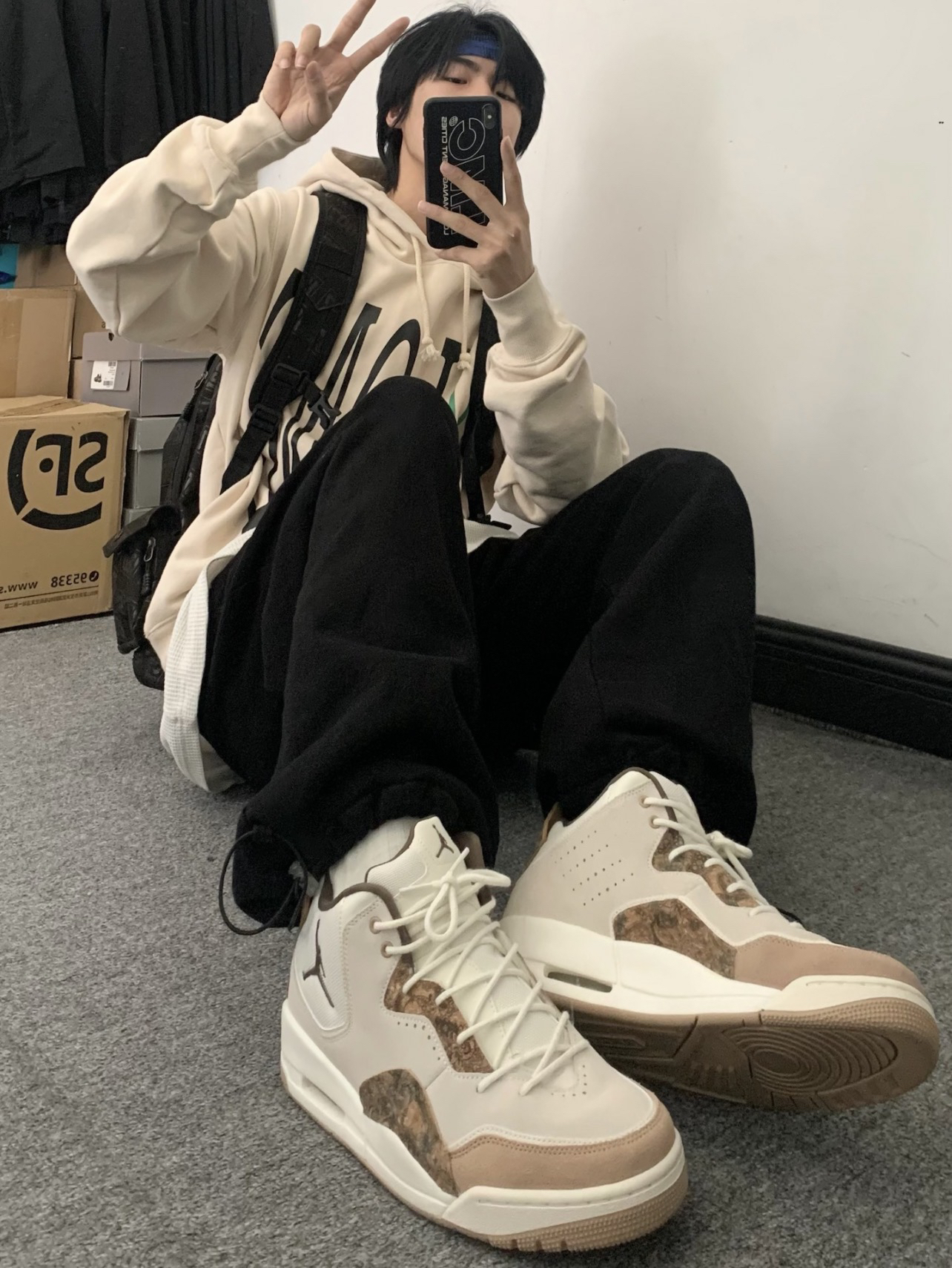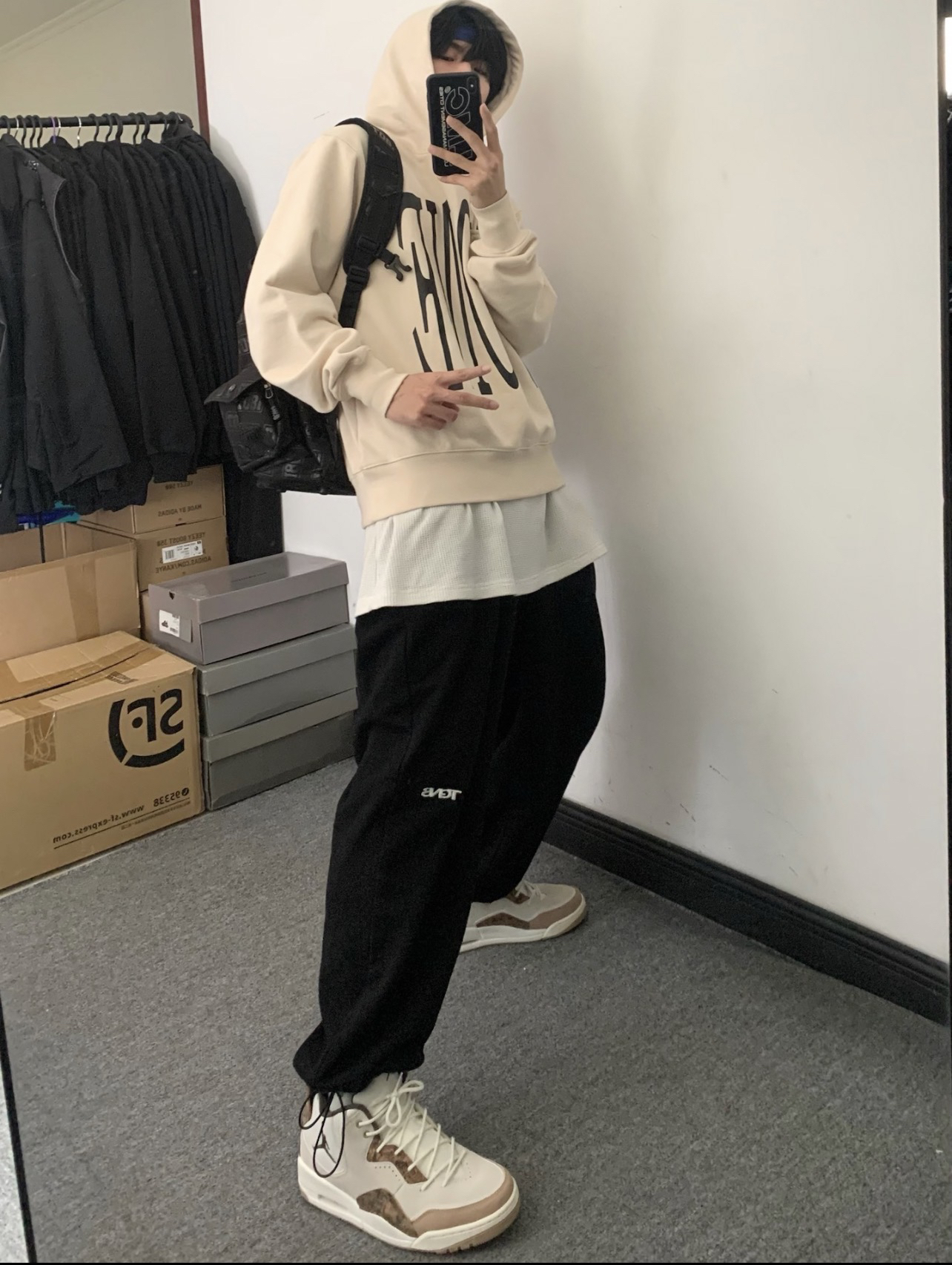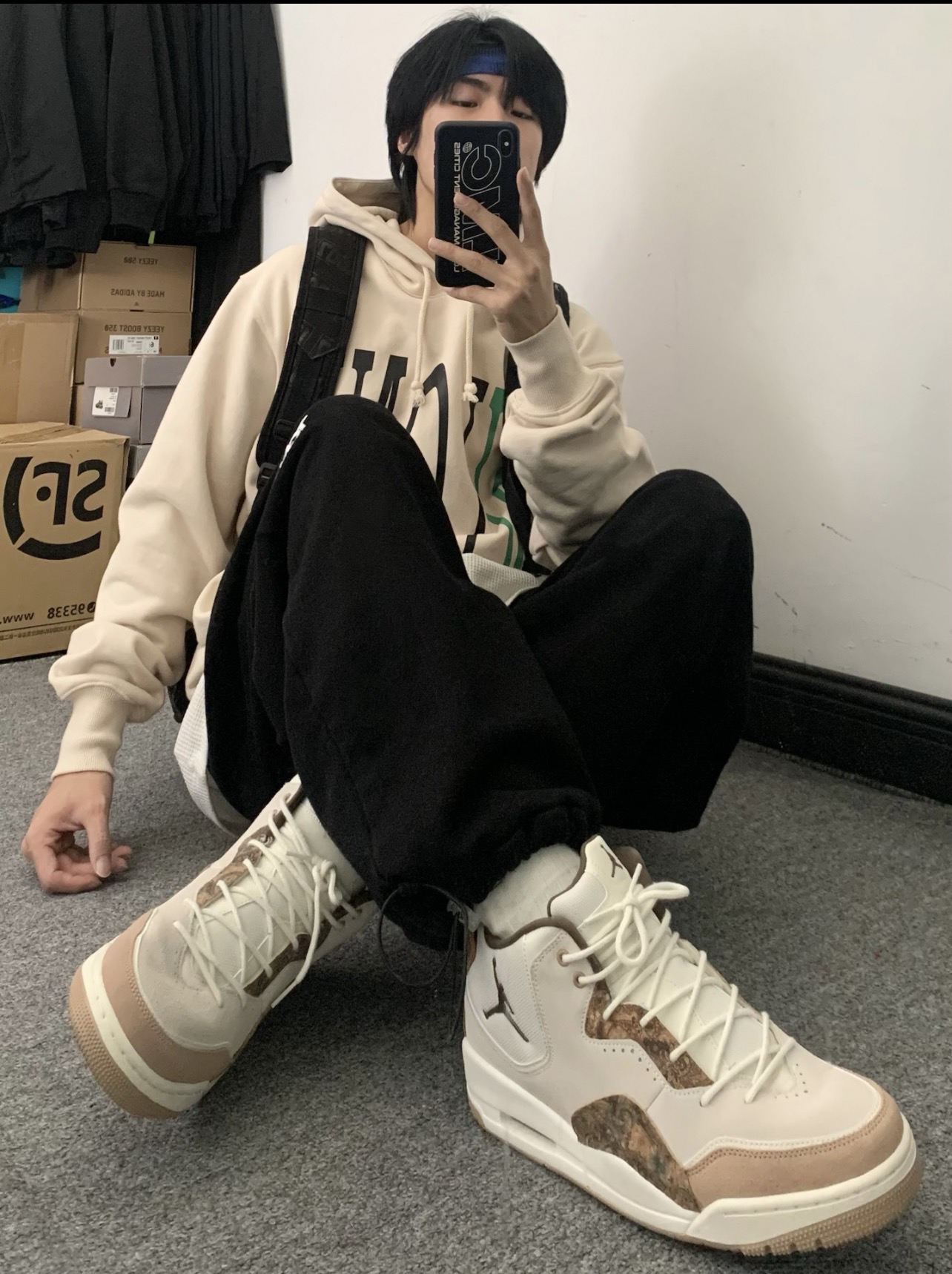 这套简单好看 轻松get 选择 白Jordan 23梦回敦煌 这双我太喜欢了 美拉德配色简约干净好搭配 结合壁画拼接满满艺术气息 上脚效果绝了而 且小众款更能彰显品味拒绝撞款 上身搭配:杏色卫衣十黑卫裤 版型宽松有范搭配白色长内搭增加层次不单调再搭配双肩包增加街头感。整体效果就很绝 COOL