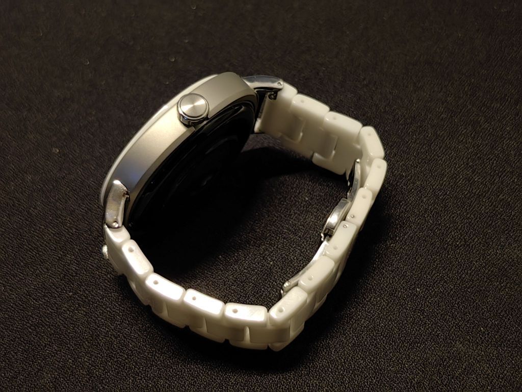 华为赛博手表里面最好看的当属黑金和月光白配色,其中月光白配色唯一的缺点就是自带硅胶表带和精钢+陶瓷机身极为不搭。经过第三方连接器和20mm陶瓷表带改装不输GT3pro白陶瓷,这便是500+华为赛博的魅力。