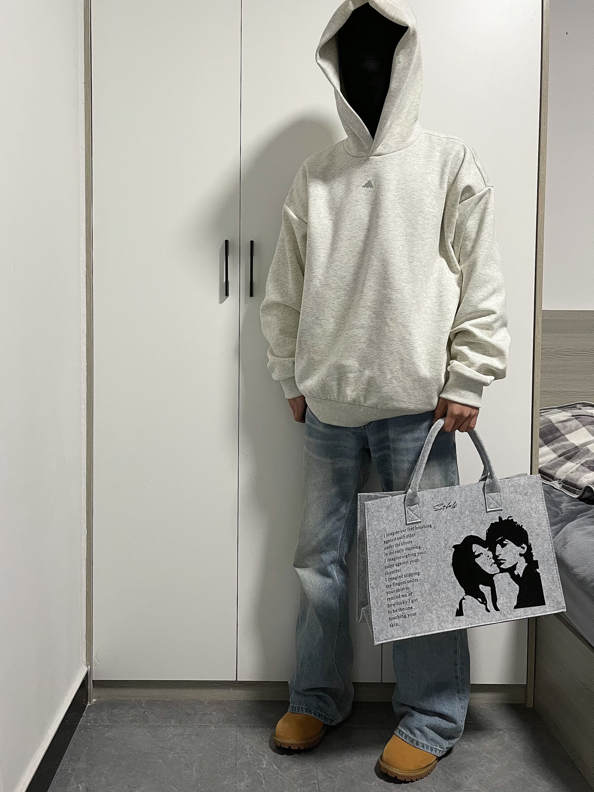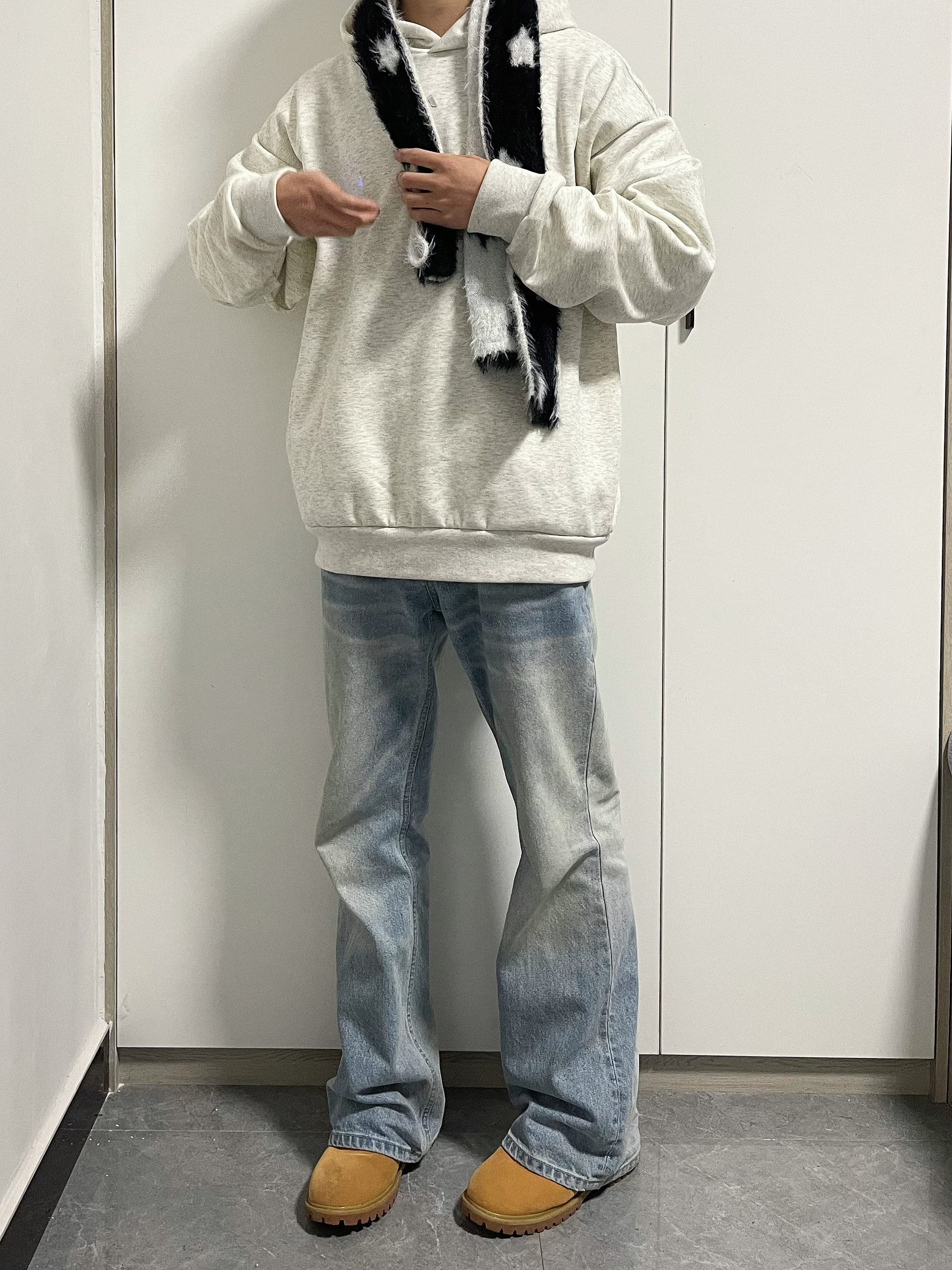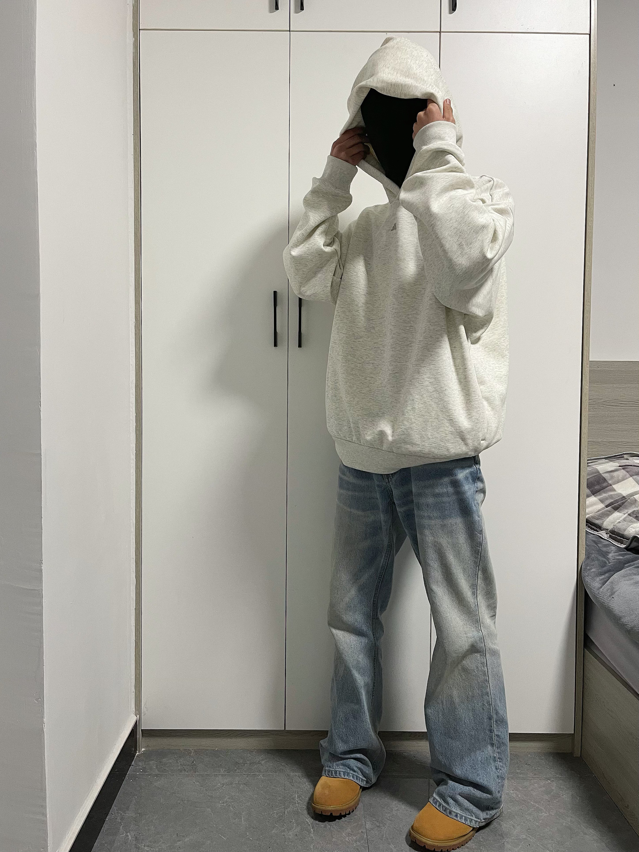 今天上身一件adidas卫衣,下身搭配奶油水洗蓝牛,鞋子选择搭配当下热门的大黄靴。通勤一套出门