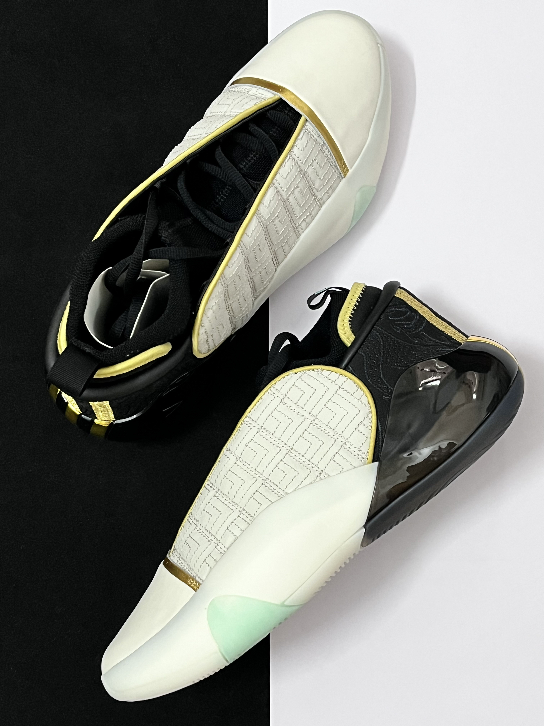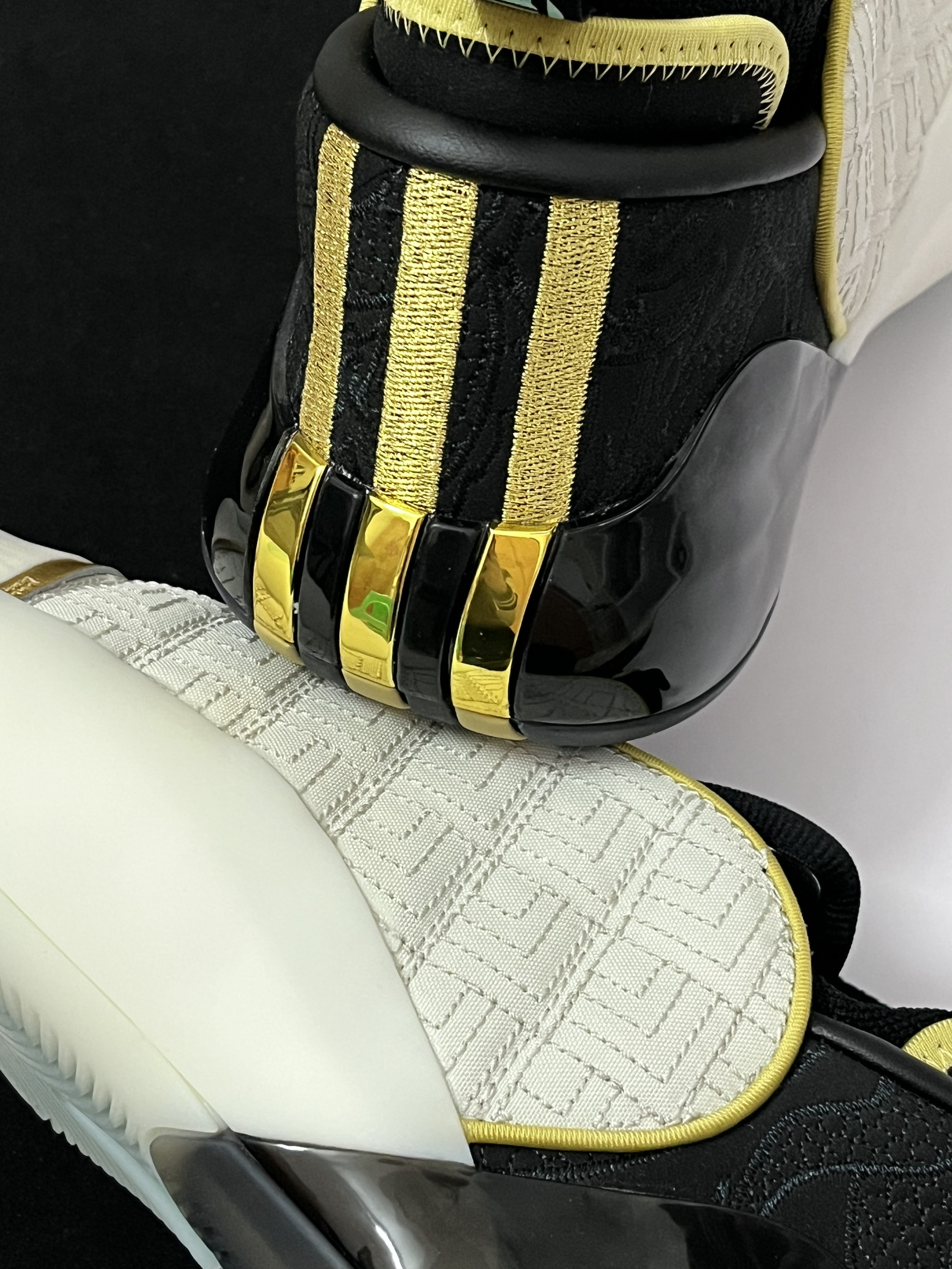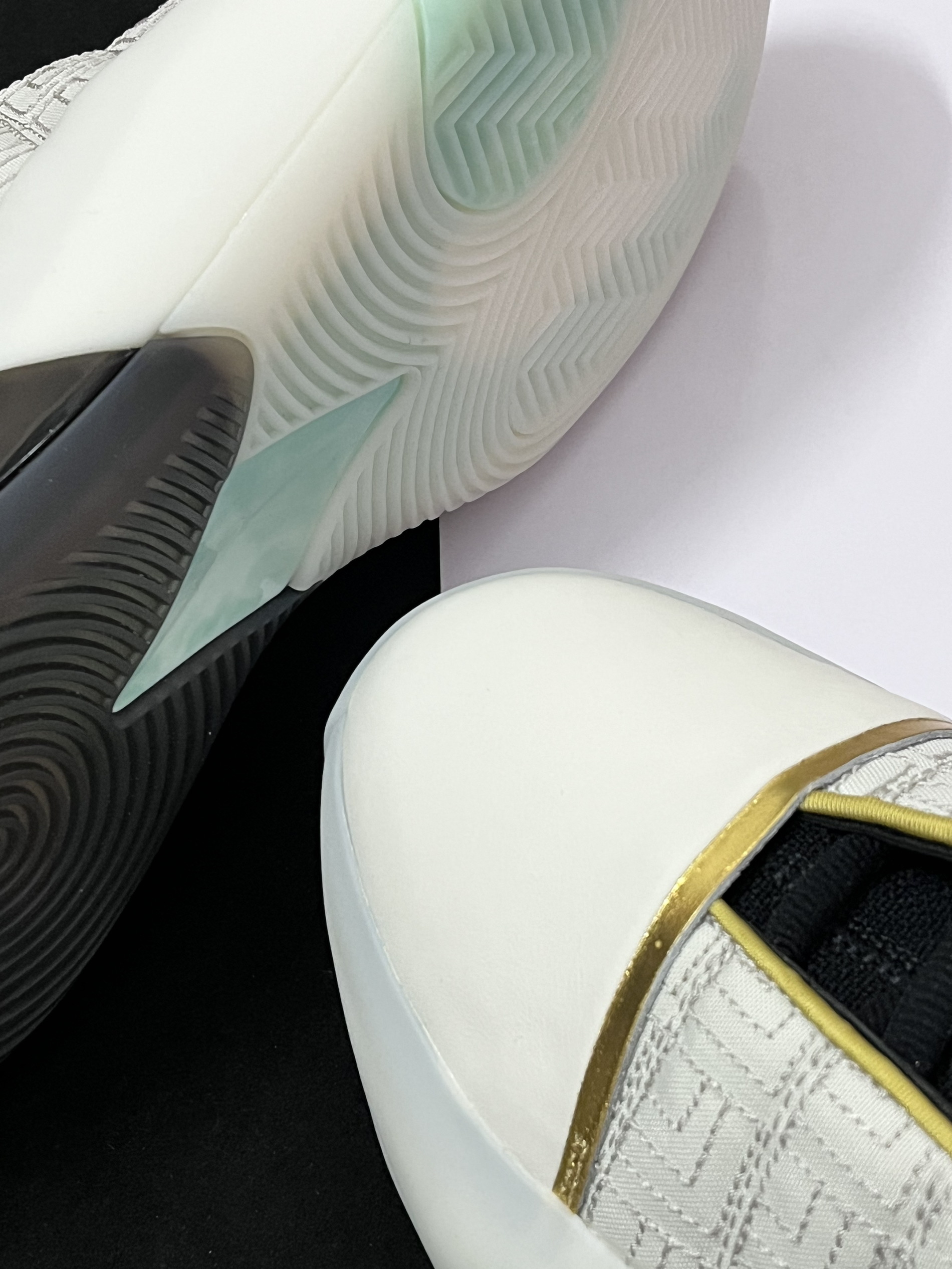 🔸如果你还在纠结开春适合穿哪款实战球鞋,那么德鲁大叔建议你试一试这双白金配色的哈登7代。外观是以“龙”作为设计灵感的,后跟的金色条纹有着较高的辨识度。 🔸整双篮球鞋有着较高的缓震极限以及包裹性能,鞋身两侧以及鞋面的强度也比较高,适合锋线球员穿。缺点方面在于是水晶底的设计,适配场地有限,并且性价比一般。