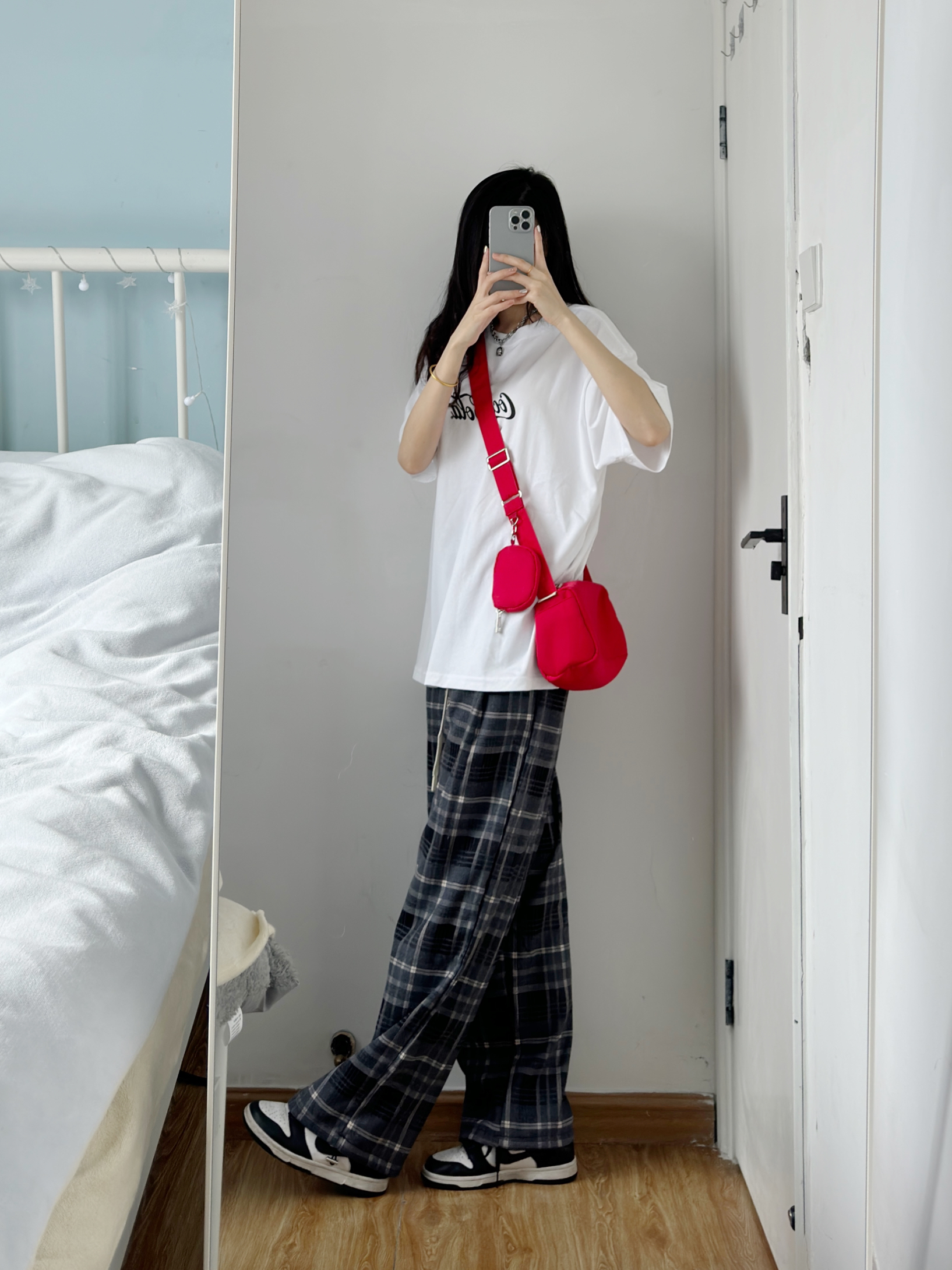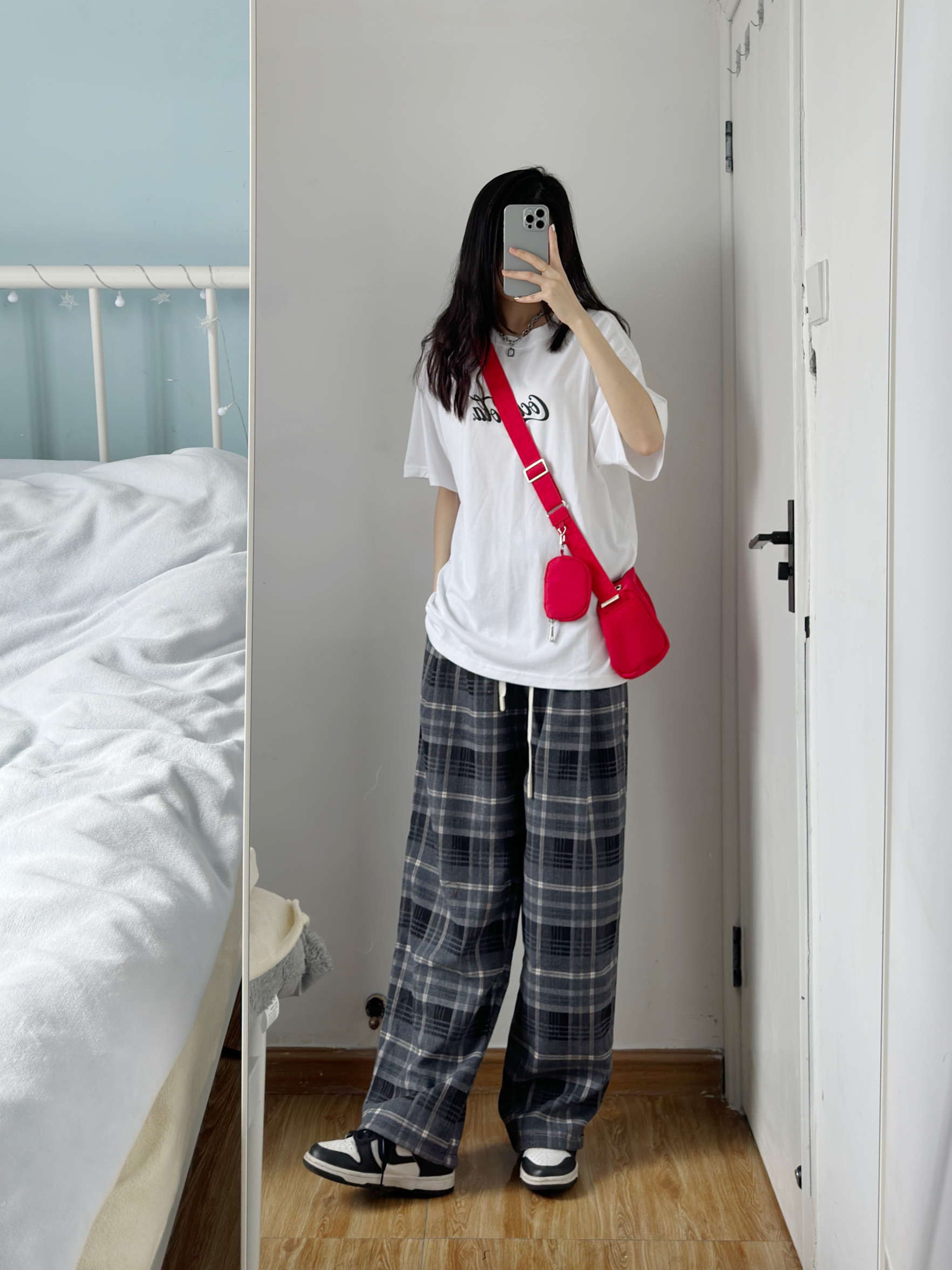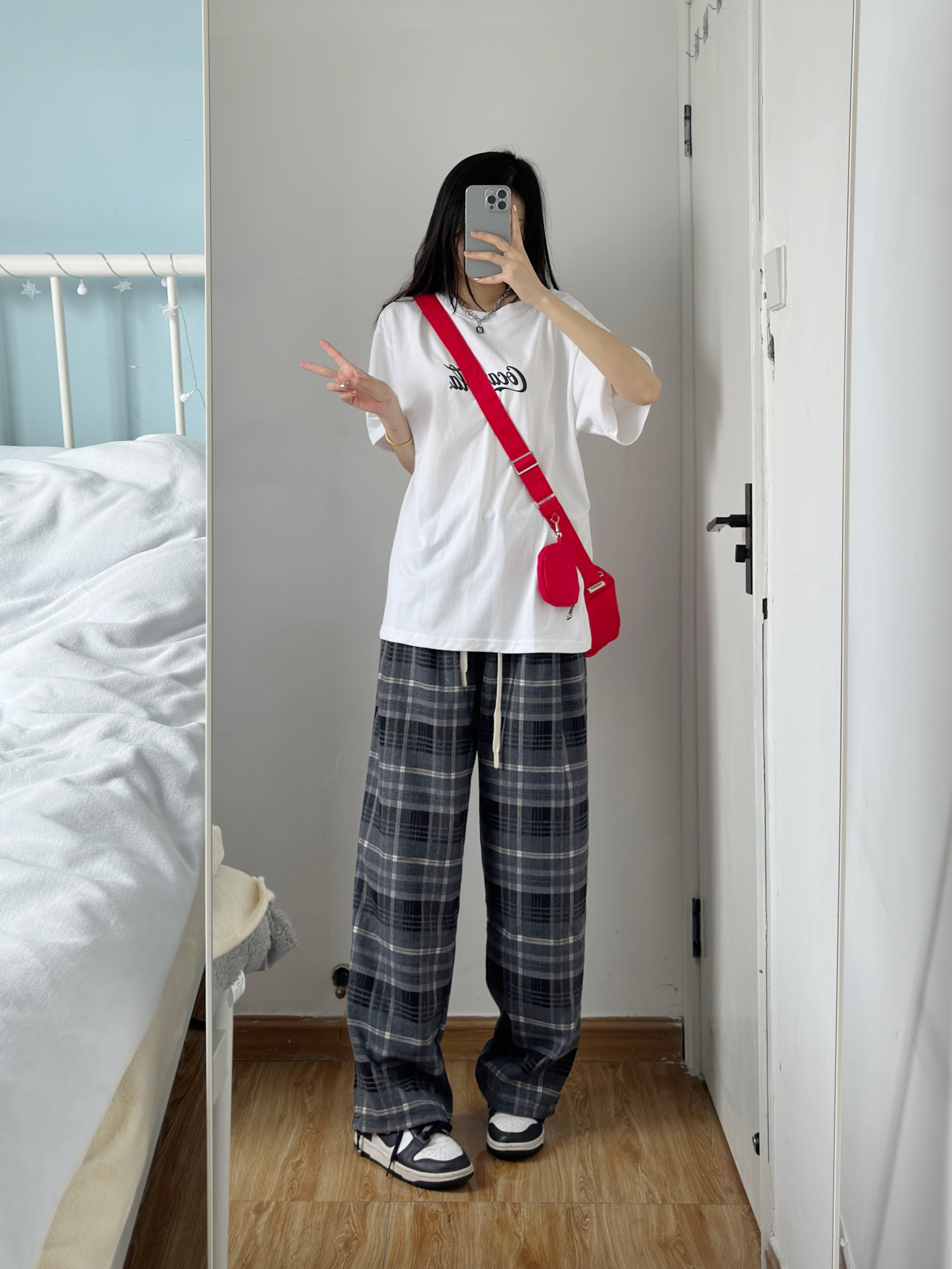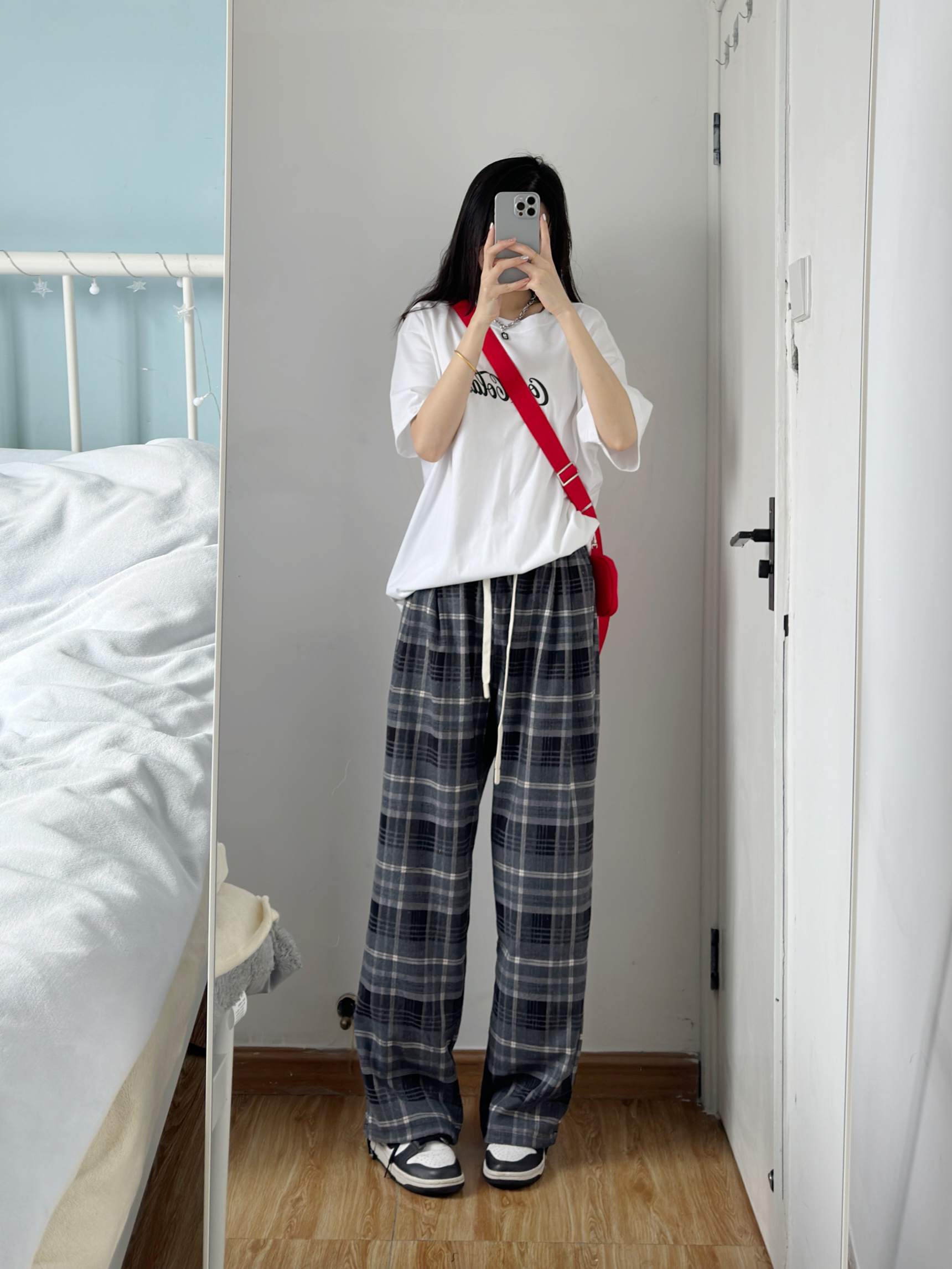 白色短袖搭配格子阔腿裤 一套也太好看了吧! 裤子版型好好 随便搭配都好看🥰 本早八真的离不开这种宽松休闲的裤子 舒服中又带点慵懒~