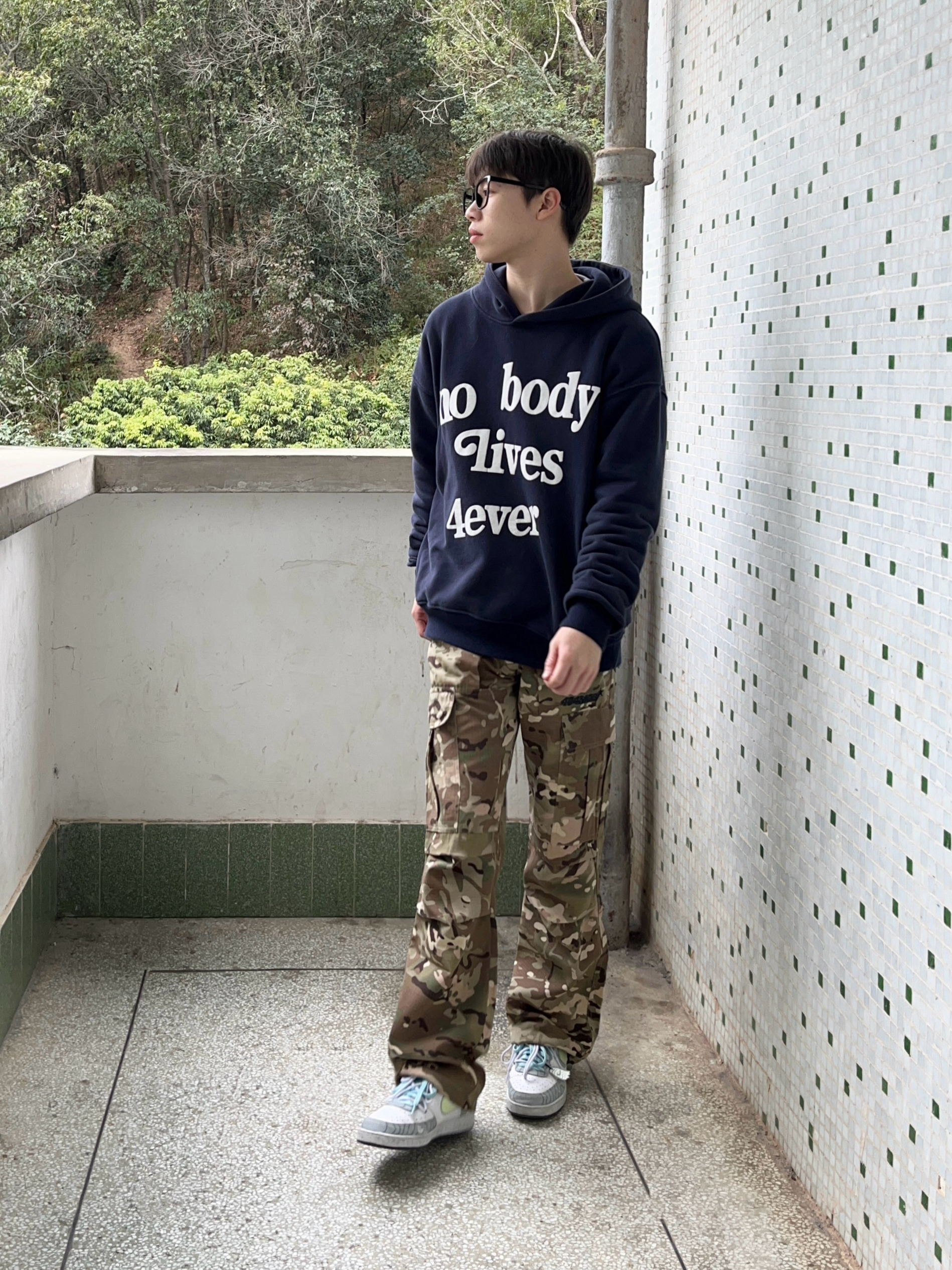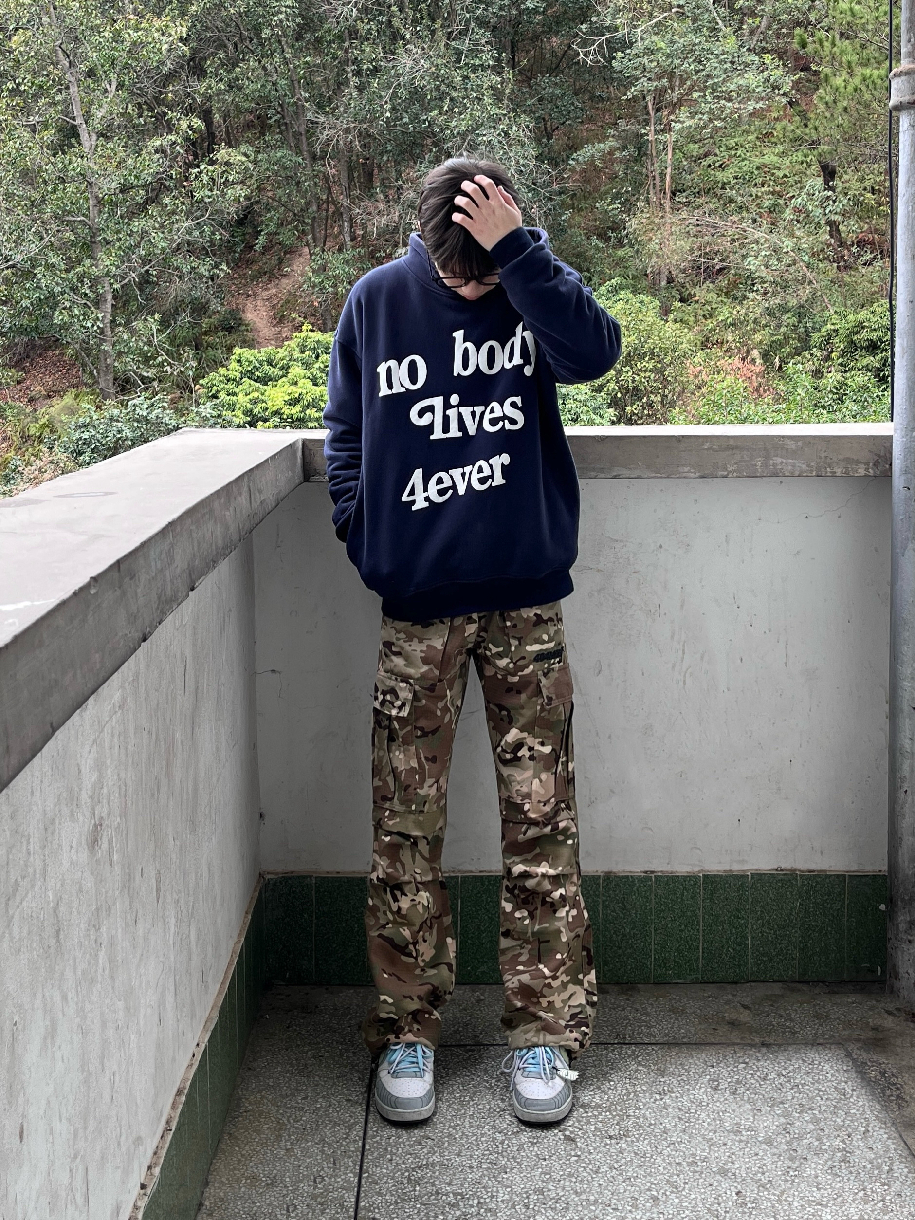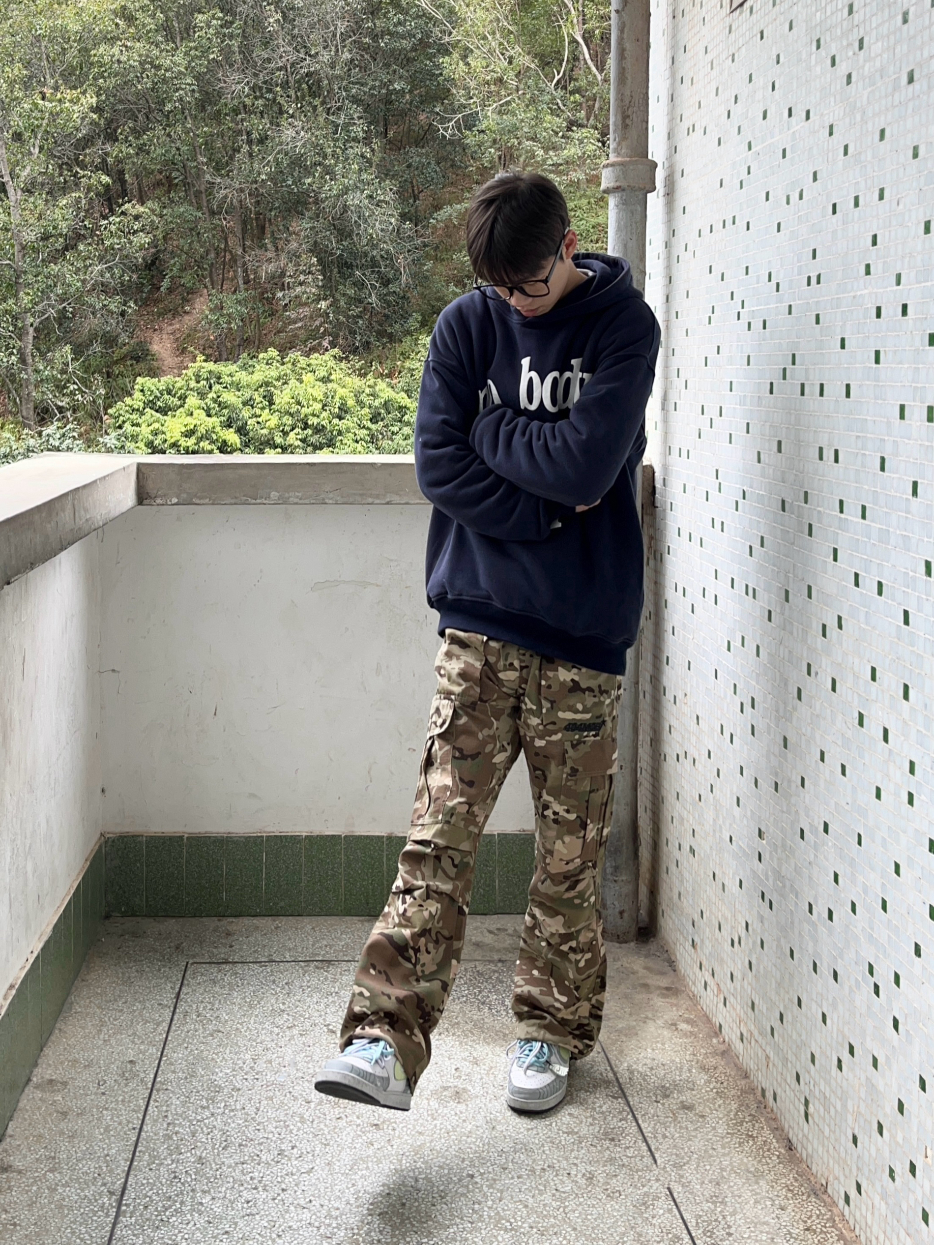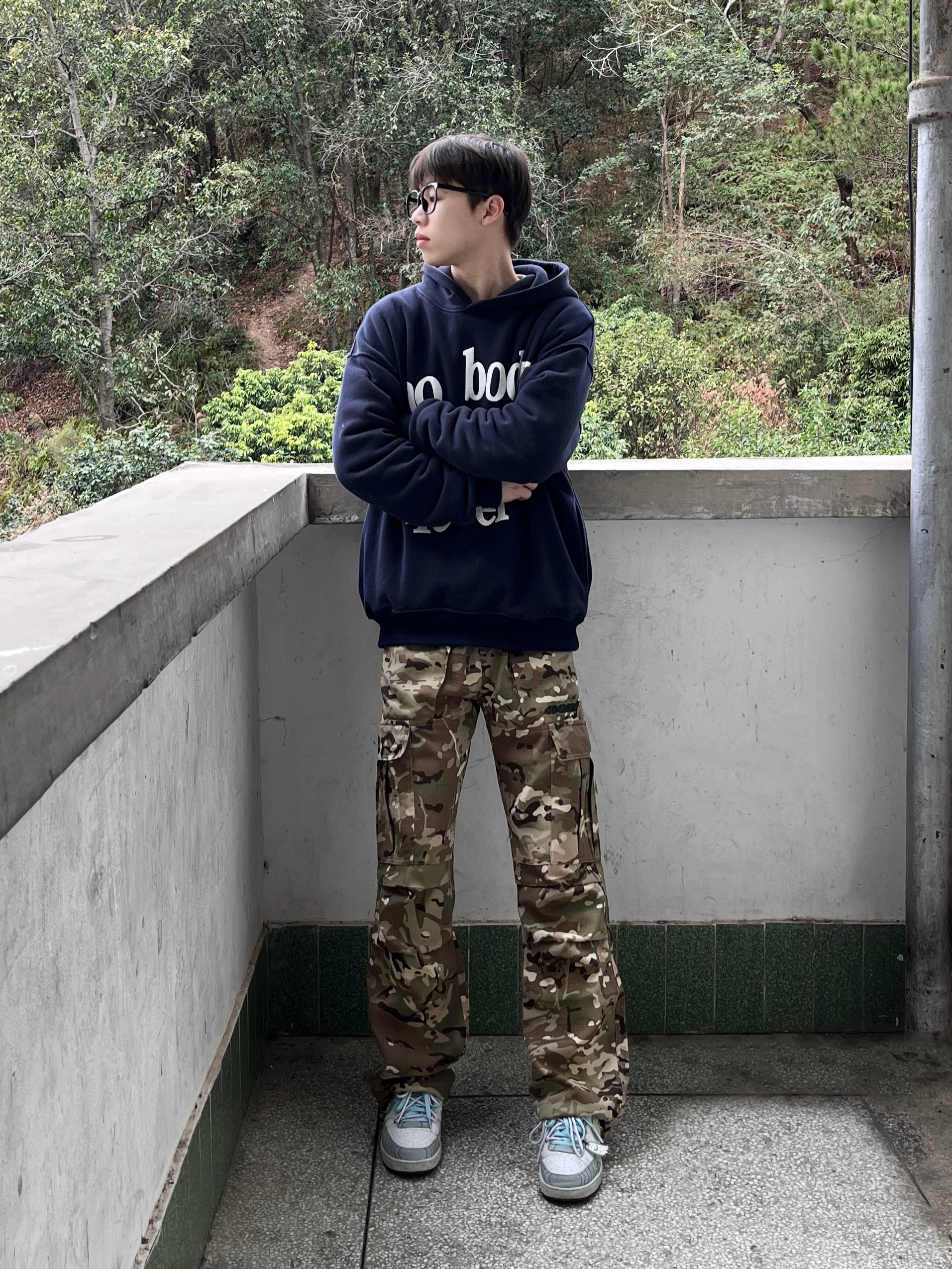 今日份穿搭分享来啦👀 衣服是藏青色的简约美式卫衣 发泡字母印花设计时尚又复古🥰 再搭配上 404MOB GANG 家的迷彩直筒工装裤 版型宽松显腿型 刺绣大logo设计彰显品牌个性 最后经典板鞋点缀 一套搭配下来 真的很绝呀🔥