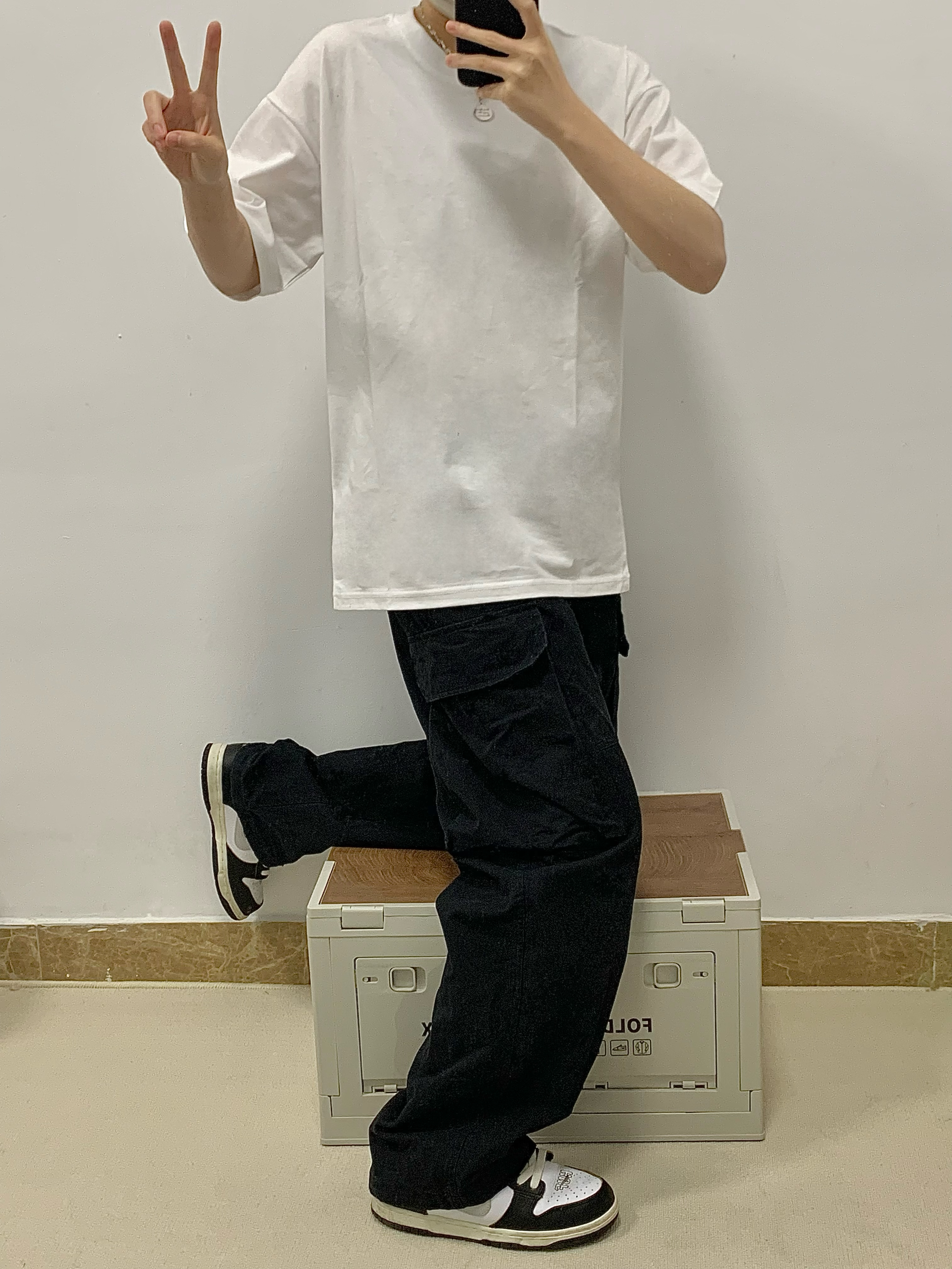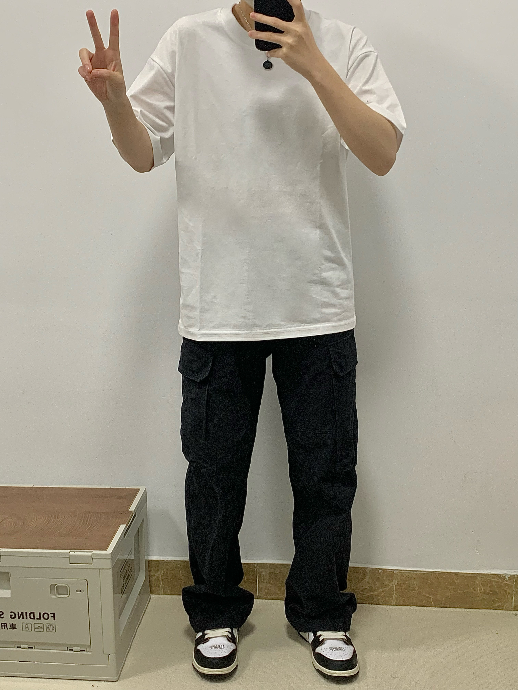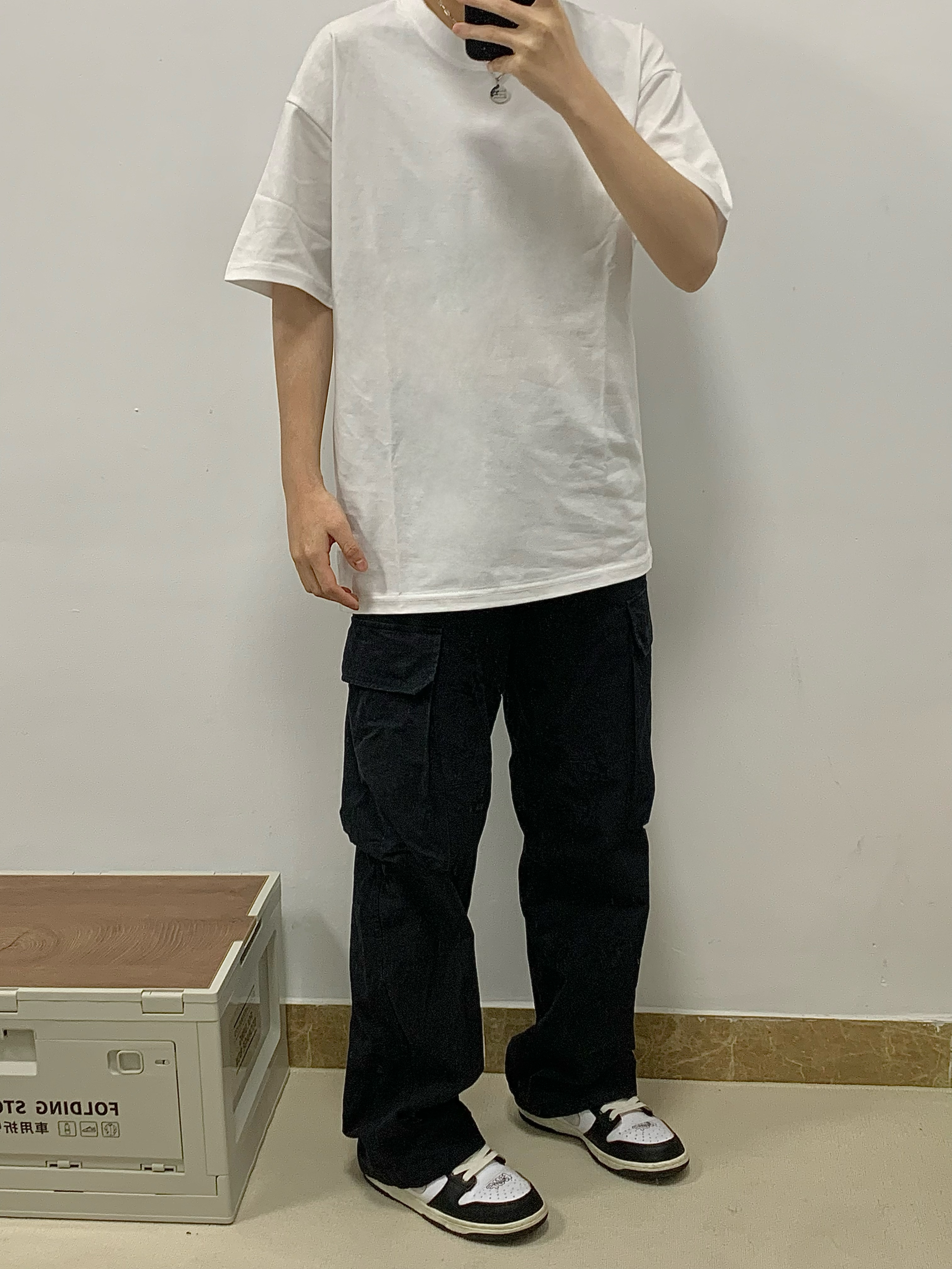 衣柜必不可少的白T 内搭外穿都可以 200克重磅面料 完全不会透 100%纯棉材质 宽松版型 不挑身材 下装是黑色的工装裤 侧边两个大口袋设计 黑白配适合所有人! 👔:真维斯 👖:江南先生 👟:Huf x nike