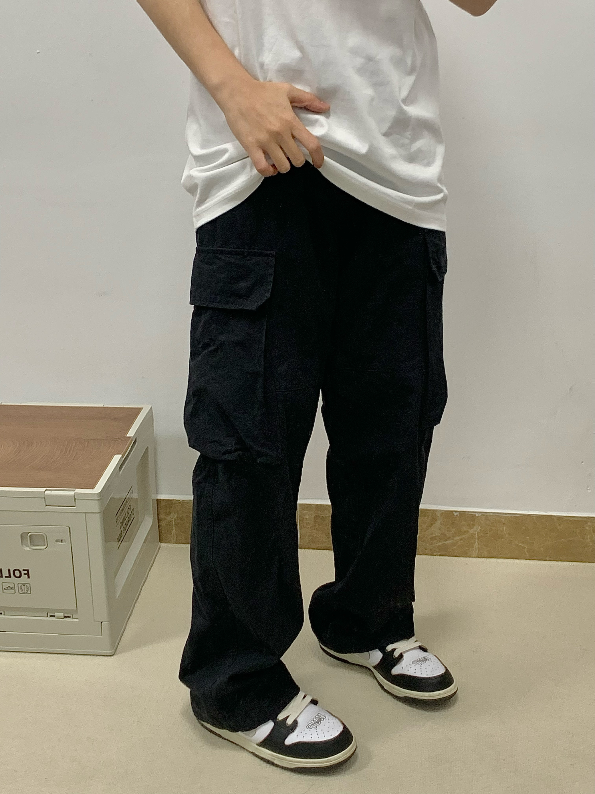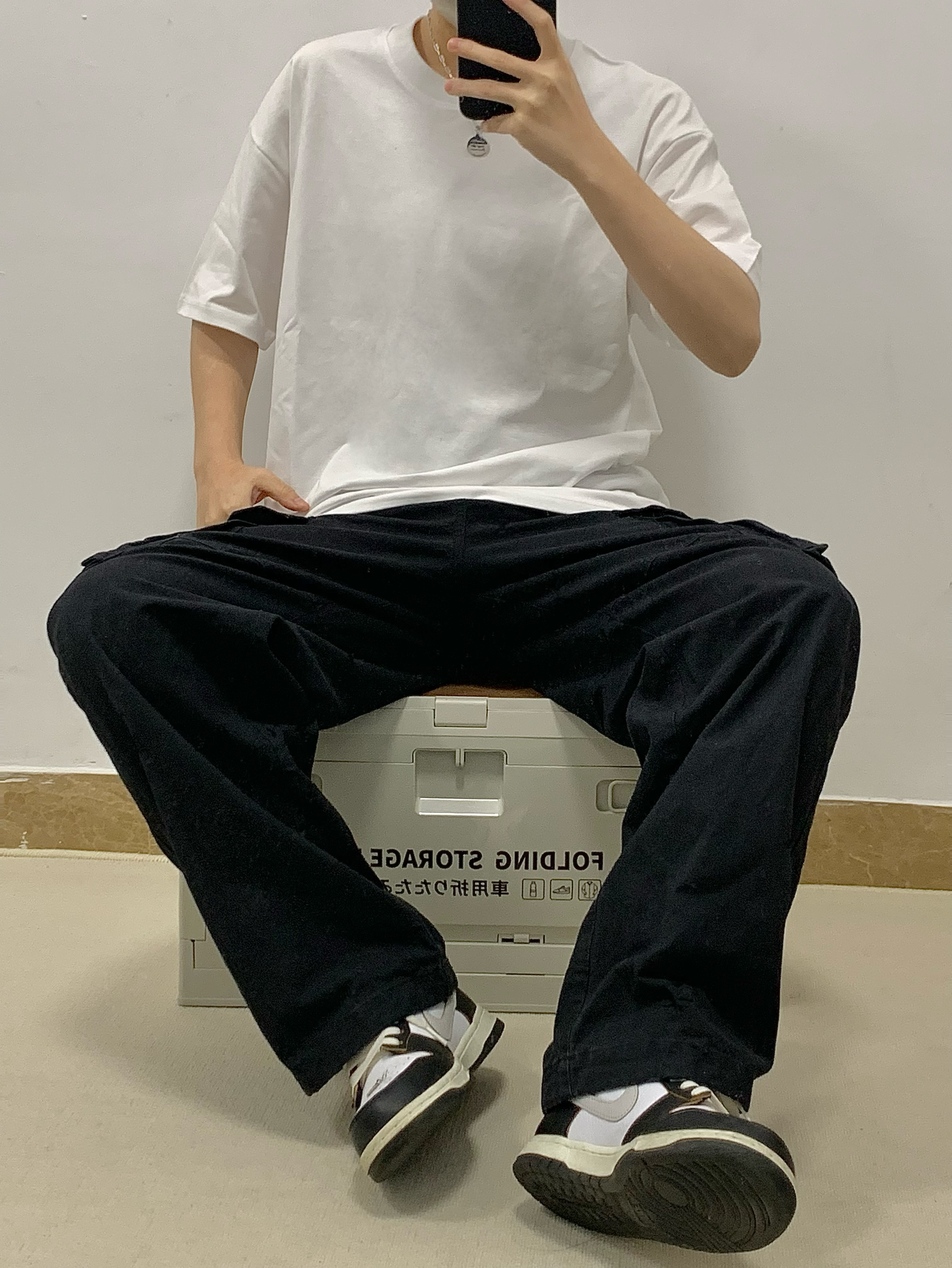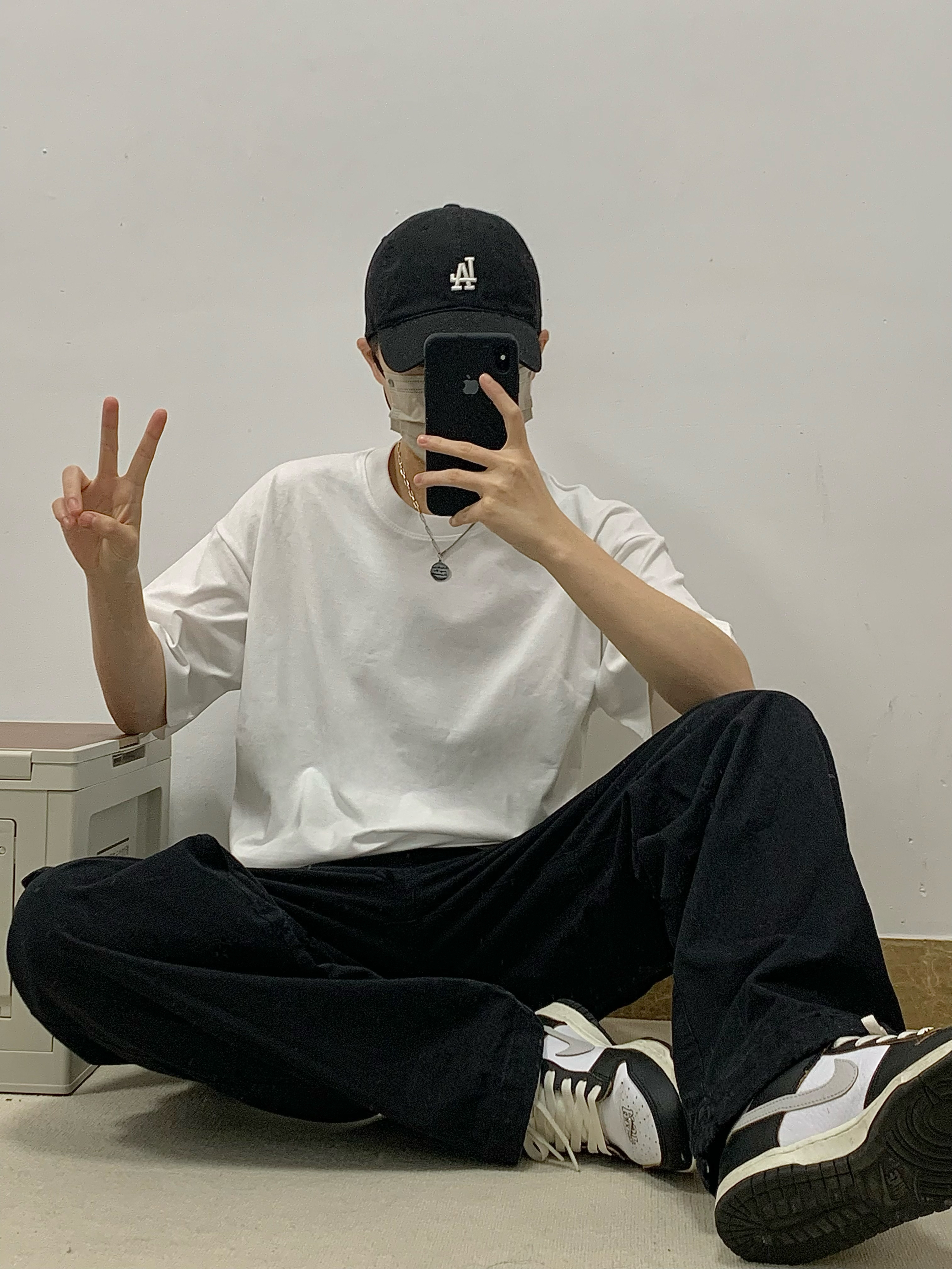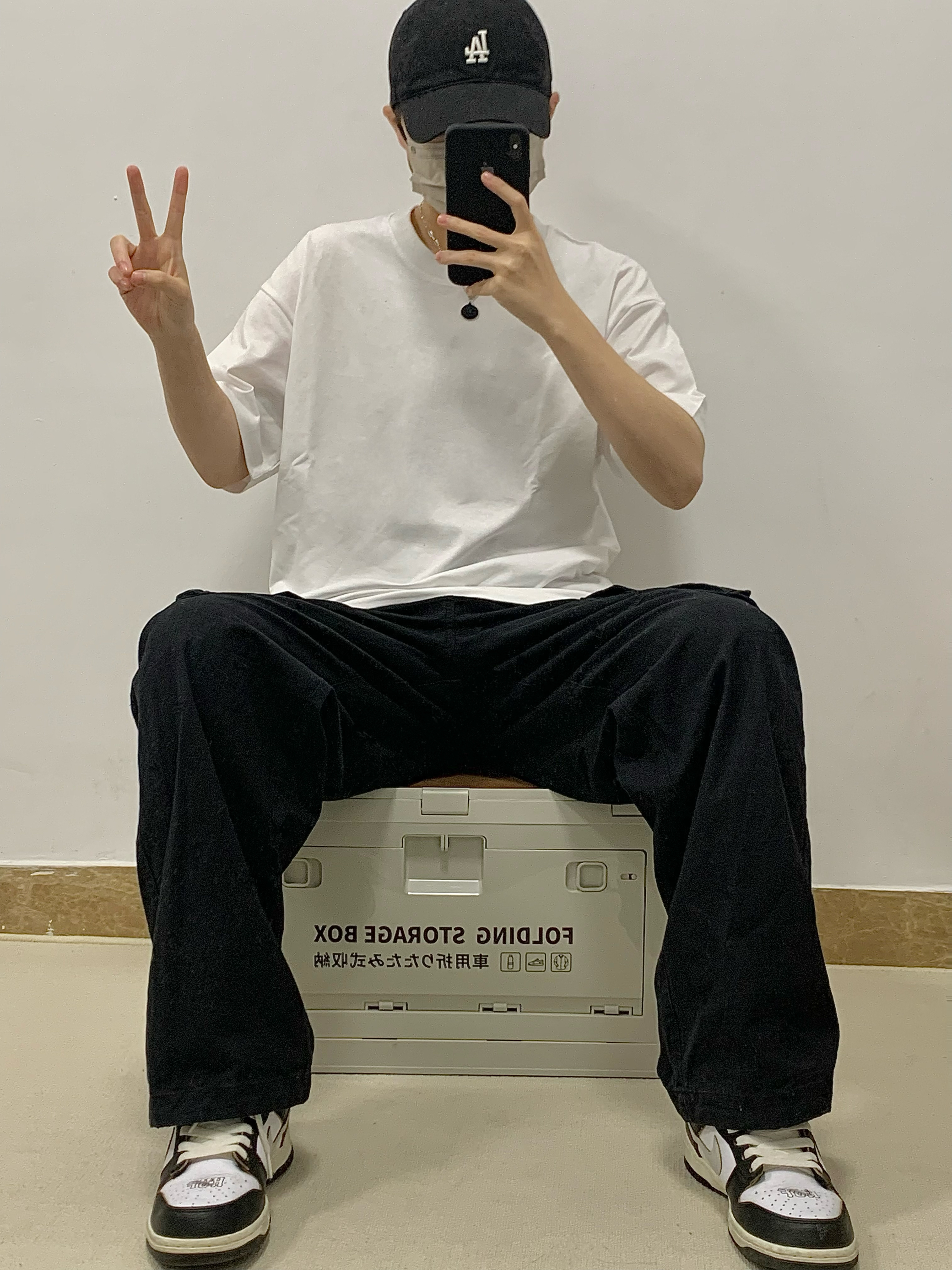 衣柜必不可少的白T 内搭外穿都可以 200克重磅面料 完全不会透 100%纯棉材质 宽松版型 不挑身材 下装是黑色的工装裤 侧边两个大口袋设计 黑白配适合所有人! 👔:真维斯 👖:江南先生 👟:Huf x nike